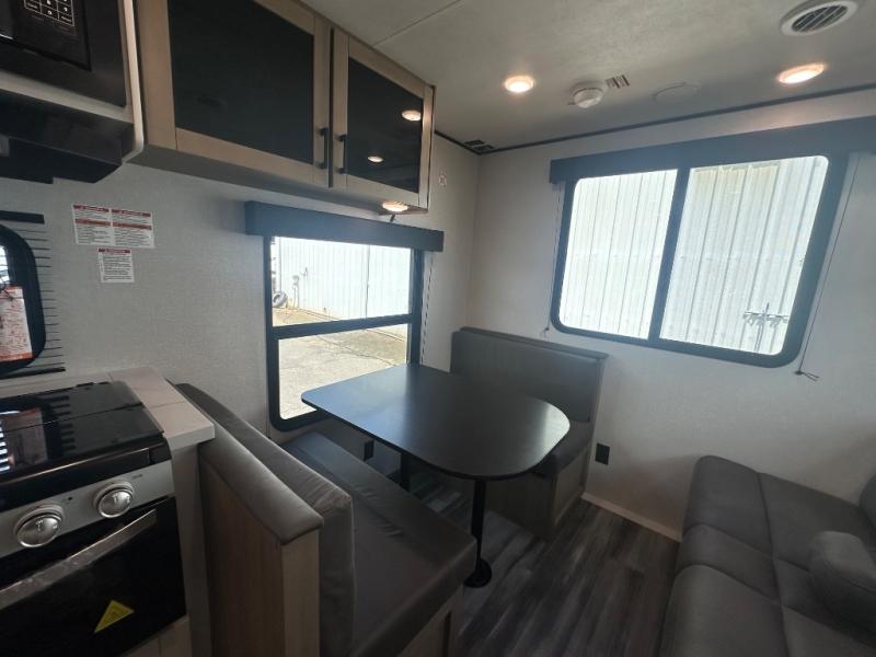 Camping in the woods is just what the doctor ordered and this trailer will provide all the interior comforts you need! There is a three burner cooktop and a microwave oven to prepare meals each day, plus an 8 cu. ft. 12V refrigerator for cold items. After your meal is made, you can dine at the booth dinette or relax on the jack-knife sofa, and these areas can become sleeping space for two to three guests at night. The full bath with a tub/shower means you won't have to use the camp's facilities and the 16' power awning will provide protection from the sun as you visit with other campers!