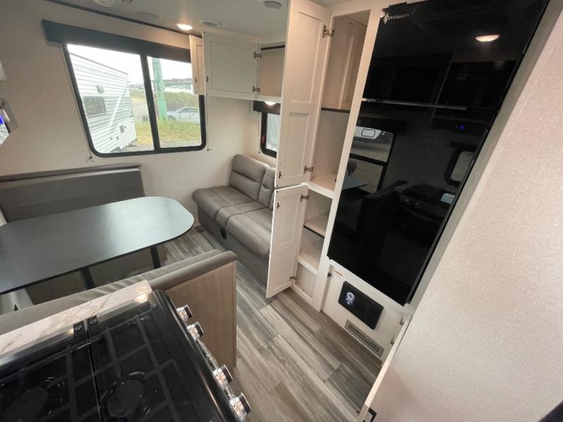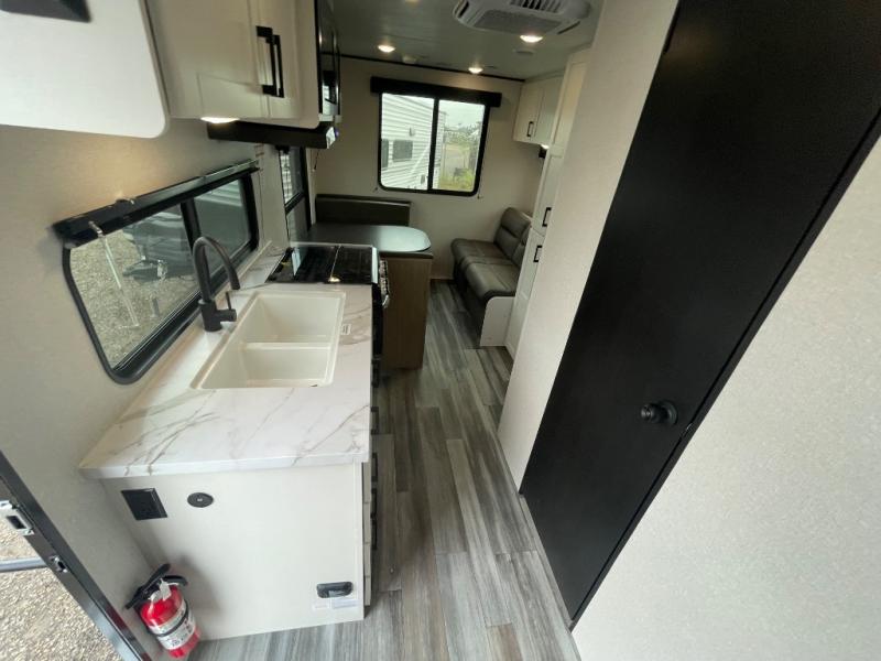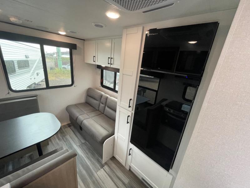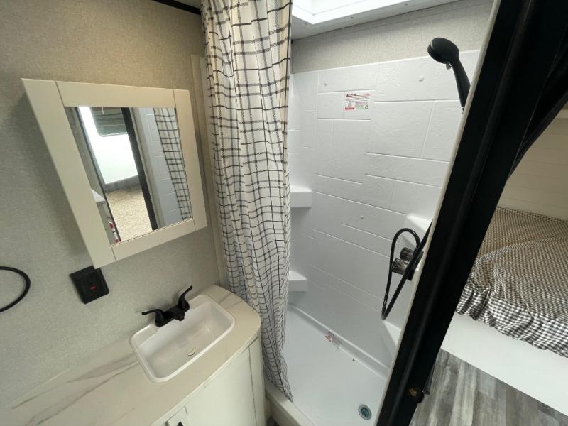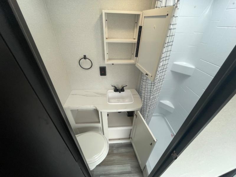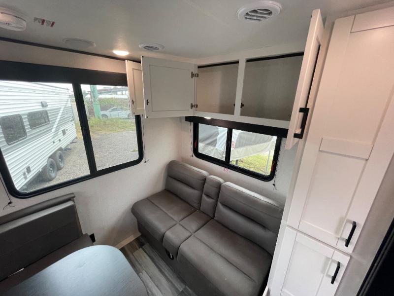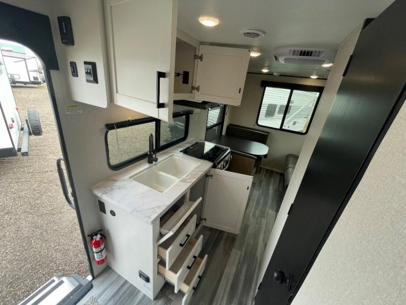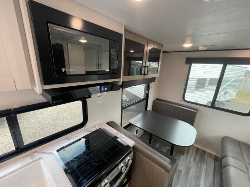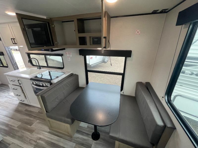 Camping in the woods is just what the doctor ordered and this trailer will provide all the interior comforts you need! There is a three burner cooktop and a microwave oven to prepare meals each day, plus an 8 cu. ft. 12V refrigerator for cold items. After your meal is made, you can dine at the booth dinette or relax on the jack-knife sofa, and these areas can become sleeping space for two to three guests at night. The full bath with a shower means you won't have to use the camp's facilities and the 16' power awning will provide protection from the sun as you visit with other campers!