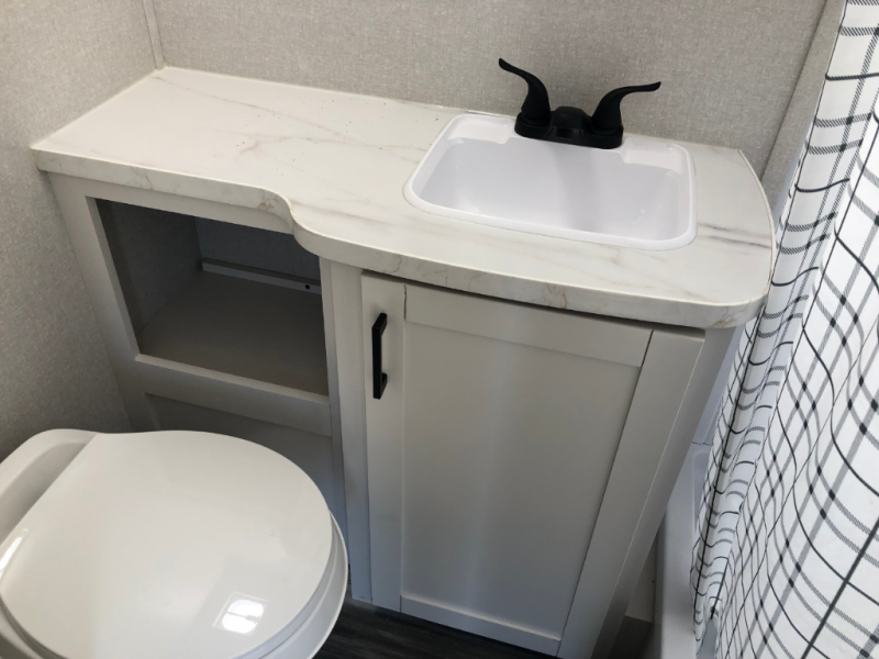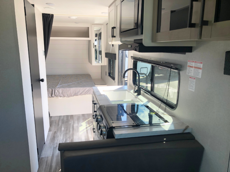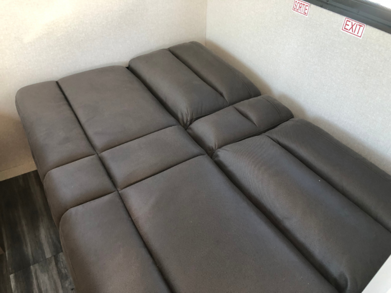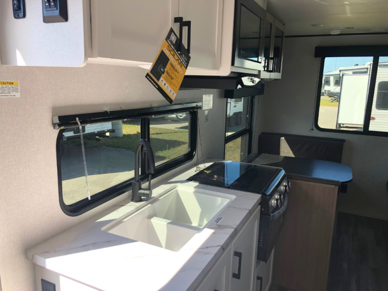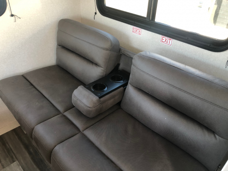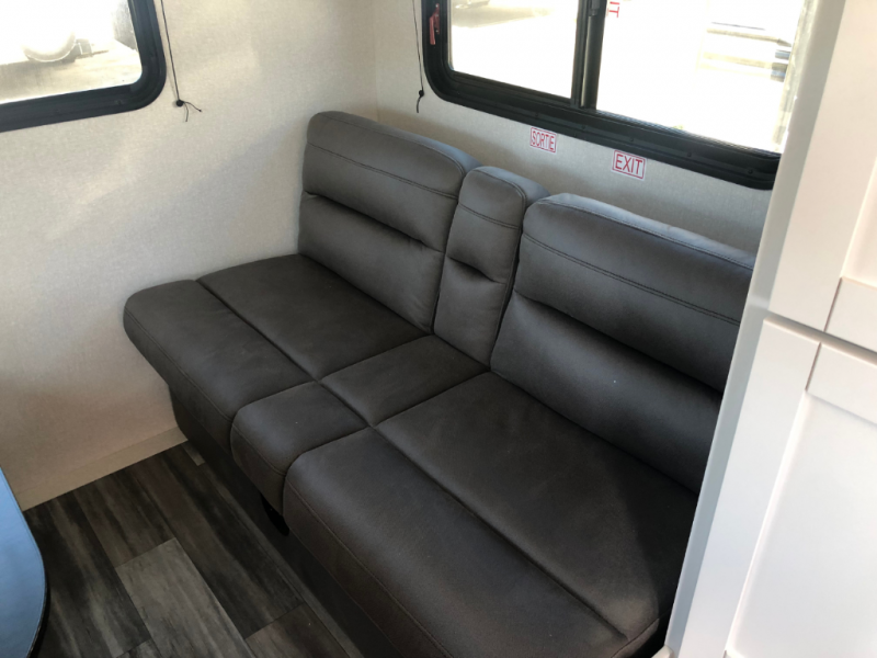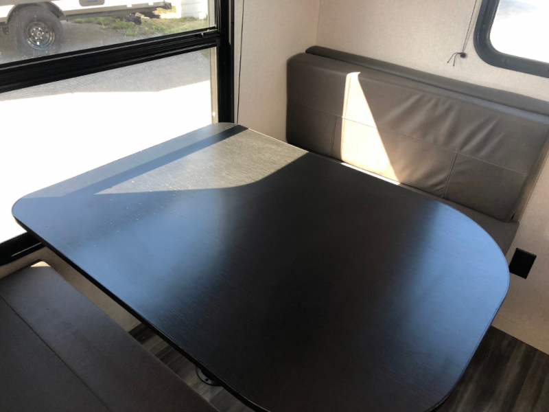 Camping in the woods is just what the doctor ordered and this trailer will provide all the interior comforts you need! There is a three burner cooktop and a microwave oven to prepare meals each day, plus an 8 cu. ft. 12V refrigerator for cold items. After your meal is made, you can dine at the booth dinette or relax on the jack-knife sofa, and these areas can become sleeping space for two to three guests at night. The full bath with a shower means you won't have to use the camp's facilities and the 16' power awning will provide protection from the sun as you visit with other campers!