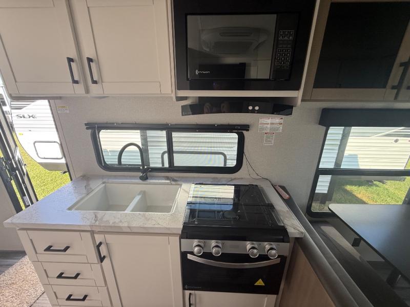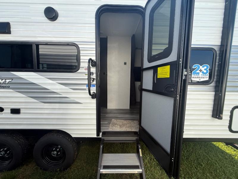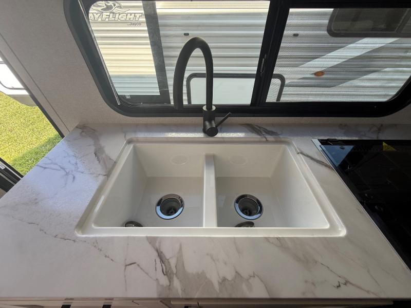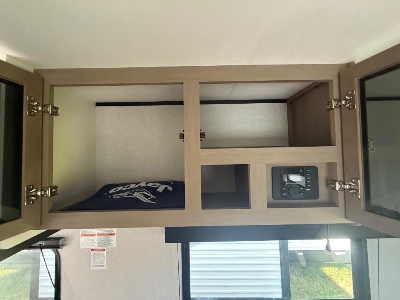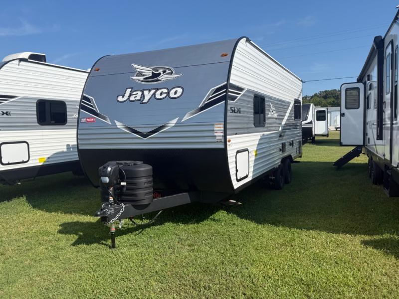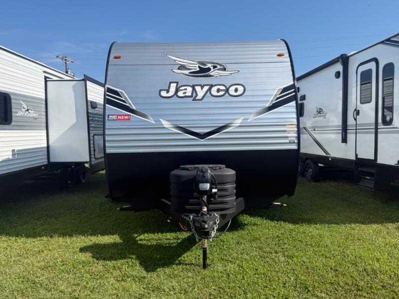 The Jayco Jay Flight SLX travel trailer is quite easy to own because it is lightweight for an easier towing experience. Built on a fully integrated A-frame with galvanized-steel, impact-resistant wheel wells, the Jay Flight SLX has quality at its very foundation. That quality continues on to the electric self-adjusting brakes, easy-lube hubs, Magnum Truss roof system, and LP quick connect. Some of what the mandatory Customer Value Package includes is backup camera prep, Keyed-Alike entry and baggage doors, and an on-demand tankless water heater.