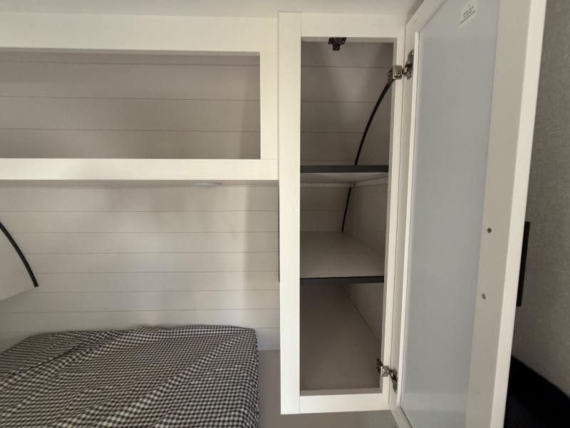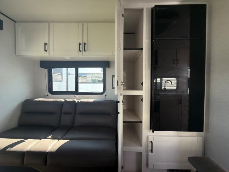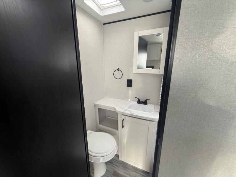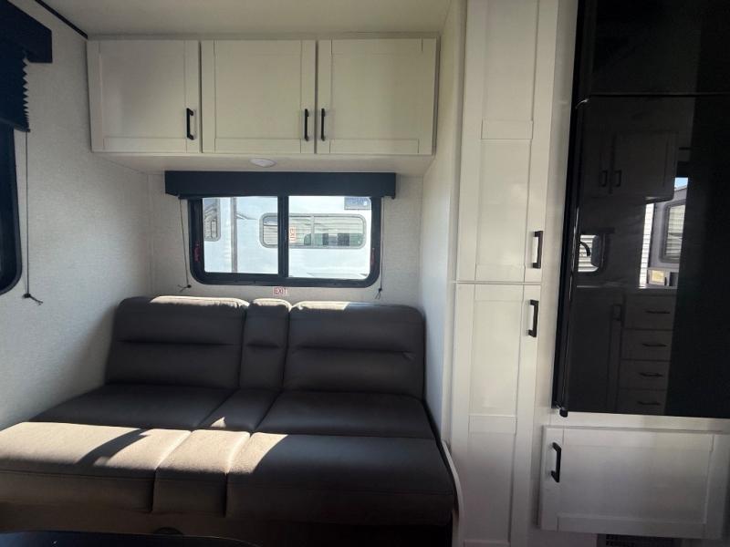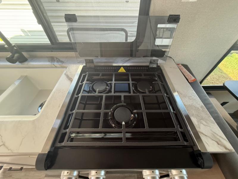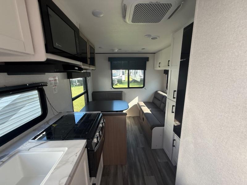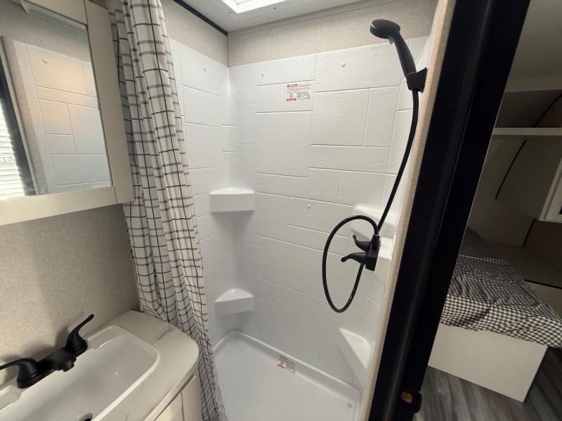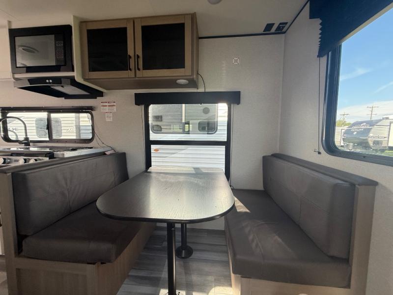Camping in the woods is just what the doctor ordered and this trailer will provide all the interior comforts you need! There is a three burner cooktop and a microwave oven to prepare meals each day, plus an 8 cu. ft. 12V refrigerator for cold items. After your meal is made, you can dine at the booth dinette or relax on the jack-knife sofa, and these areas can become sleeping space for two to three guests at night. The full bath with a shower means you won't have to use the camp's facilities and the 16' power awning will provide protection from the sun as you visit with other campers!