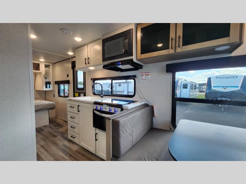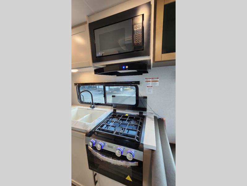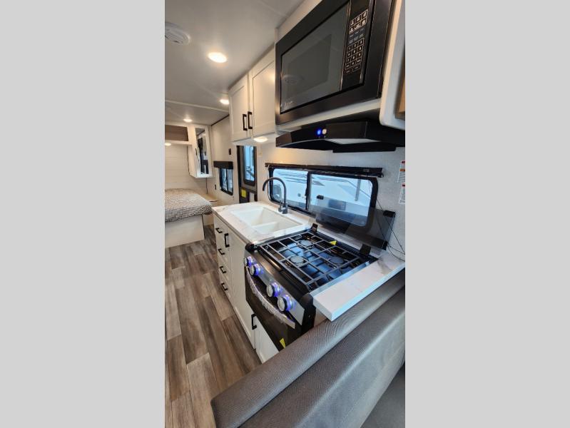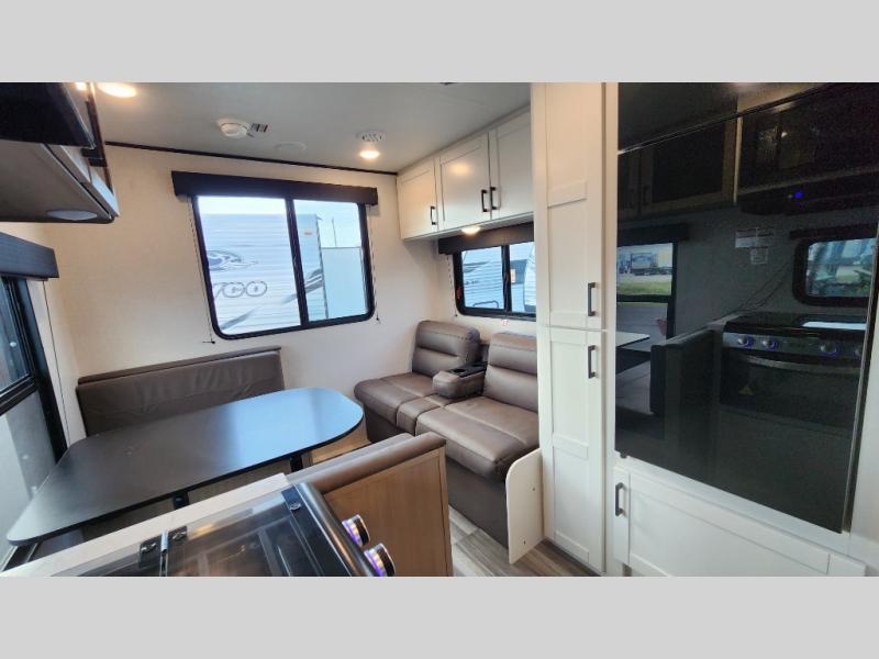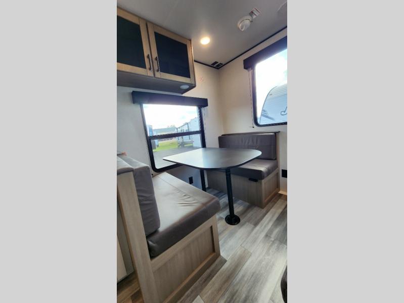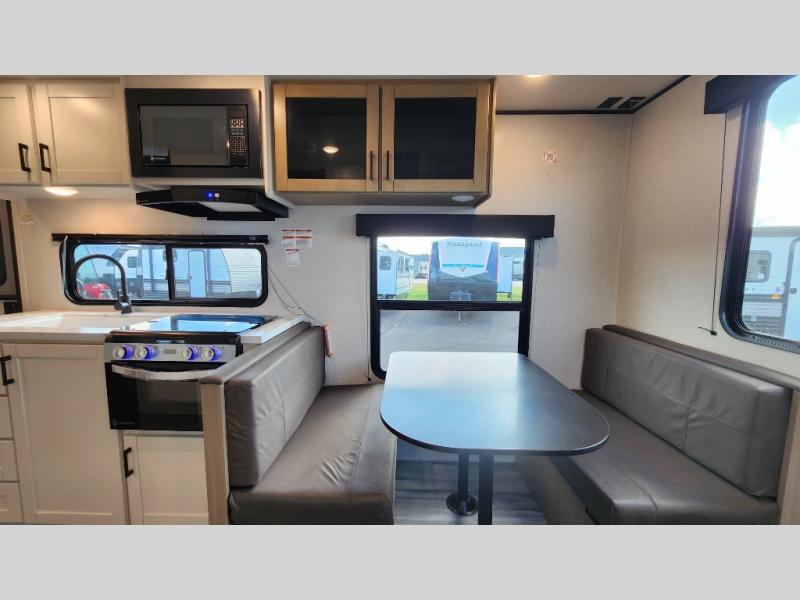 Camping in the woods is just what the doctor ordered and this trailer will provide all the interior comforts you need! There is a three burner cooktop and a microwave oven to prepare meals each day, plus an 8 cu. ft. 12V refrigerator for cold items. After your meal is made, you can dine at the booth dinette or relax on the jack-knife sofa, and these areas can become sleeping space for two to three guests at night. The full bath with a shower means you won't have to use the camp's facilities and the 16' power awning will provide protection from the sun as you visit with other campers!