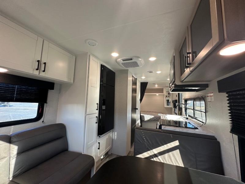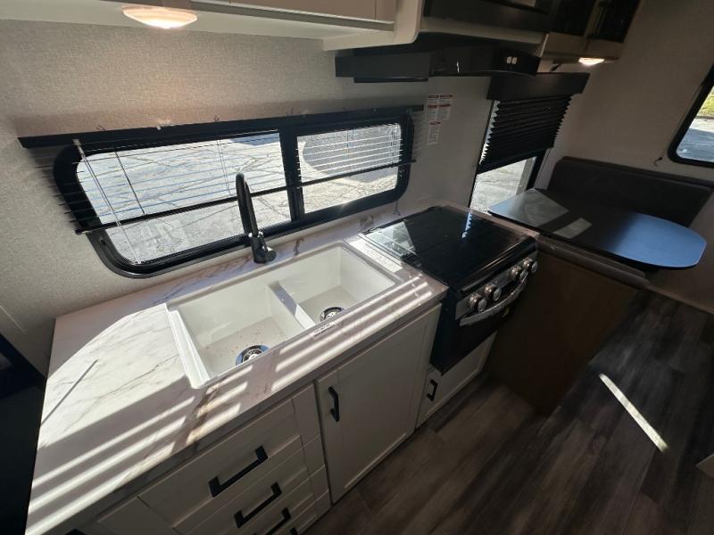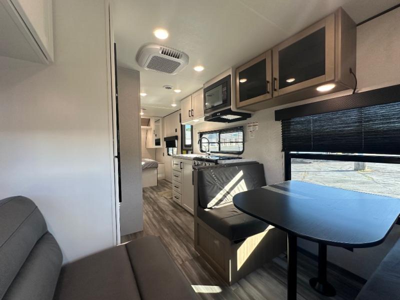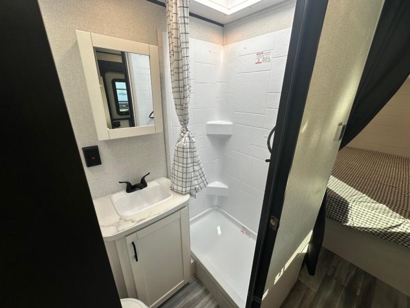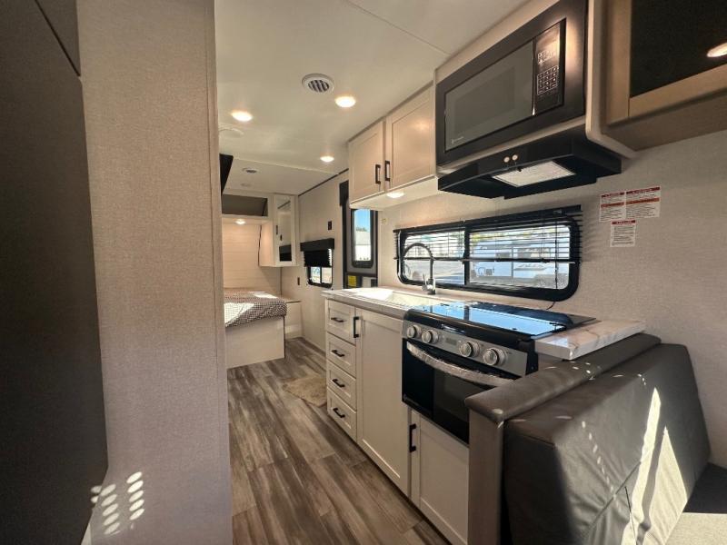 Camping in the woods is just what the doctor ordered and this trailer will provide all the interior comforts you need! There is a three burner cooktop and a microwave oven to prepare meals each day, plus an 8 cu. ft. 12V refrigerator for cold items. After your meal is made, you can dine at the booth dinette or relax on the jack-knife sofa, and these areas can become sleeping space for two to three guests at night. The full bath with a shower means you won't have to use the camp's facilities and the 16' power awning will provide protection from the sun as you visit with other campers!