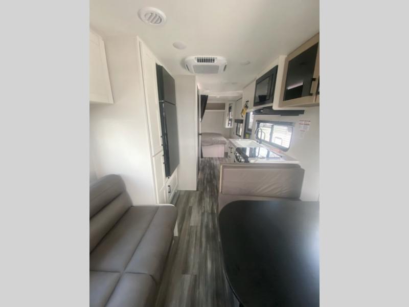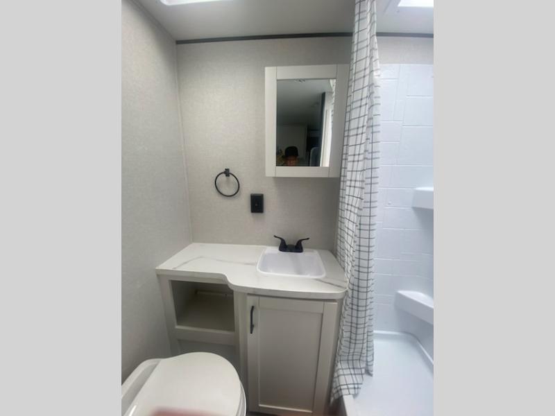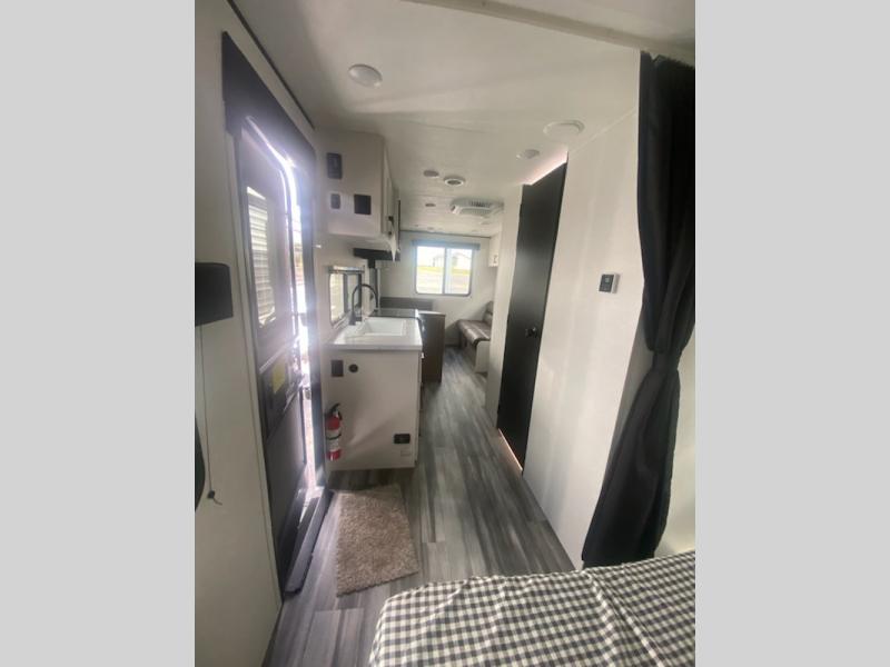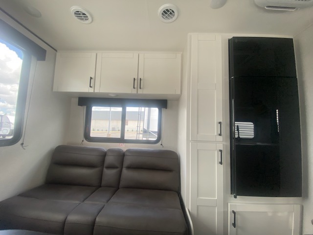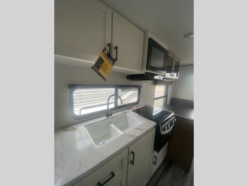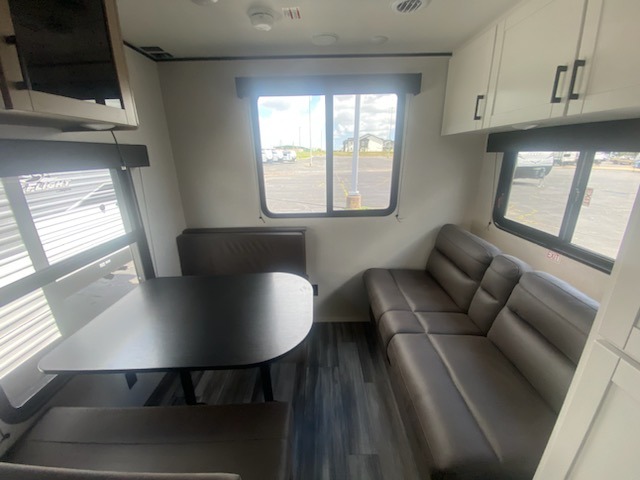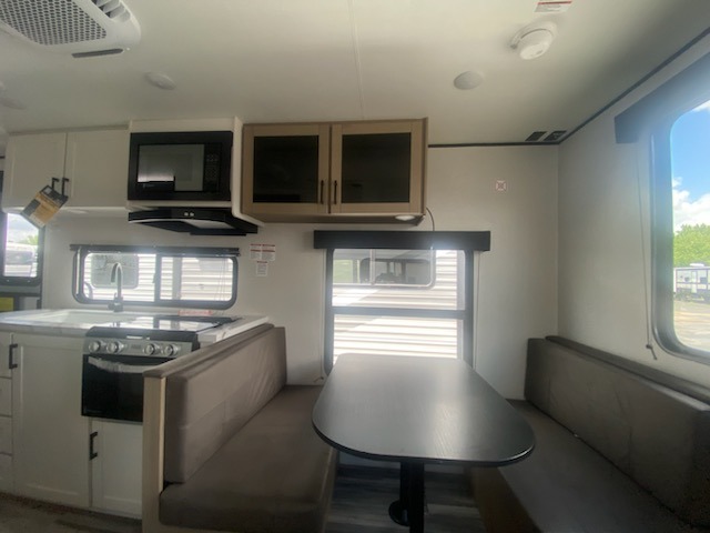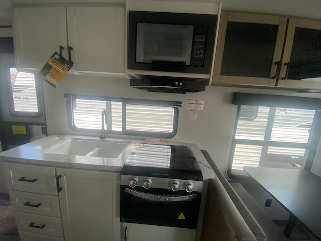 Camping in the woods is just what the doctor ordered and this trailer will provide all the interior comforts you need! There is a three burner cooktop and a microwave oven to prepare meals each day, plus an 8 cu. ft. 12V refrigerator for cold items. After your meal is made, you can dine at the booth dinette or relax on the jack-knife sofa, and these areas can become sleeping space for two to three guests at night. The full bath with a shower means you won't have to use the camp's facilities and the 16' power awning will provide protection from the sun as you visit with other campers!