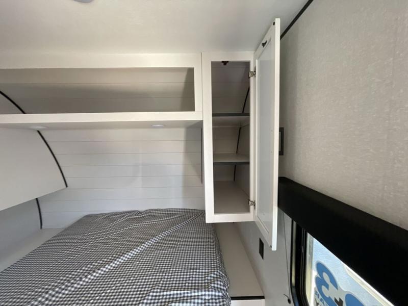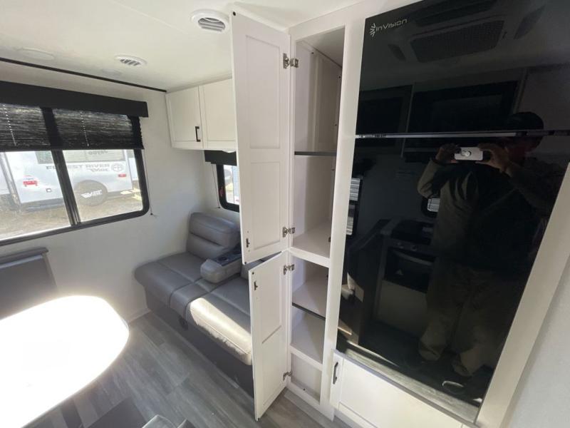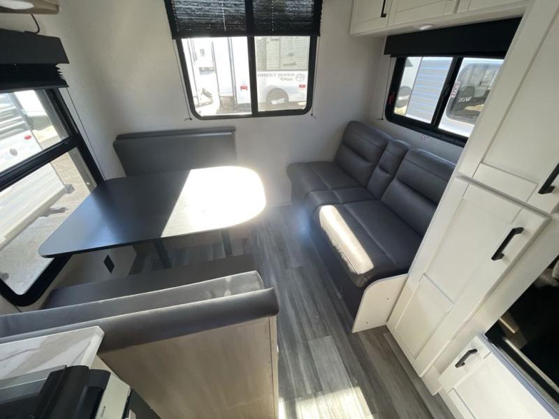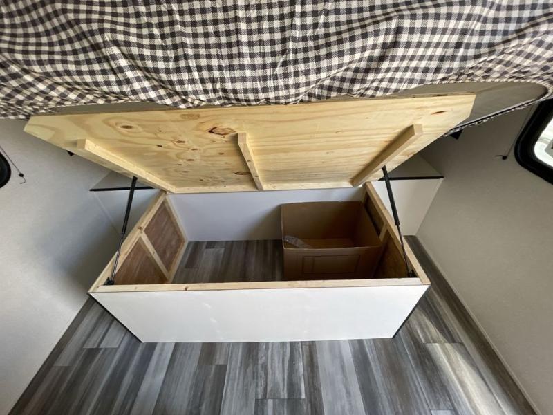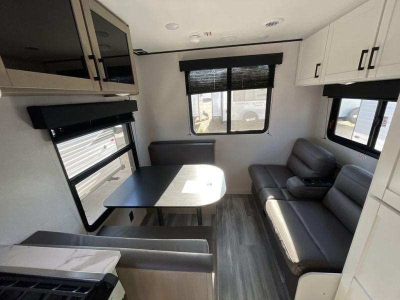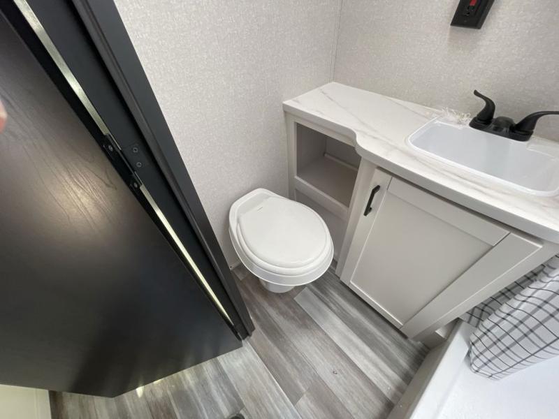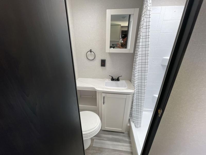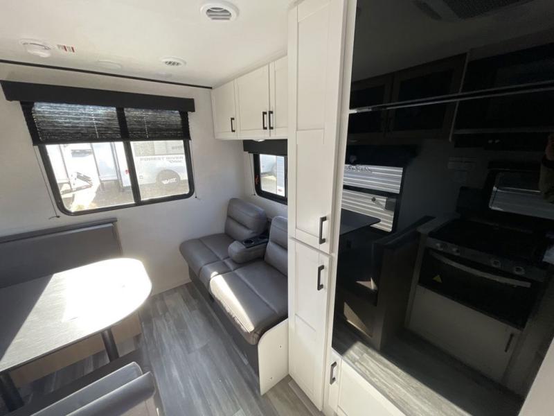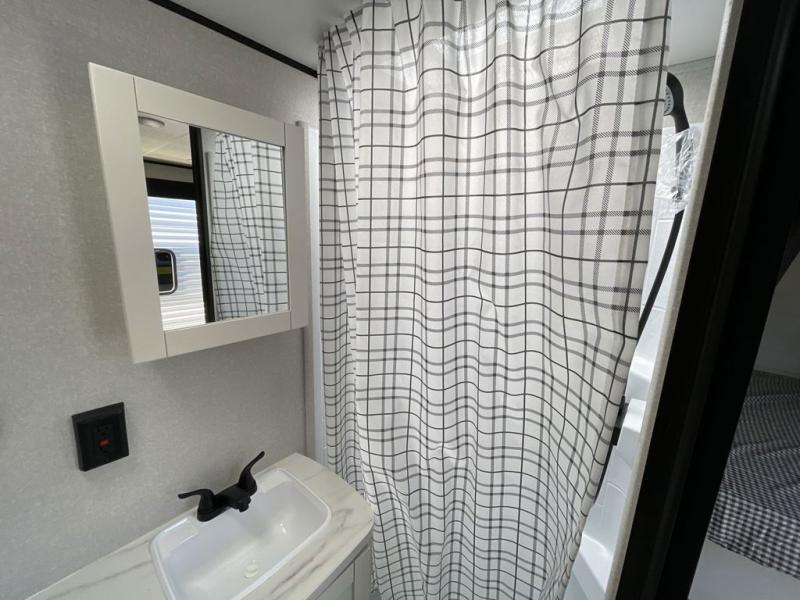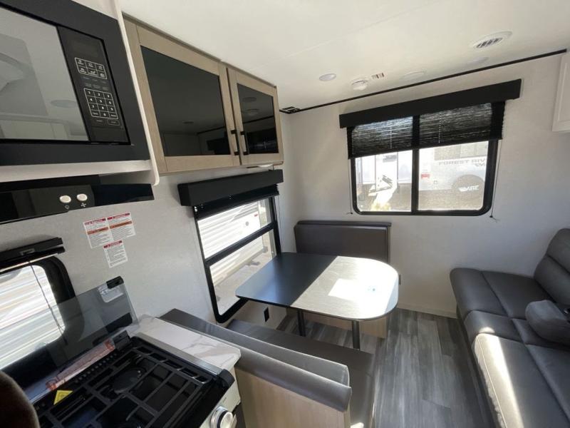 Camping in the woods is just what the doctor ordered and this trailer will provide all the interior comforts you need! There is a three burner cooktop and a microwave oven to prepare meals each day, plus an 8 cu. ft. 12V refrigerator for cold items. After your meal is made, you can dine at the booth dinette or relax on the jack-knife sofa, and these areas can become sleeping space for two to three guests at night. The full bath with a shower means you won't have to use the camp's facilities and the 16' power awning will provide protection from the sun as you visit with other campers!