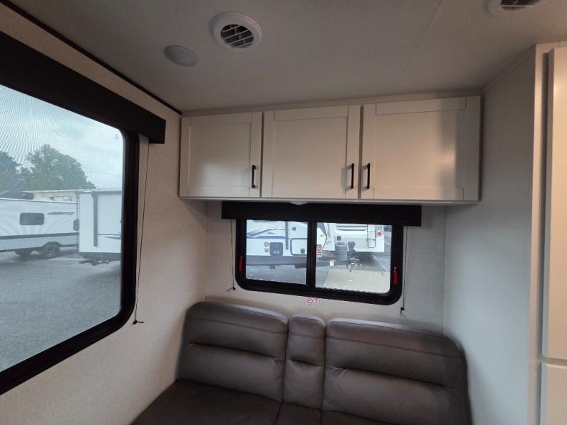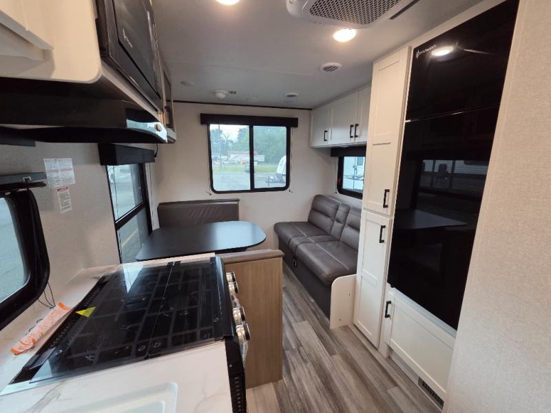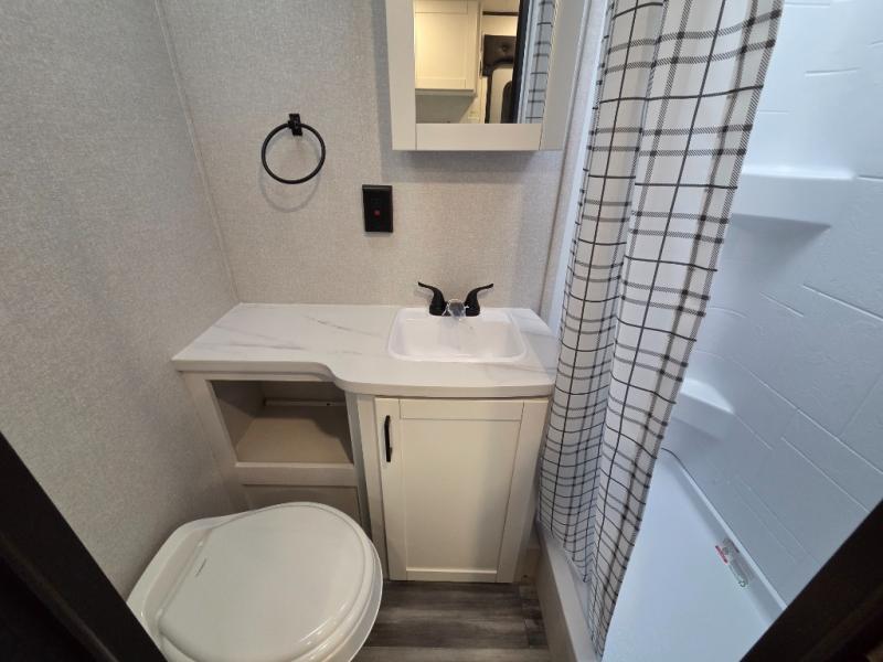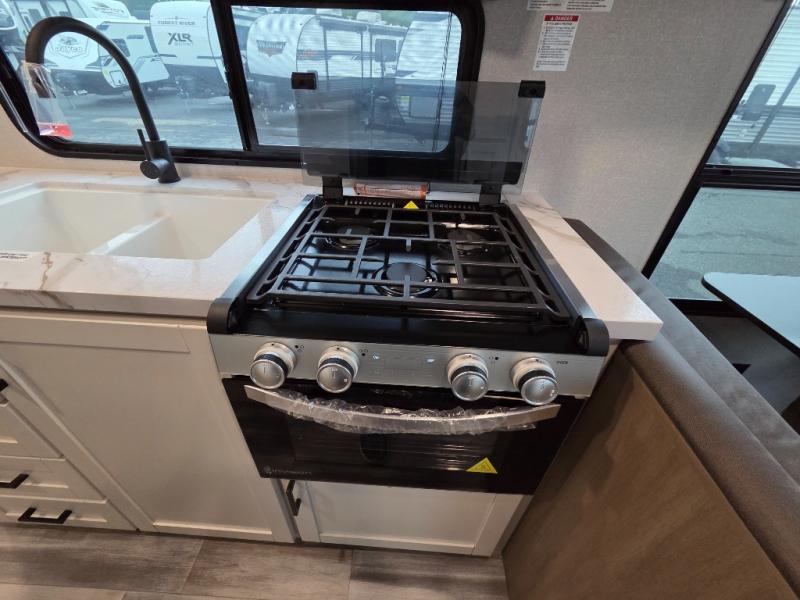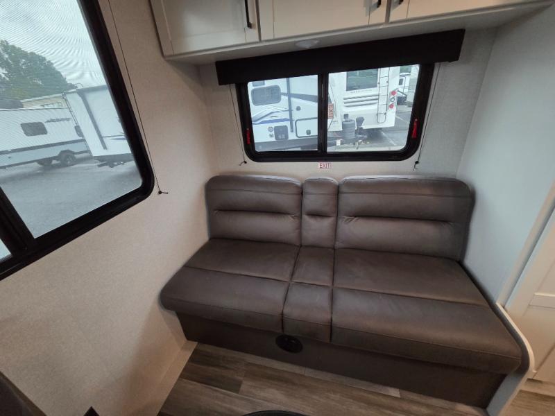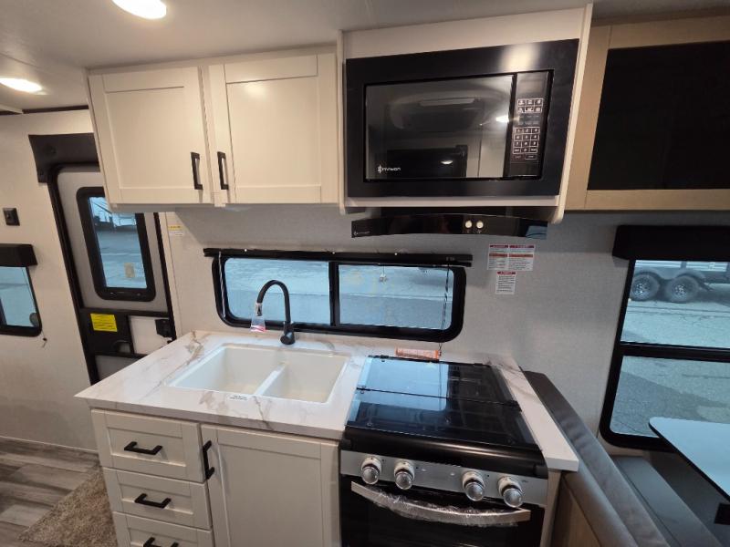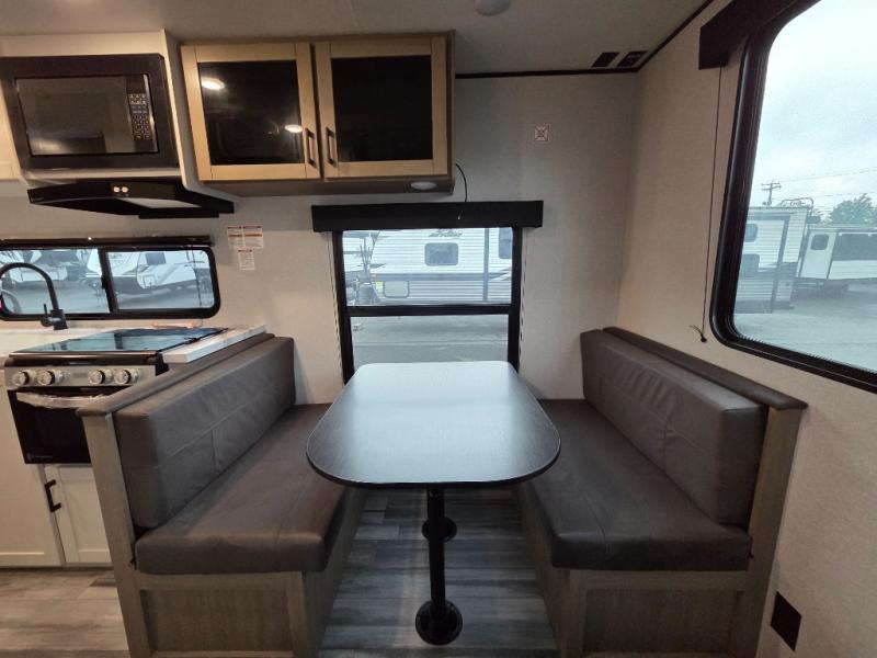 Camping in the woods is just what the doctor ordered and this trailer will provide all the interior comforts you need! There is a three burner cooktop and a microwave oven to prepare meals each day, plus an 8 cu. ft. 12V refrigerator for cold items. After your meal is made, you can dine at the booth dinette or relax on the jack-knife sofa, and these areas can become sleeping space for two to three guests at night. The full bath with a shower means you won't have to use the camp's facilities and the 16' power awning will provide protection from the sun as you visit with other campers!