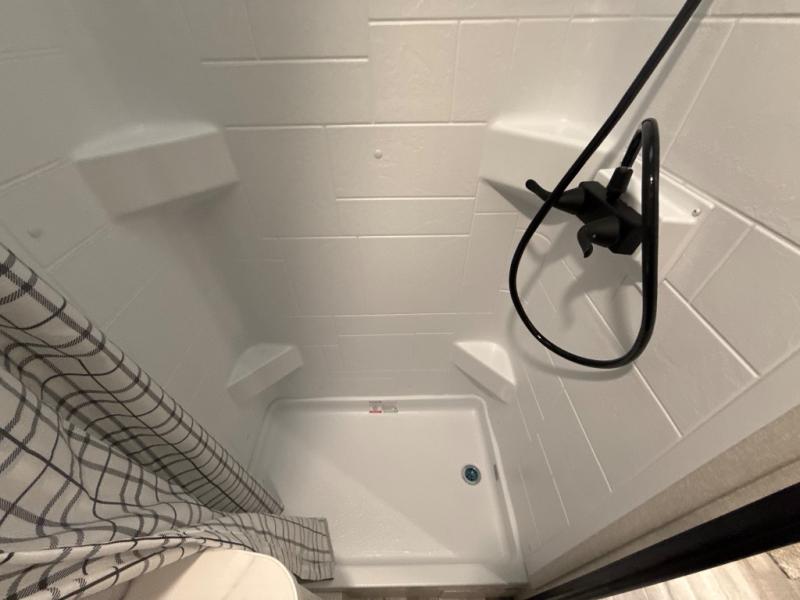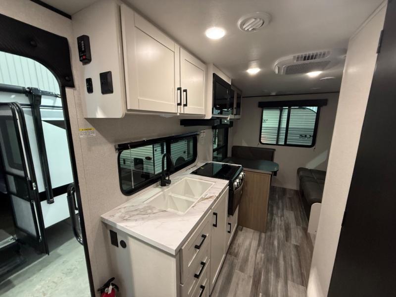 Camping in the woods is just what the doctor ordered and this trailer will provide all the interior comforts you need! There is a three burner cooktop and a microwave oven to prepare meals each day, plus an 8 cu. ft. 12V refrigerator for cold items. After your meal is made, you can dine at the booth dinette or relax on the jack-knife sofa, and these areas can become sleeping space for two to three guests at night. The full bath with a shower means you won't have to use the camp's facilities and the 16' power awning will provide protection from the sun as you visit with other campers!