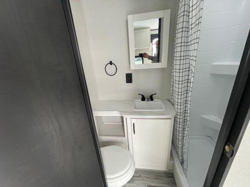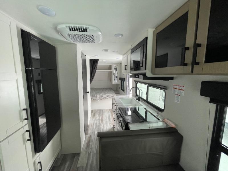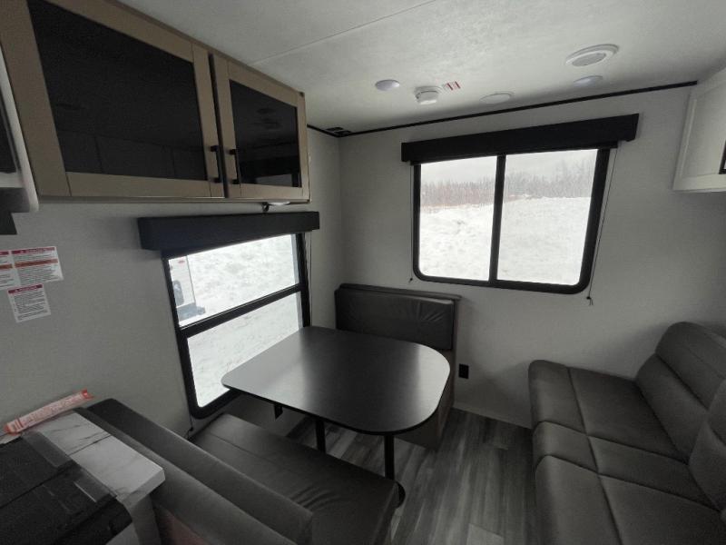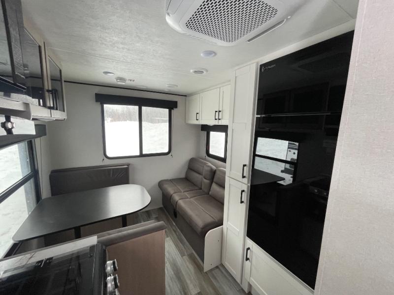 Camping in the woods is just what the doctor ordered and this trailer will provide all the interior comforts you need! There is a three burner cooktop and a microwave oven to prepare meals each day, plus an 8 cu. ft. 12V refrigerator for cold items. After your meal is made, you can dine at the booth dinette or relax on the jack-knife sofa, and these areas can become sleeping space for two to three guests at night. The full bath with a shower means you won't have to use the camp's facilities and the 16' power awning will provide protection from the sun as you visit with other campers!