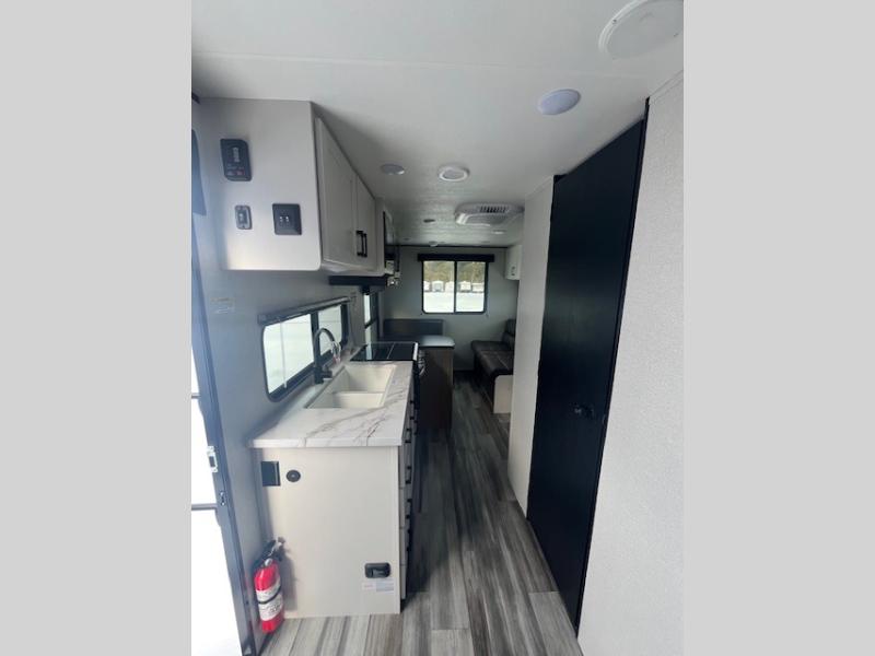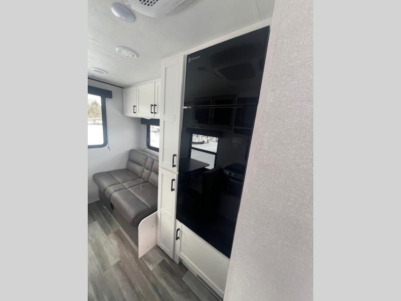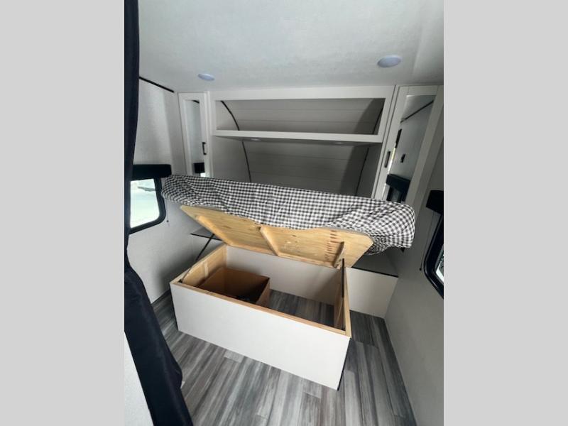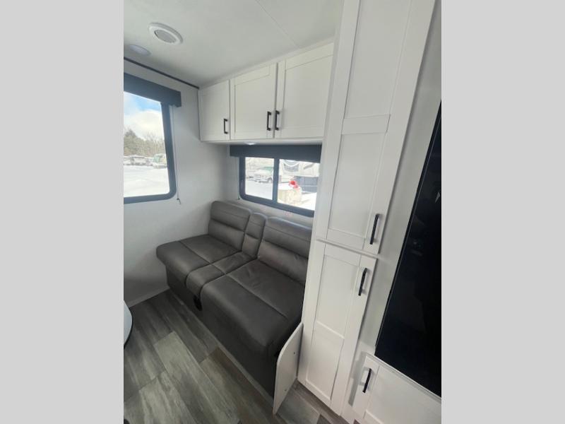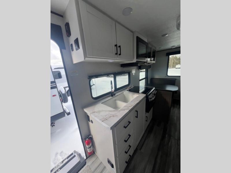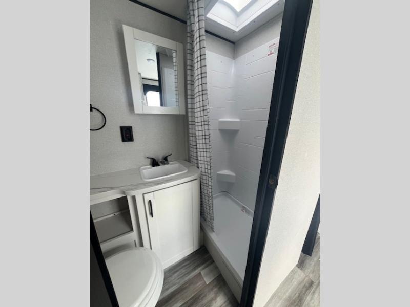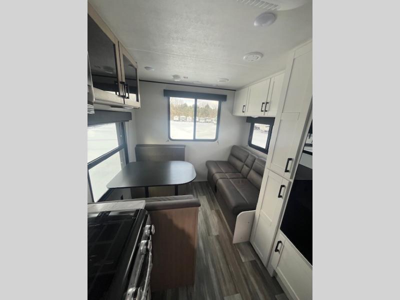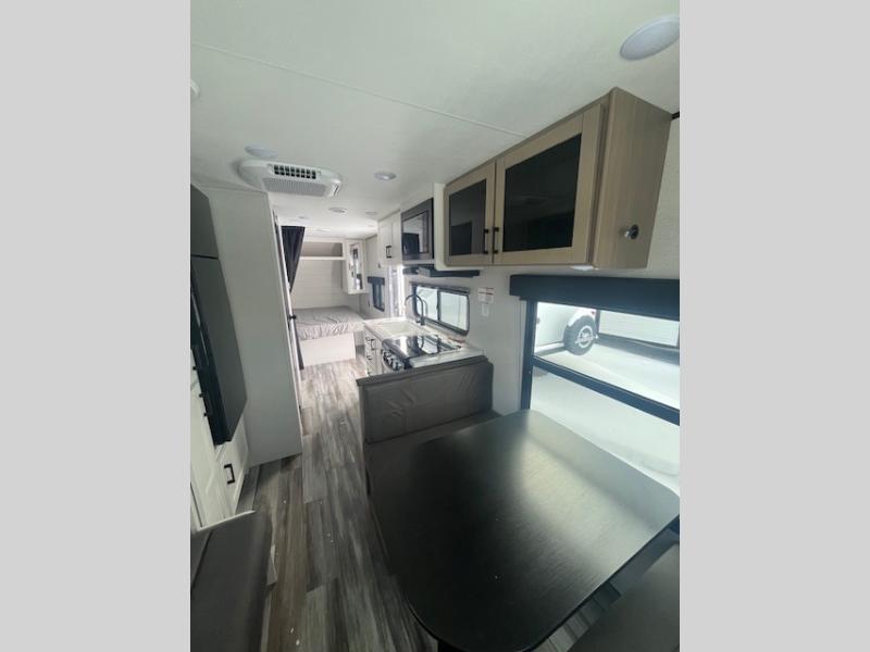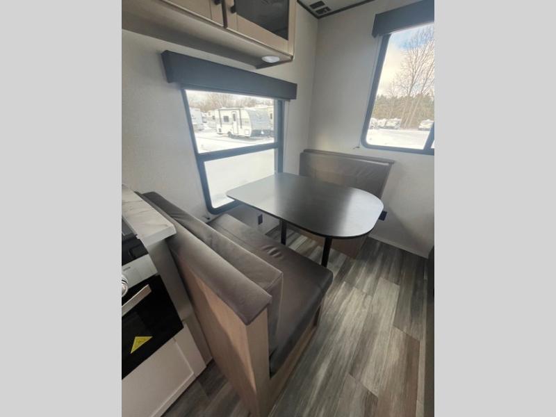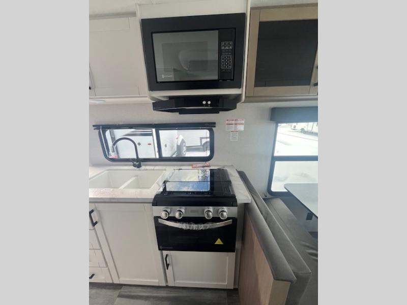 Camping in the woods is just what the doctor ordered and this trailer will provide all the interior comforts you need! There is a three burner cooktop and a microwave oven to prepare meals each day, plus an 8 cu. ft. 12V refrigerator for cold items. After your meal is made, you can dine at the booth dinette or relax on the jack-knife sofa, and these areas can become sleeping space for two to three guests at night. The full bath with a shower means you won't have to use the camp's facilities and the 16' power awning will provide protection from the sun as you visit with other campers!