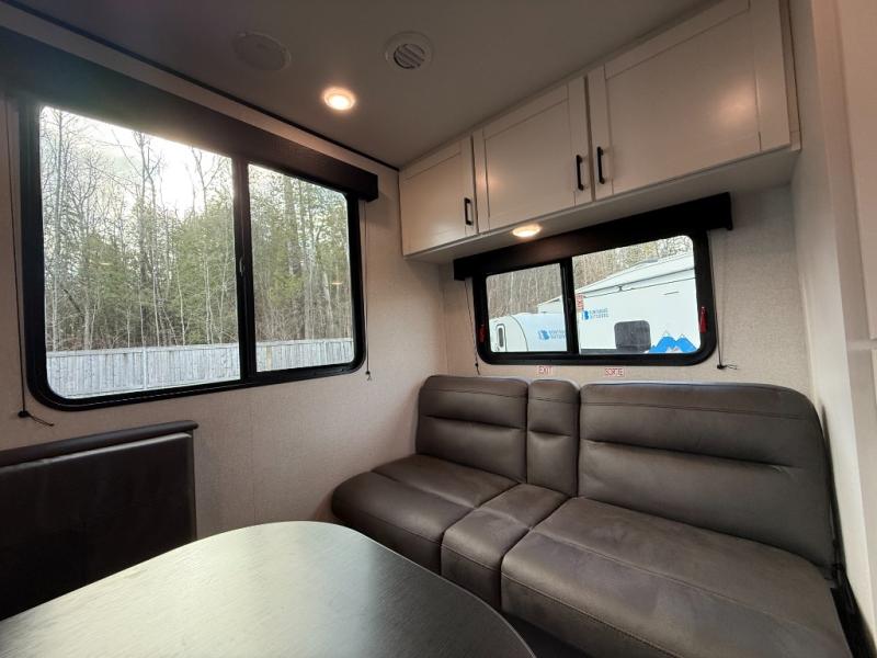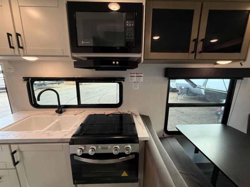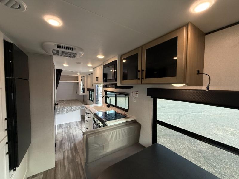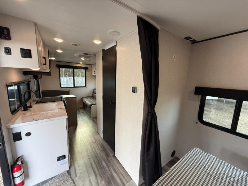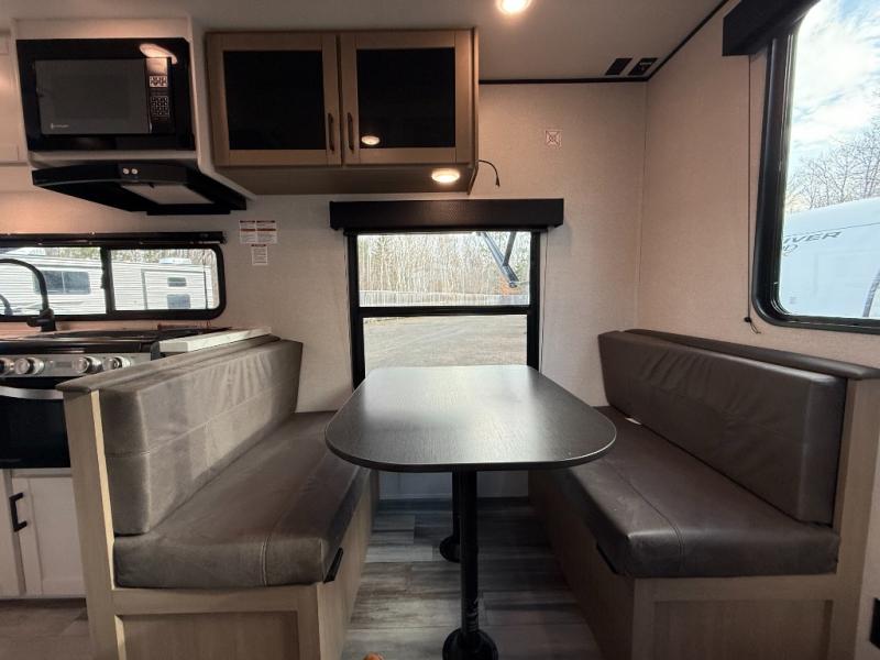 Camping in the woods is just what the doctor ordered and this trailer will provide all the interior comforts you need! There is a three burner cooktop and a microwave oven to prepare meals each day, plus an 8 cu. ft. 12V refrigerator for cold items. After your meal is made, you can dine at the booth dinette or relax on the jack-knife sofa, and these areas can become sleeping space for two to three guests at night. The full bath with a shower means you won't have to use the camp's facilities and the 16' power awning will provide protection from the sun as you visit with other campers!