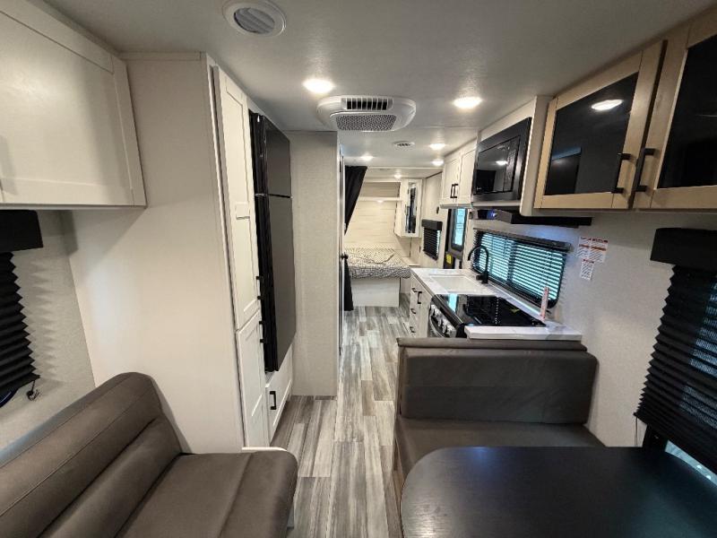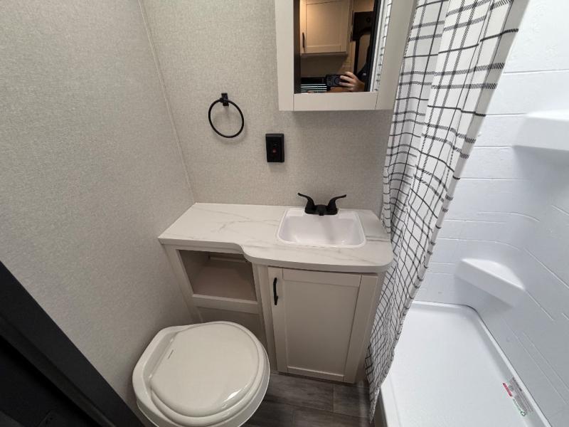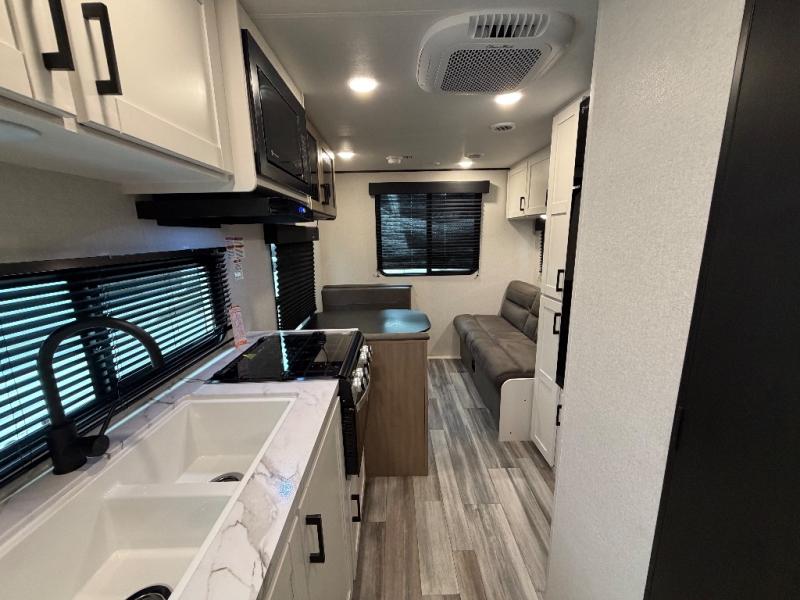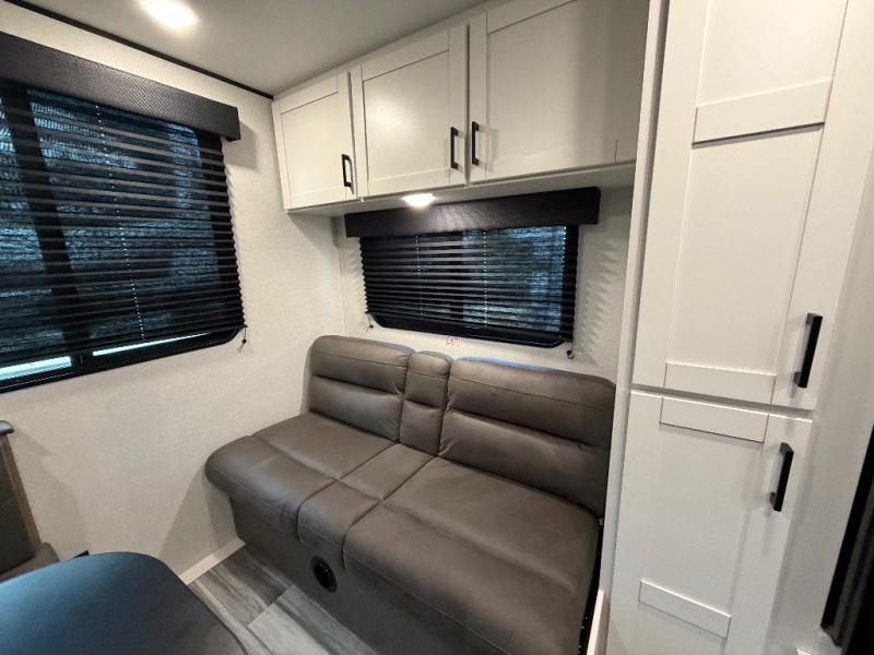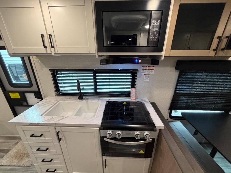 Camping in the woods is just what the doctor ordered and this trailer will provide all the interior comforts you need! There is a three burner cooktop and a microwave oven to prepare meals each day, plus an 8 cu. ft. 12V refrigerator for cold items. After your meal is made, you can dine at the booth dinette or relax on the jack-knife sofa, and these areas can become sleeping space for two to three guests at night. The full bath with a shower means you won't have to use the camp's facilities and the 16' power awning will provide protection from the sun as you visit with other campers!
