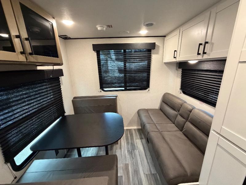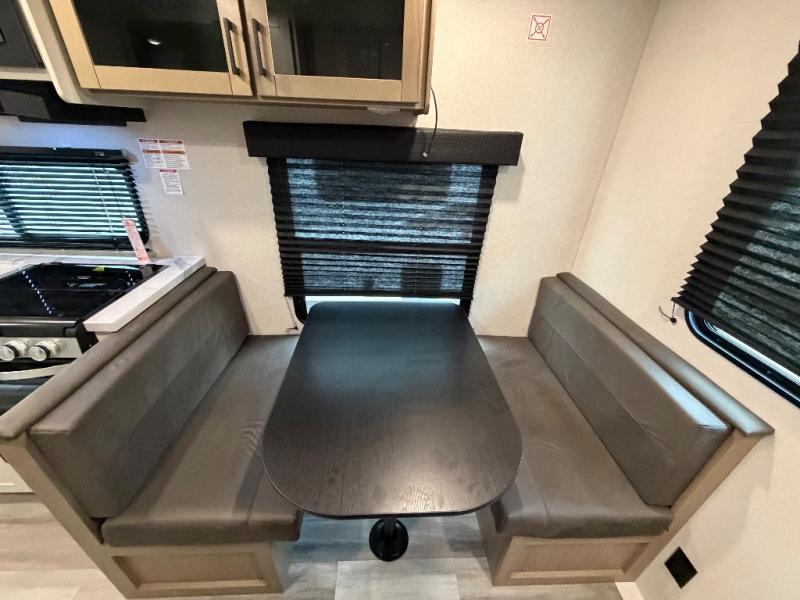 Camping in the woods is just what the doctor ordered and this trailer will provide all the interior comforts you need! There is a three burner cooktop and a microwave oven to prepare meals each day, plus an 8 cu. ft. 12V refrigerator for cold items. After your meal is made, you can dine at the booth dinette or relax on the jack-knife sofa, and these areas can become sleeping space for two to three guests at night. The full bath with a shower means you won't have to use the camp's facilities and the 16' power awning will provide protection from the sun as you visit with other campers!