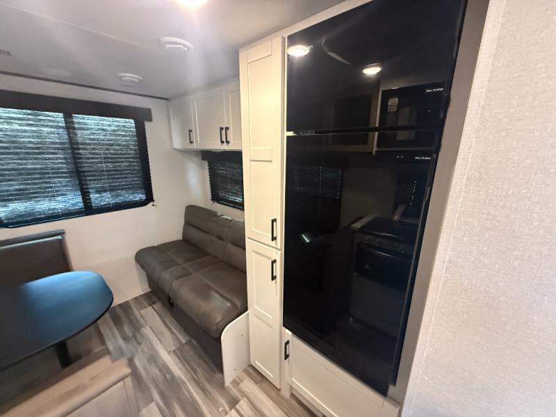Camping in the woods is just what the doctor ordered and this trailer will provide all the interior comforts you need! There is a three burner cooktop and a microwave oven to prepare meals each day, plus an 8 cu. ft. 12V refrigerator for cold items. After your meal is made, you can dine at the booth dinette or relax on the jack-knife sofa, and these areas can become sleeping space for two to three guests at night. The full bath with a shower means you won't have to use the camp's facilities and the 16' power awning will provide protection from the sun as you visit with other campers!