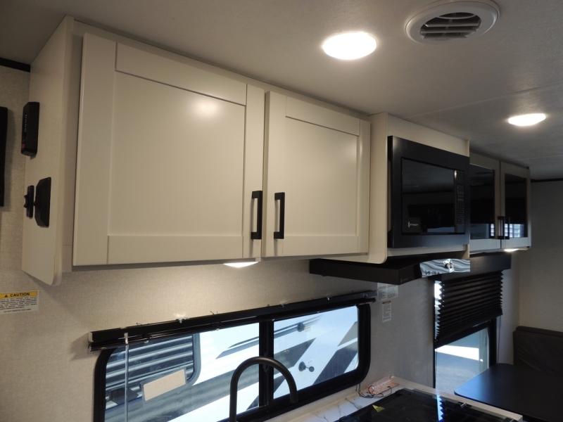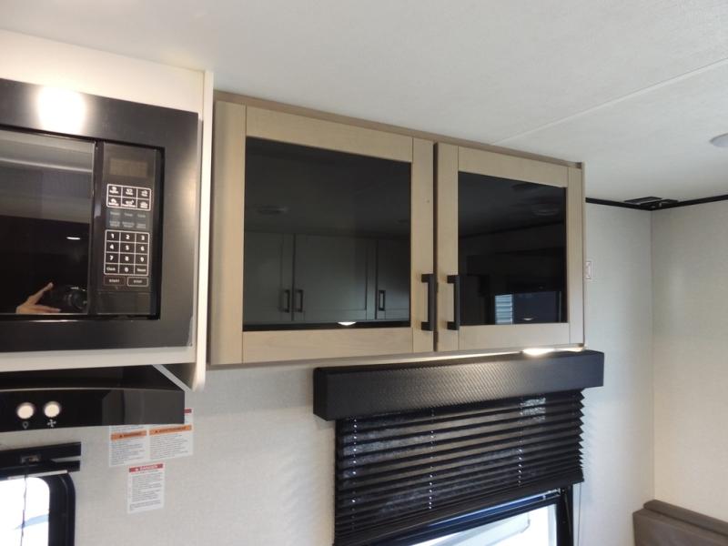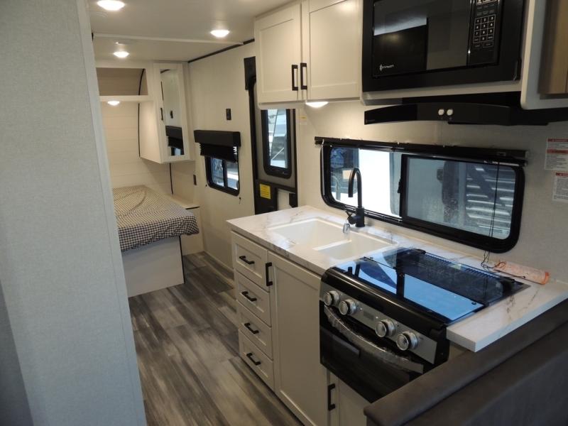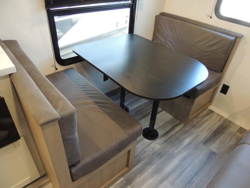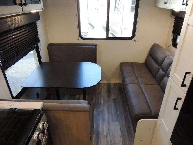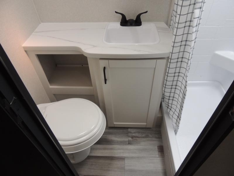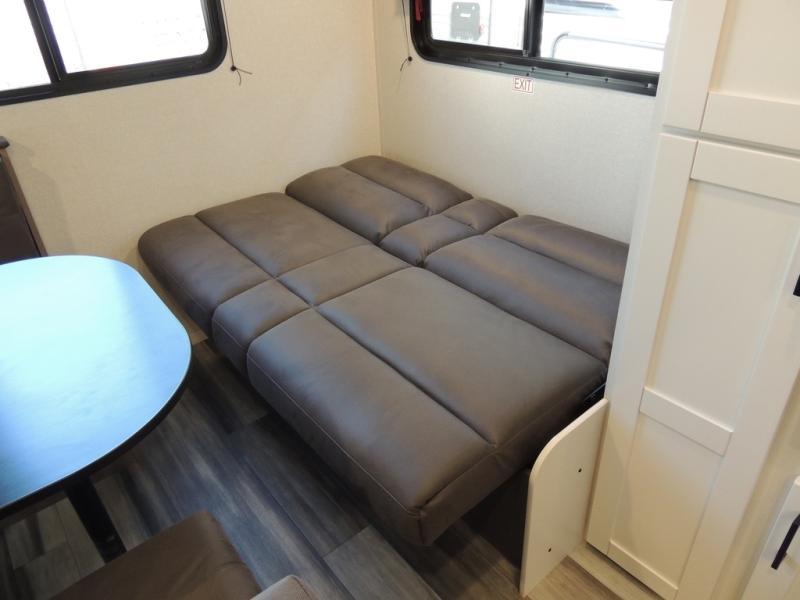 Camping in the woods is just what the doctor ordered and this trailer will provide all the interior comforts you need! There is a three burner cooktop and a microwave oven to prepare meals each day, plus an 8 cu. ft. 12V refrigerator for cold items. After your meal is made, you can dine at the booth dinette or relax on the jack-knife sofa, and these areas can become sleeping space for two to three guests at night. The full bath with a shower means you won't have to use the camp's facilities and the 16' power awning will provide protection from the sun as you visit with other campers!