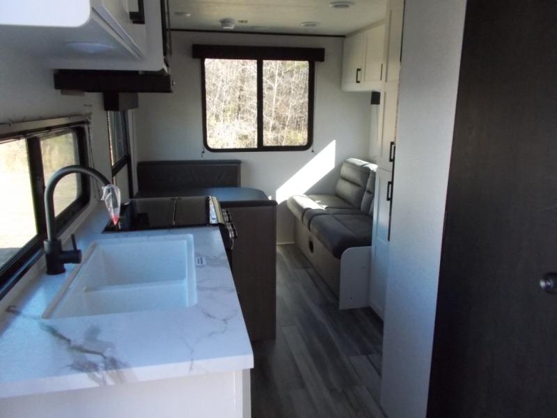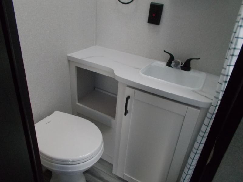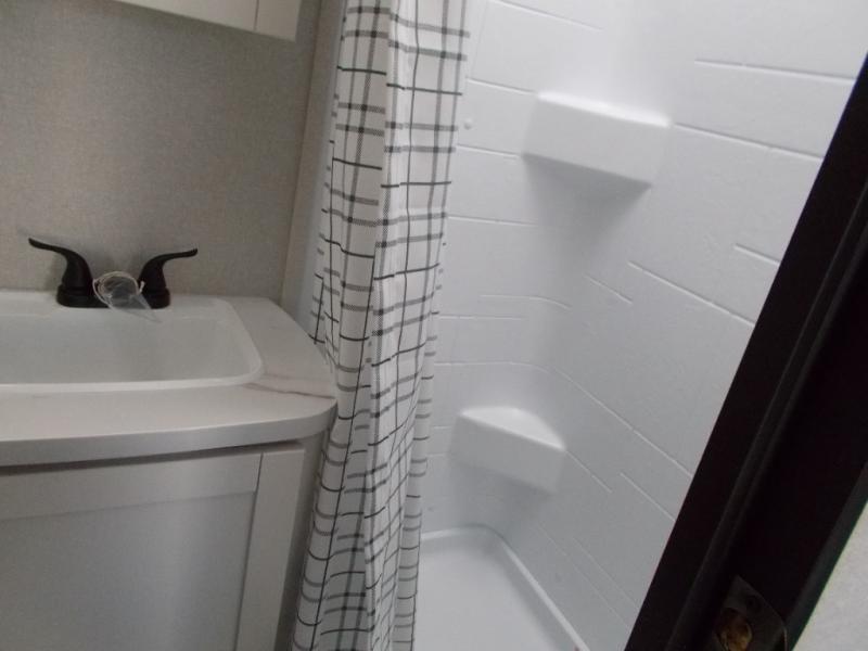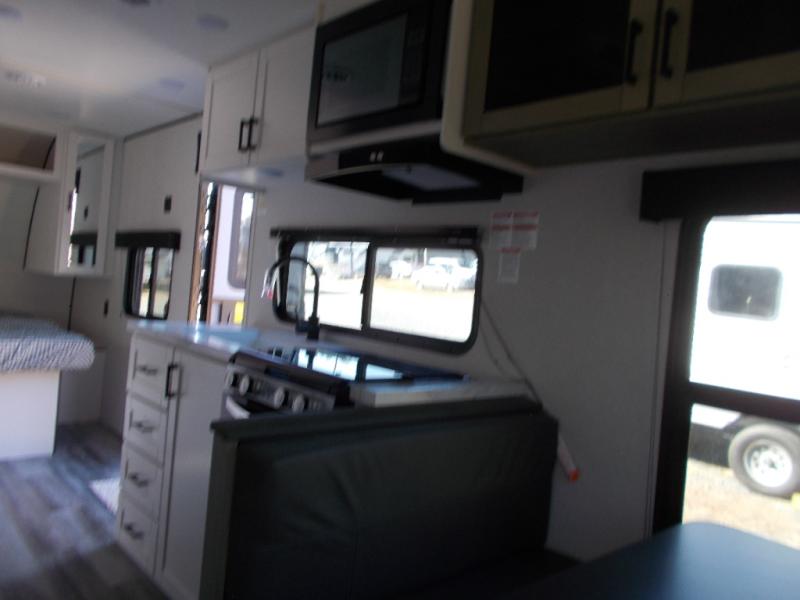 Camping in the woods is just what the doctor ordered and this trailer will provide all the interior comforts you need! There is a three burner cooktop and a microwave oven to prepare meals each day, plus an 8 cu. ft. 12V refrigerator for cold items. After your meal is made, you can dine at the booth dinette or relax on the jack-knife sofa, and these areas can become sleeping space for two to three guests at night. The full bath with a shower means you won't have to use the camp's facilities and the 16' power awning will provide protection from the sun as you visit with other campers!