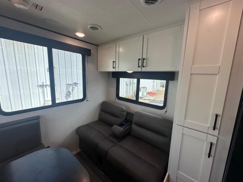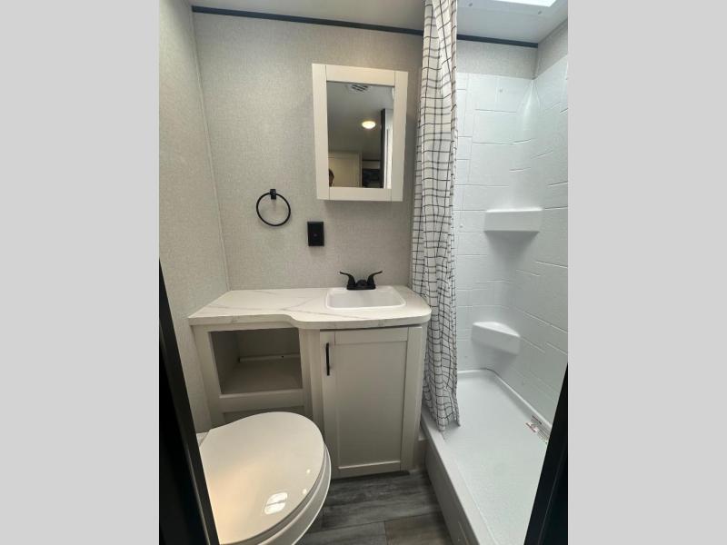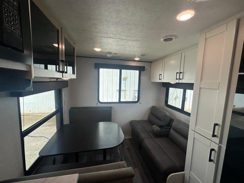 Camping in the woods is just what the doctor ordered and this trailer will provide all the interior comforts you need! There is a three burner cooktop and a microwave oven to prepare meals each day, plus an 8 cu. ft. 12V refrigerator for cold items. After your meal is made, you can dine at the booth dinette or relax on the jack-knife sofa, and these areas can become sleeping space for two to three guests at night. The full bath with a shower means you won't have to use the camp's facilities and the 16' power awning will provide protection from the sun as you visit with other campers!