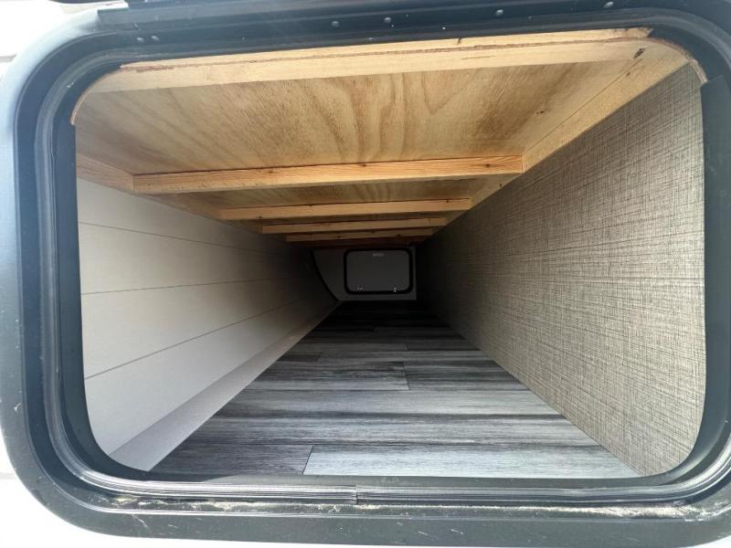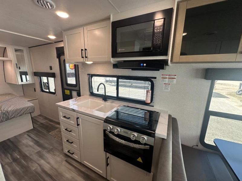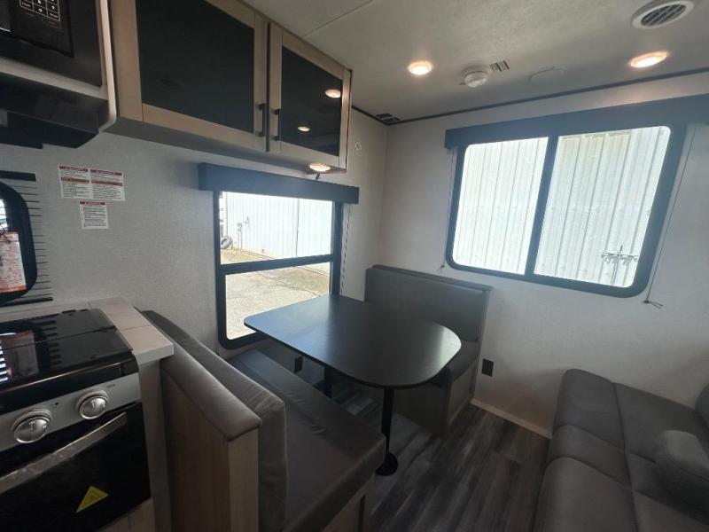 Camping in the woods is just what the doctor ordered and this trailer will provide all the interior comforts you need! There is a three burner cooktop and a microwave oven to prepare meals each day, plus an 8 cu. ft. 12V refrigerator for cold items. After your meal is made, you can dine at the booth dinette or relax on the jack-knife sofa, and these areas can become sleeping space for two to three guests at night. The full bath with a shower means you won't have to use the camp's facilities and the 16' power awning will provide protection from the sun as you visit with other campers!
