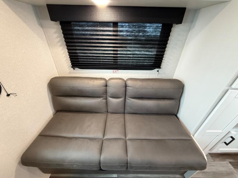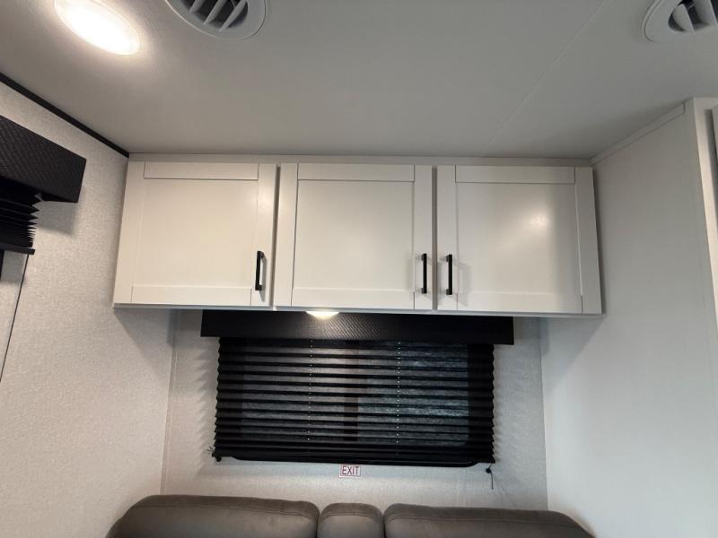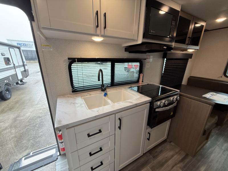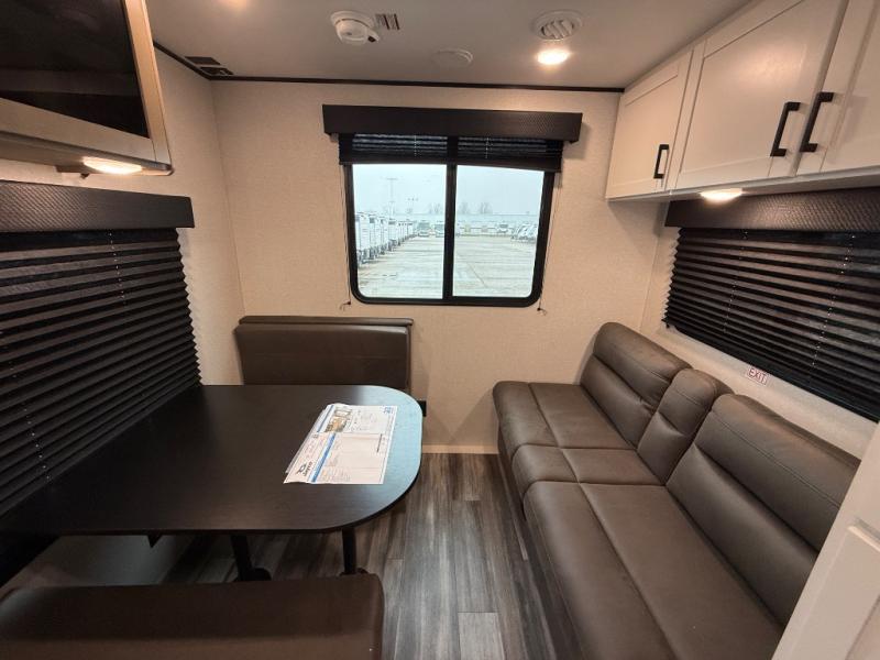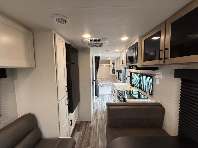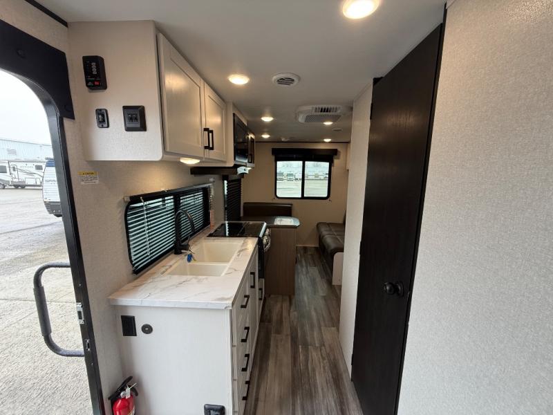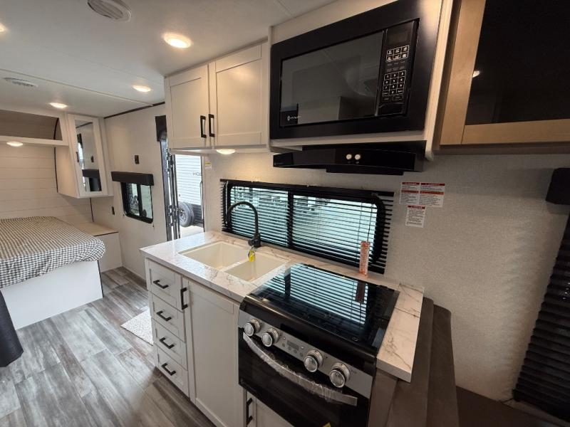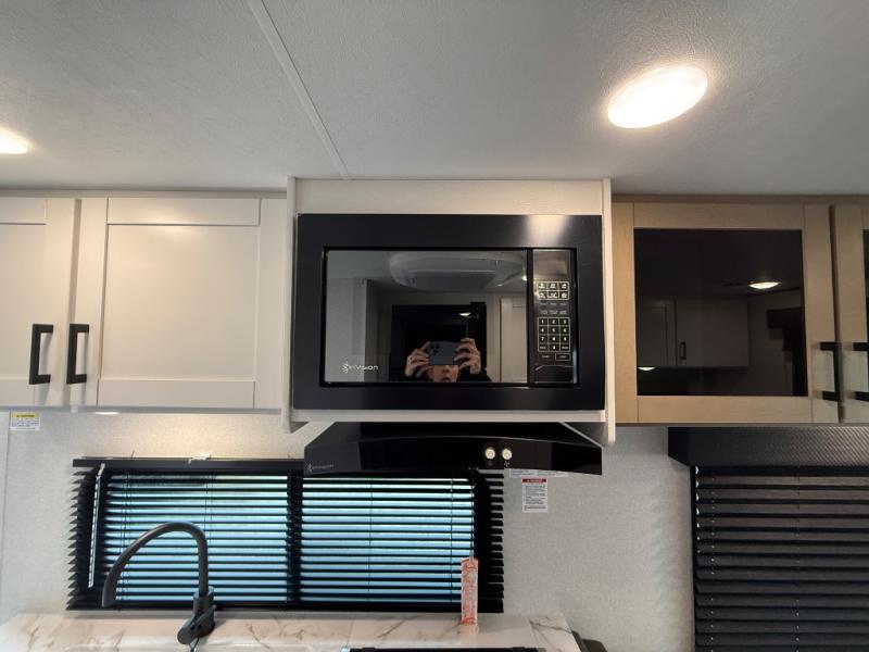 Camping in the woods is just what the doctor ordered and this trailer will provide all the interior comforts you need! There is a three burner cooktop and a microwave oven to prepare meals each day, plus an 8 cu. ft. 12V refrigerator for cold items. After your meal is made, you can dine at the booth dinette or relax on the jack-knife sofa, and these areas can become sleeping space for two to three guests at night. The full bath with a shower means you won't have to use the camp's facilities and the 16' power awning will provide protection from the sun as you visit with other campers!
