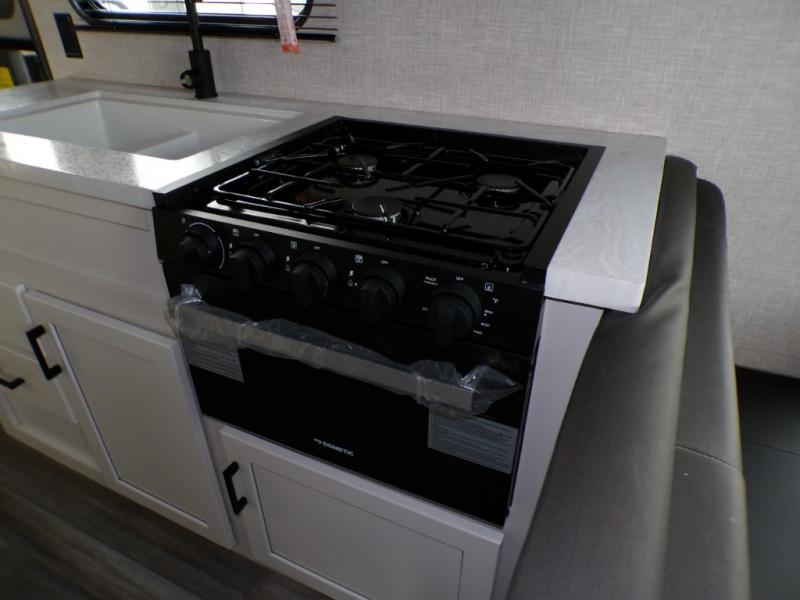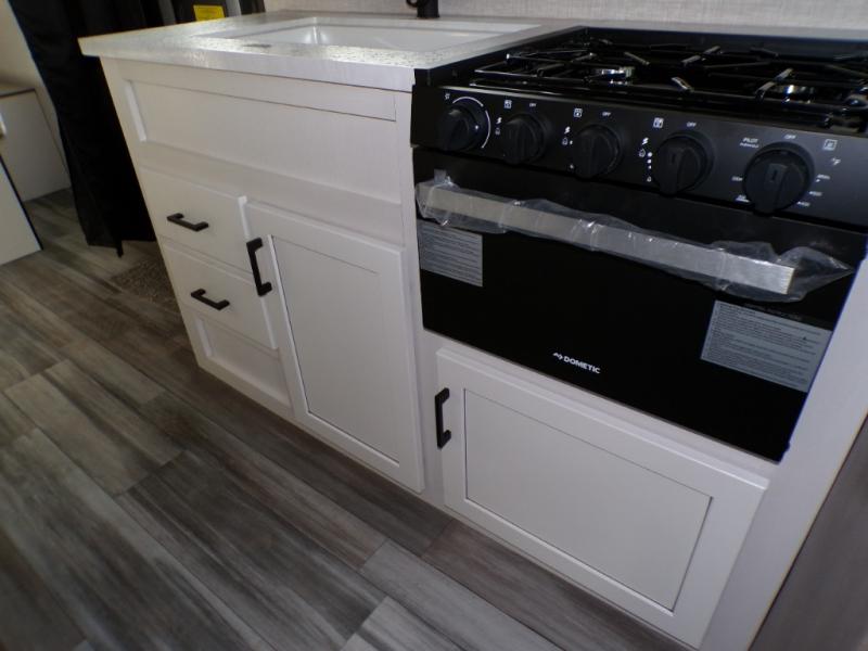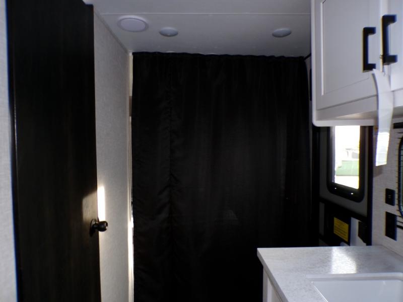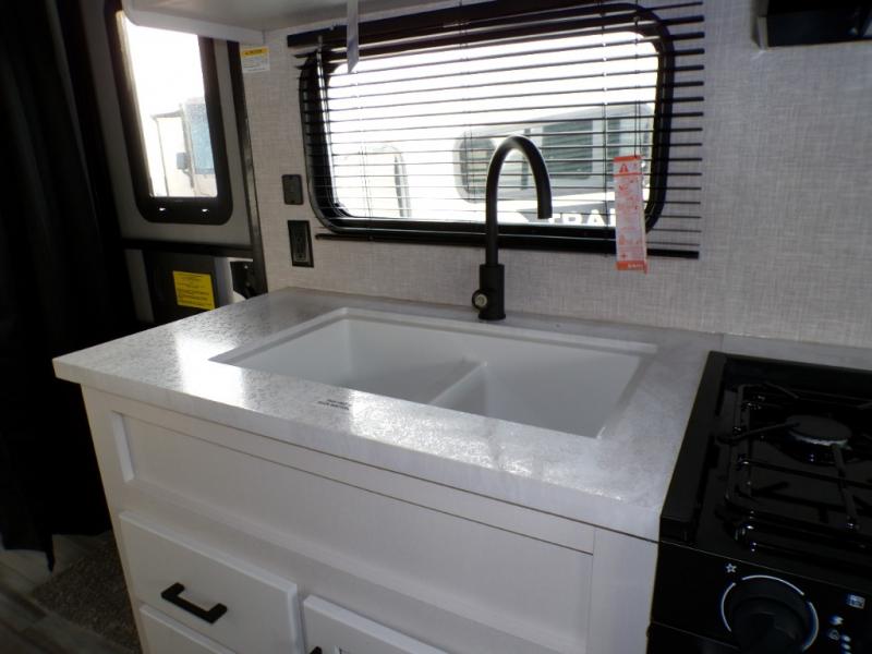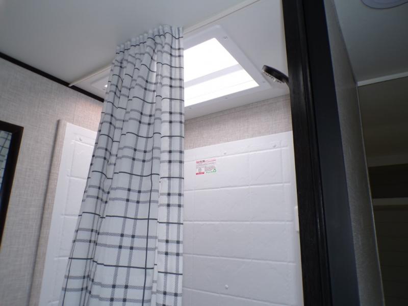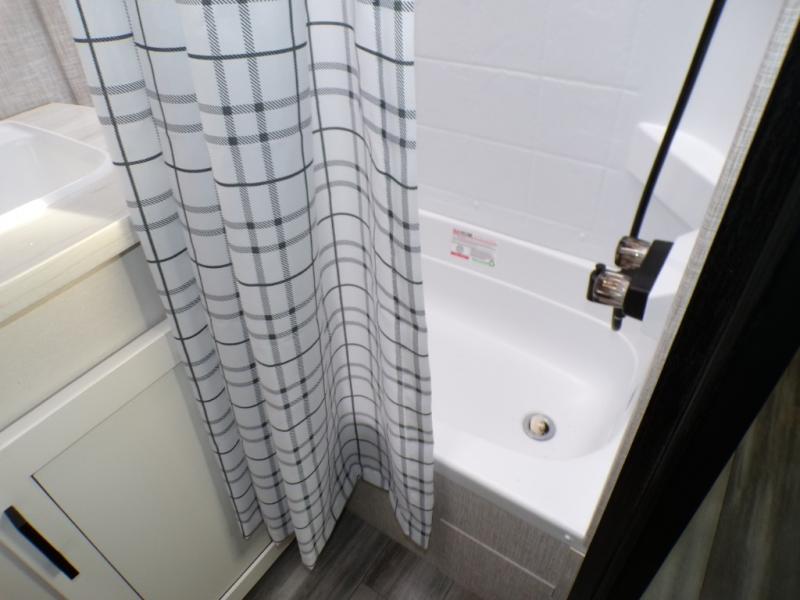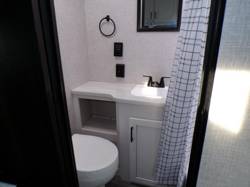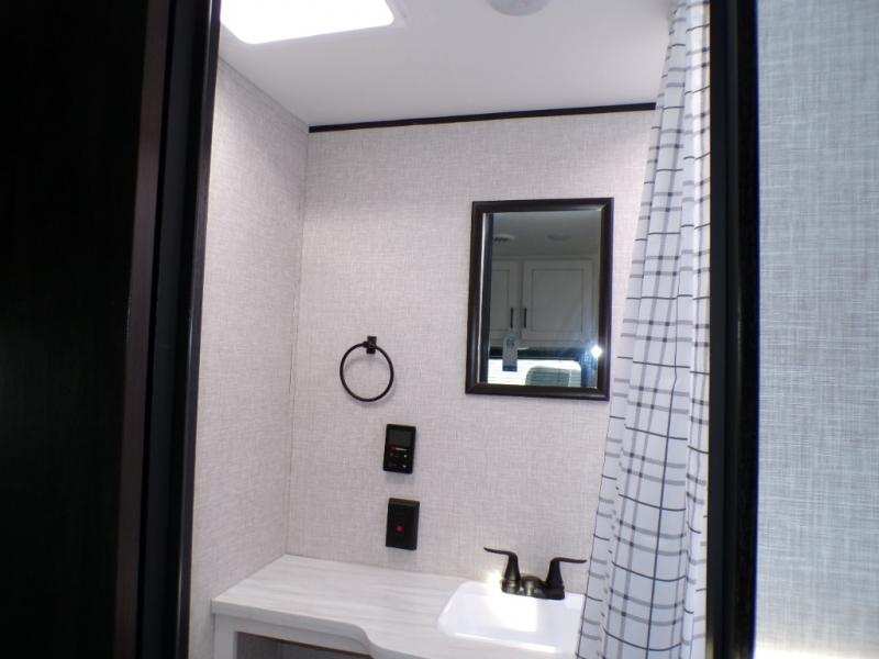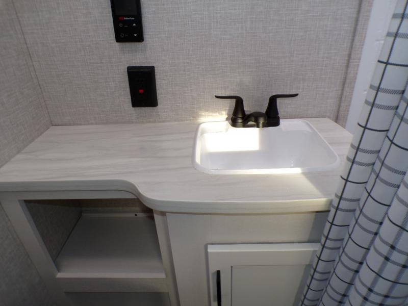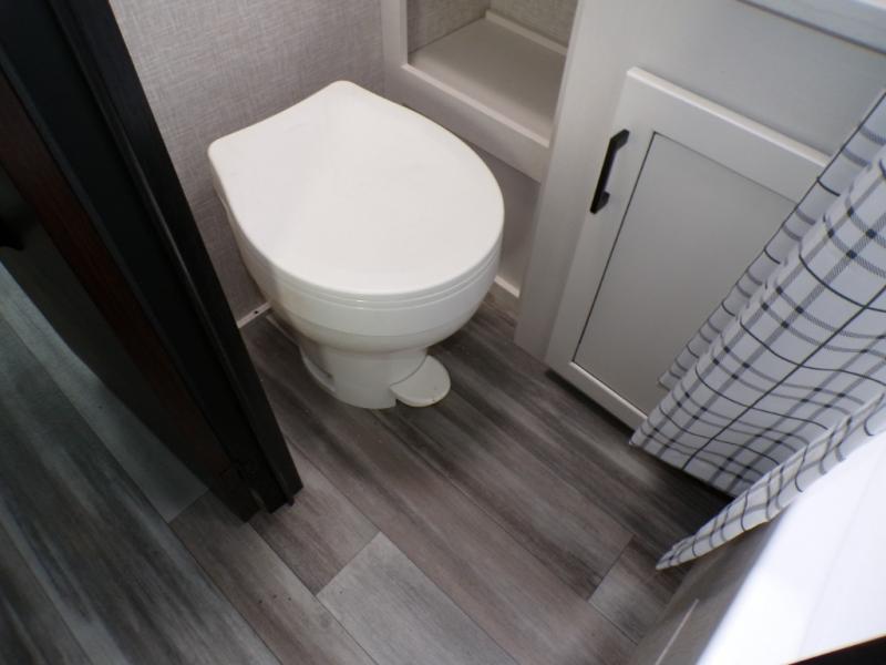 Includes a tub/shower combo, foot-flush toilet, sink, and medicine cabinet—no need for campground bathrooms.