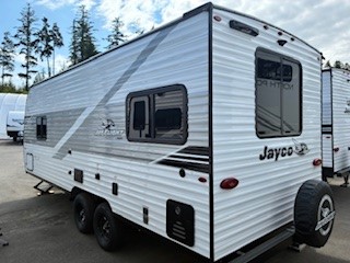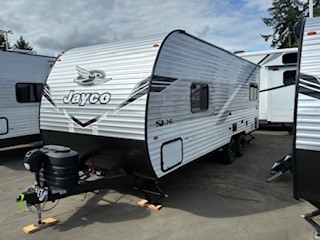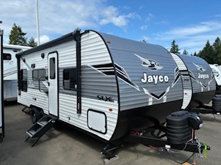 The Jayco Jay Flight SLX travel trailer is quite easy to own because it is lightweight for an easier towing experience. Built on a fully integrated A-frame with galvanized-steel, impact-resistant wheel wells, the Jay Flight SLX has quality at its very foundation. That quality continues on to the electric self-adjusting brakes, easy-lube hubs, Magnum Truss roof system, and LP quick connect. Some of what the mandatory Customer Value Package includes is backup camera prep, Keyed-Alike entry and baggage doors, marine grade exterior speakers, and an on-demand tankless water heater.