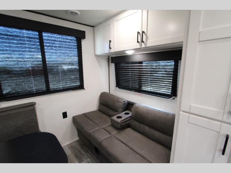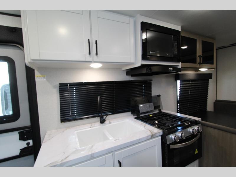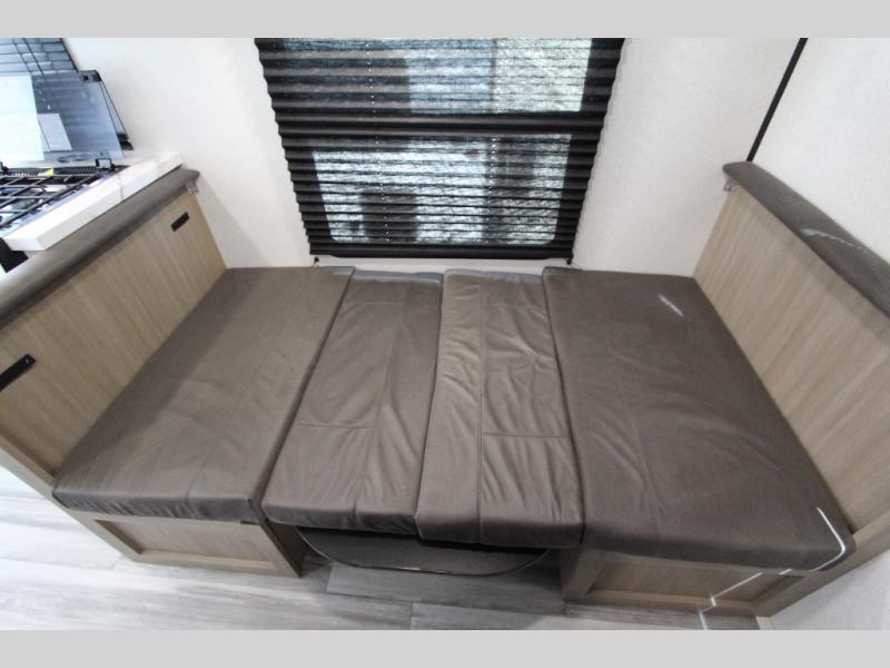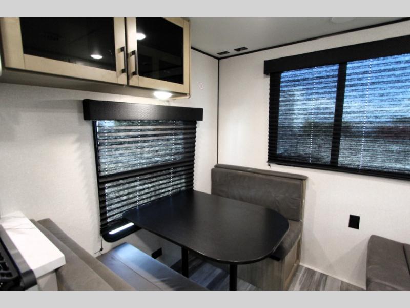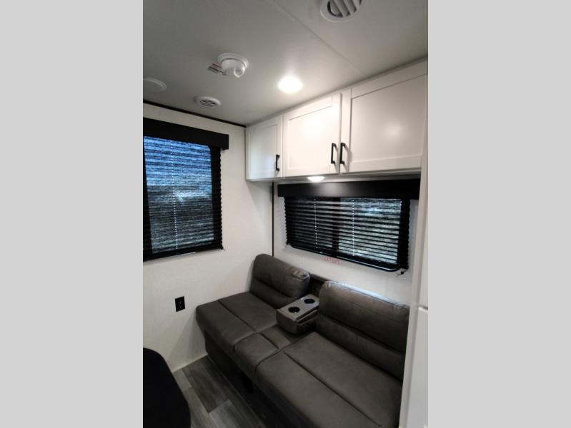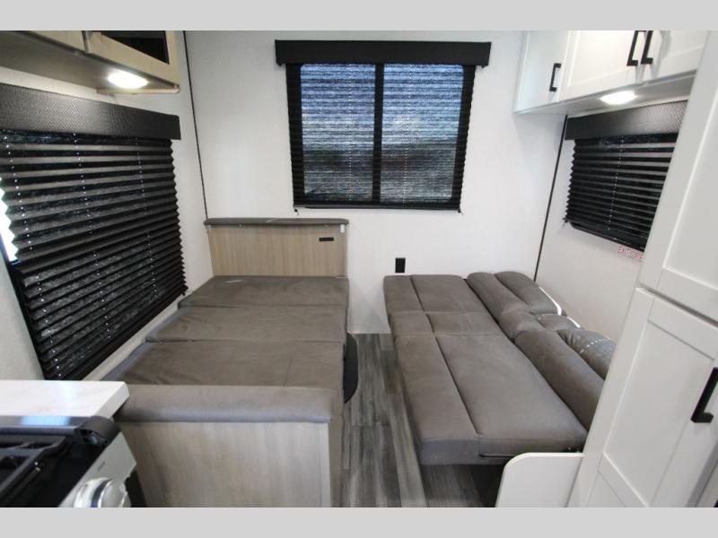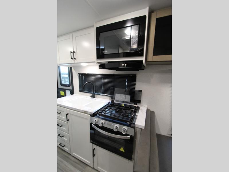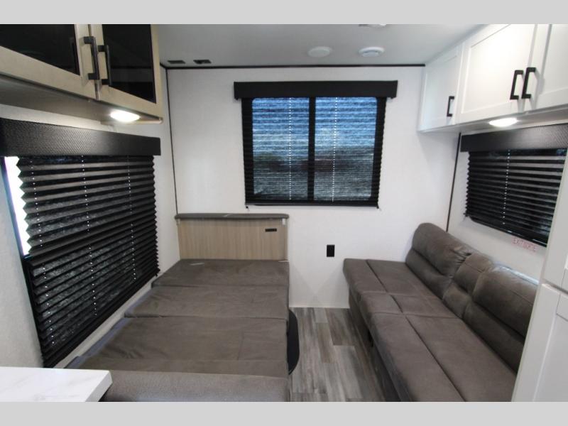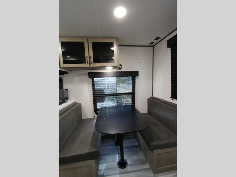 Camping in the woods is just what the doctor ordered and this trailer will provide all the interior comforts you need! There is a three burner cooktop and a microwave oven to prepare meals each day, plus an 8 cu. ft. 12V refrigerator for cold items. After your meal is made, you can dine at the booth dinette or relax on the jack-knife sofa, and these areas can become sleeping space for two to three guests at night. The full bath with a shower means you won't have to use the camp's facilities and the 16' power awning will provide protection from the sun as you visit with other campers!