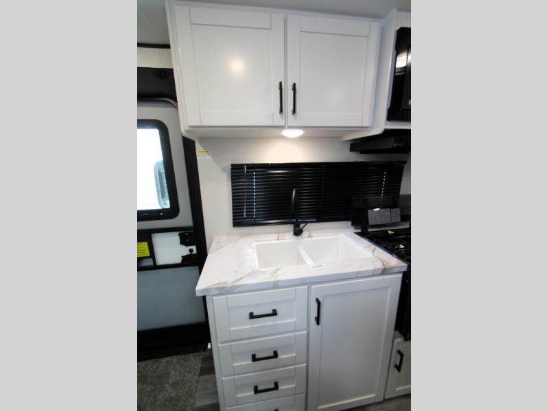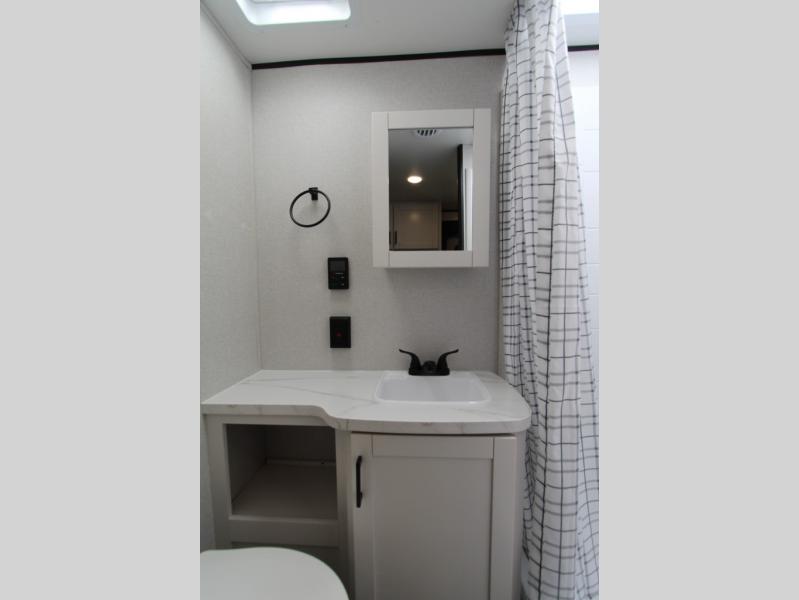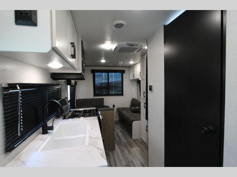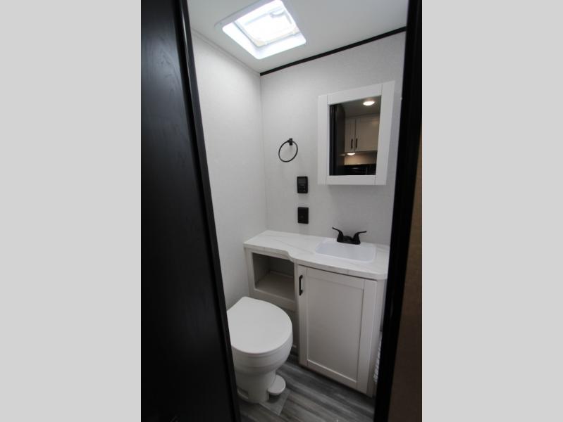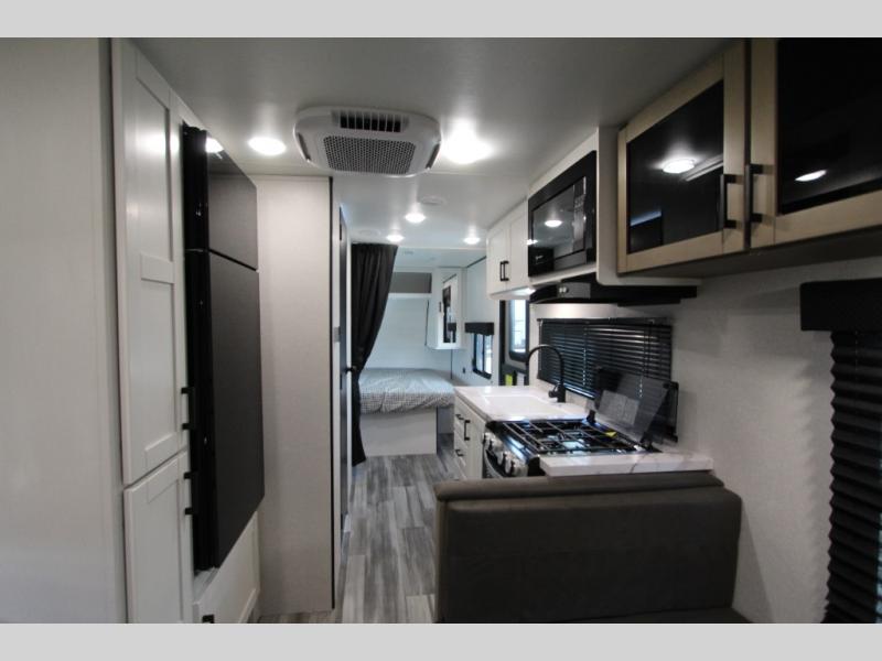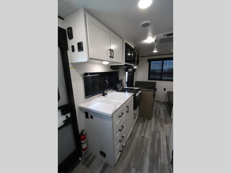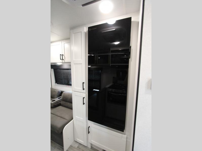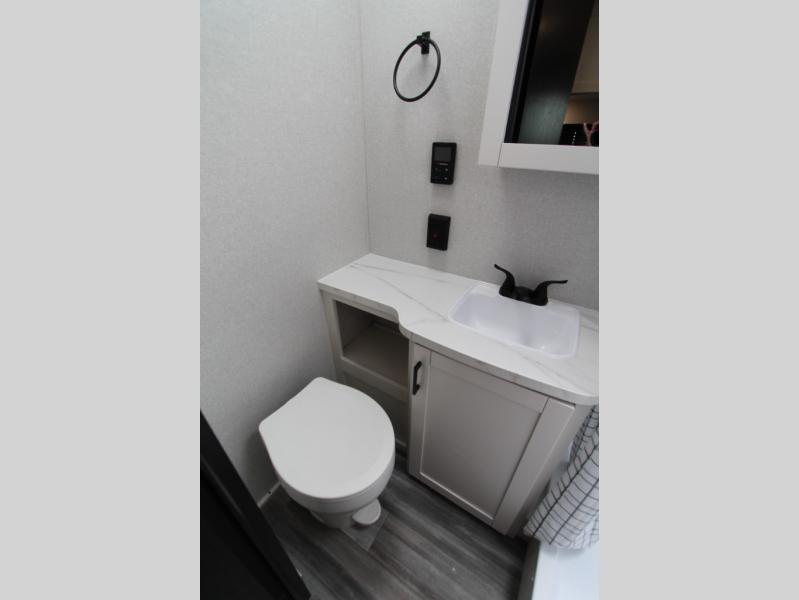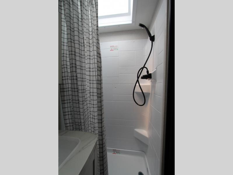 Camping in the woods is just what the doctor ordered and this trailer will provide all the interior comforts you need! There is a three burner cooktop and a microwave oven to prepare meals each day, plus an 8 cu. ft. 12V refrigerator for cold items. After your meal is made, you can dine at the booth dinette or relax on the jack-knife sofa, and these areas can become sleeping space for two to three guests at night. The full bath with a shower means you won't have to use the camp's facilities and the 16' power awning will provide protection from the sun as you visit with other campers!