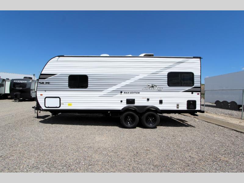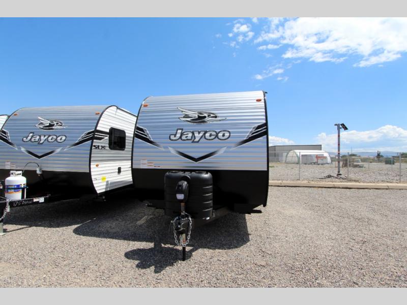 The Jayco Jay Flight SLX travel trailer is quite easy to own because it is lightweight for an easier towing experience. Built on a fully integrated A-frame with galvanized-steel, impact-resistant wheel wells, the Jay Flight SLX has quality at its very foundation. That quality continues on to the electric self-adjusting brakes, easy-lube hubs, Magnum Truss roof system, and LP quick connect. Some of what the mandatory Customer Value Package includes is backup camera prep, Keyed-Alike entry and baggage doors, and an on-demand tankless water heater.