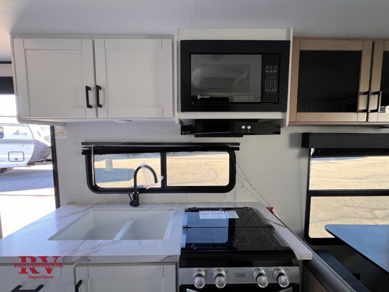 Camping in the woods is just what the doctor ordered and this trailer will provide all the interior comforts you need! There is a three burner cooktop and a microwave oven to prepare meals each day, plus an 8 cu. ft. 12V refrigerator for cold items. After your meal is made, you can dine at the booth dinette or relax on the jack-knife sofa, and these areas can become sleeping space for two to three guests at night. The full bath with a shower means you won't have to use the camp's facilities and the 16' power awning will provide protection from the sun as you visit with other campers!