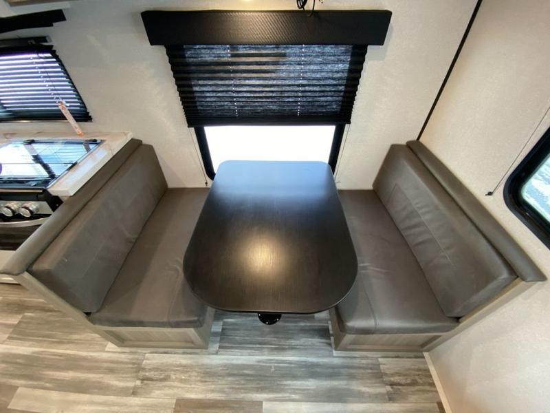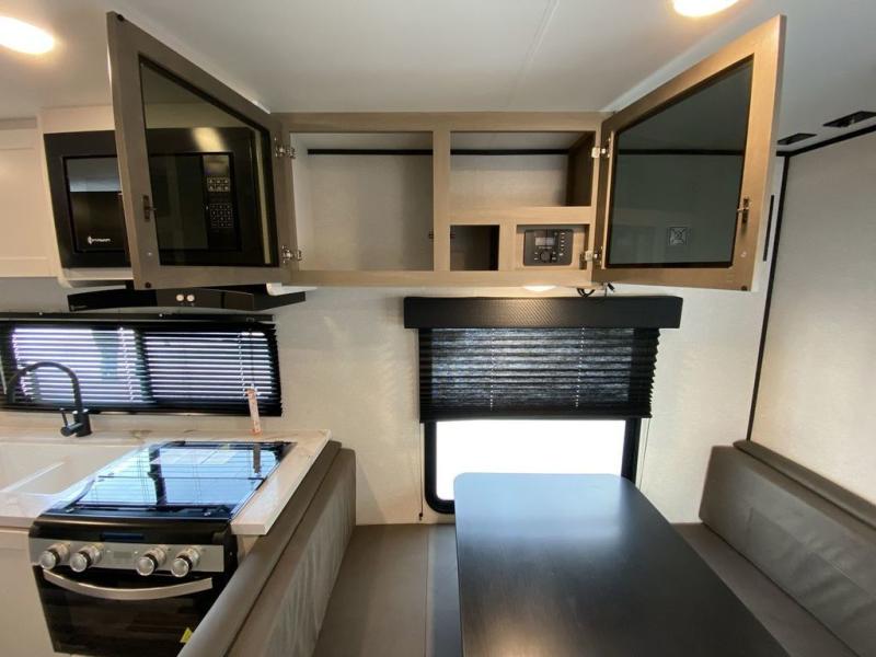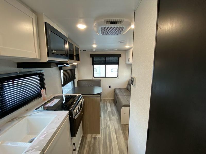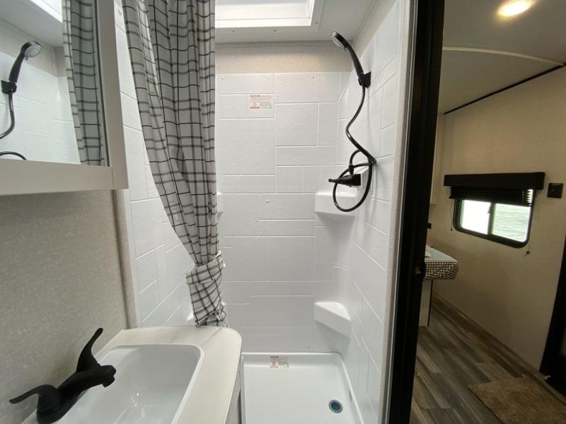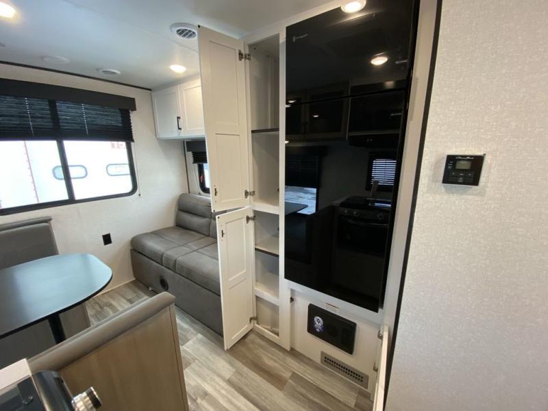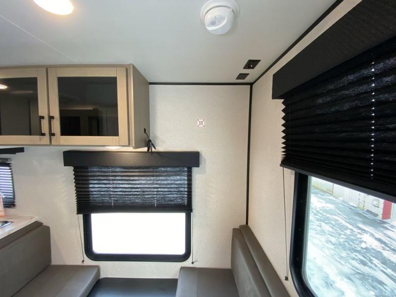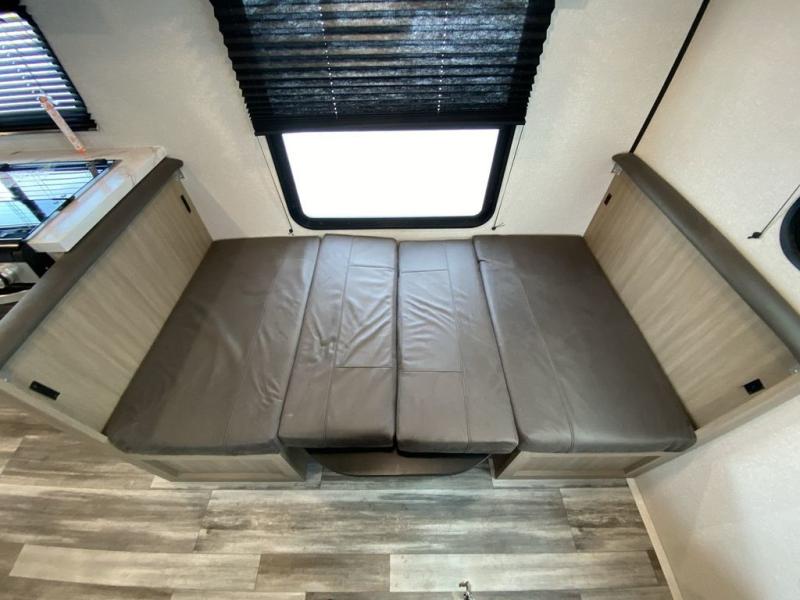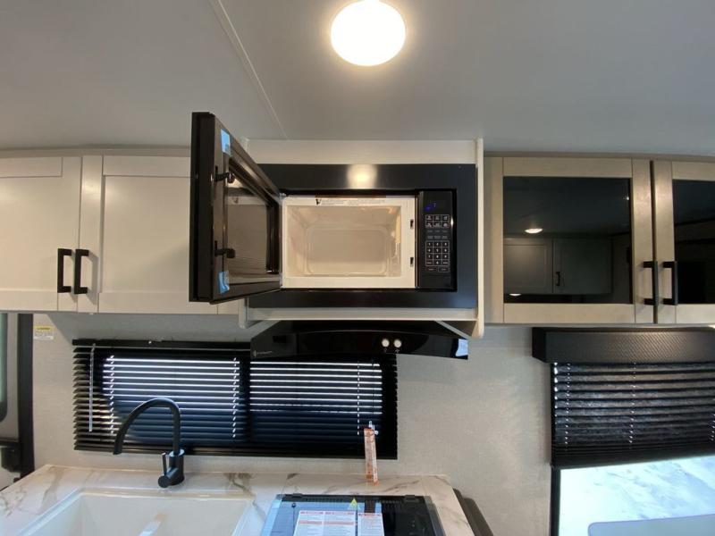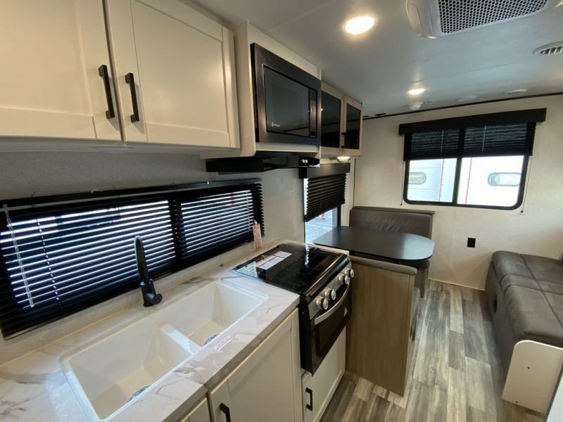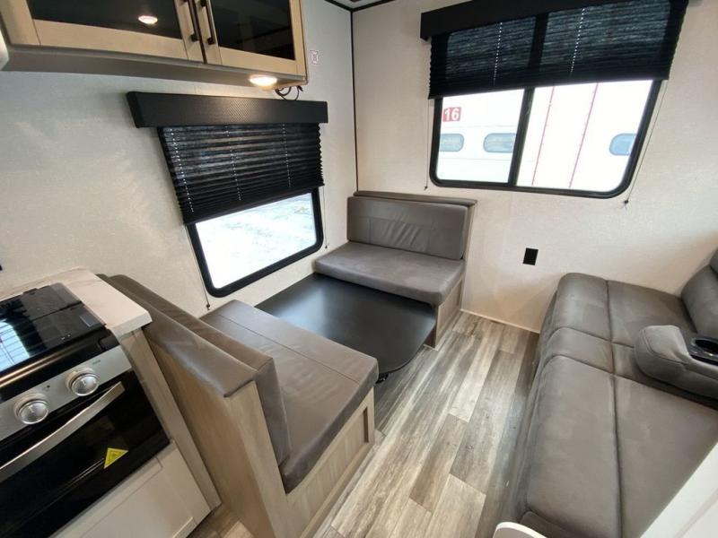 Camping in the woods is just what the doctor ordered and this trailer will provide all the interior comforts you need! There is a three burner cooktop and a microwave oven to prepare meals each day, plus an 8 cu. ft. 12V refrigerator for cold items. After your meal is made, you can dine at the booth dinette or relax on the jack-knife sofa, and these areas can become sleeping space for two to three guests at night. The full bath with a shower means you won't have to use the camp's facilities and the 16' power awning will provide protection from the sun as you visit with other campers!
