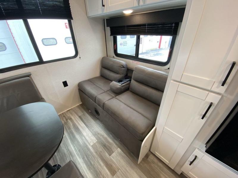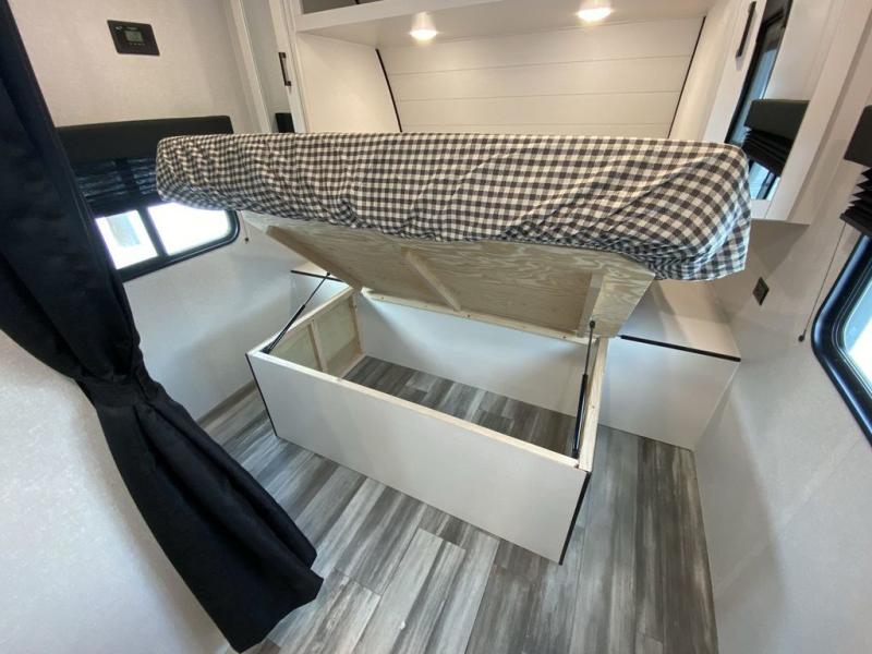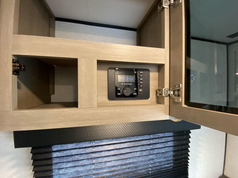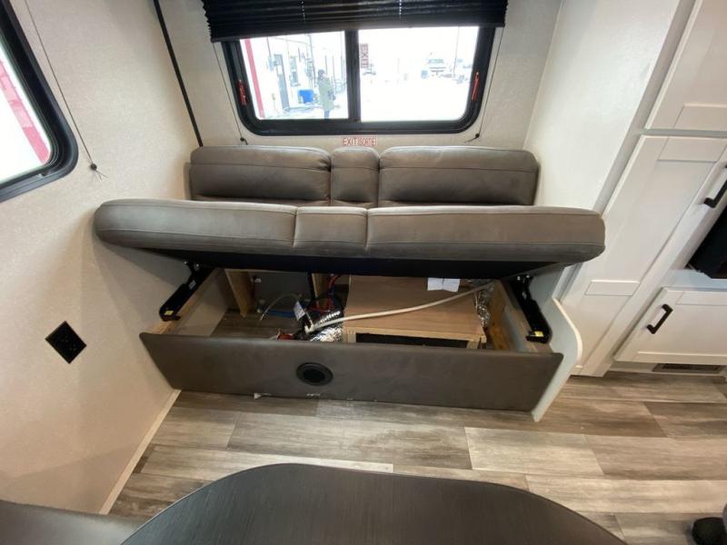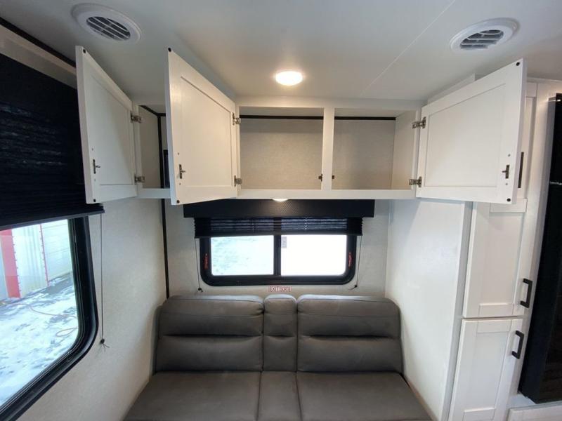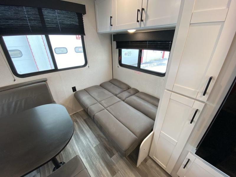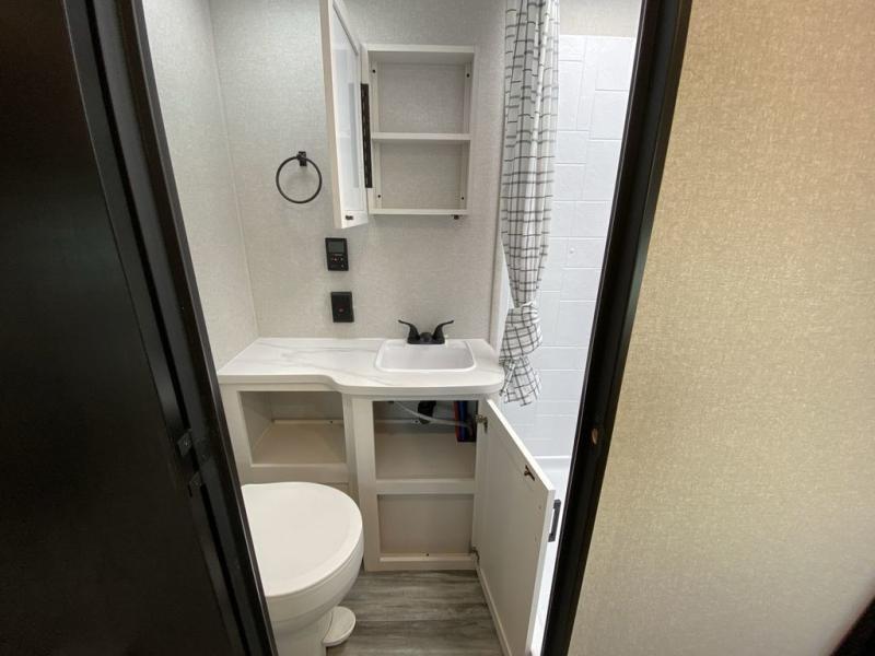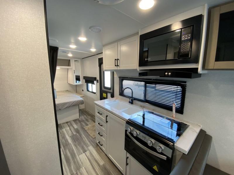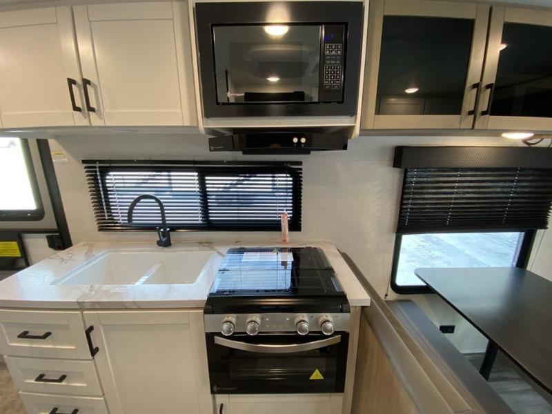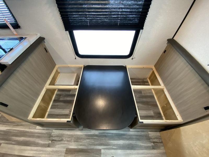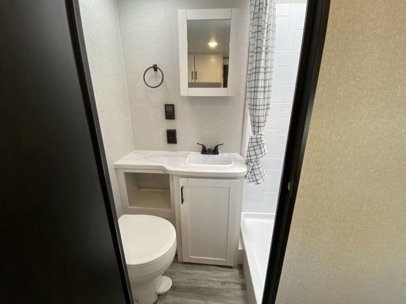 Camping in the woods is just what the doctor ordered and this trailer will provide all the interior comforts you need! There is a three burner cooktop and a microwave oven to prepare meals each day, plus an 8 cu. ft. 12V refrigerator for cold items. After your meal is made, you can dine at the booth dinette or relax on the jack-knife sofa, and these areas can become sleeping space for two to three guests at night. The full bath with a shower means you won't have to use the camp's facilities and the 16' power awning will provide protection from the sun as you visit with other campers!