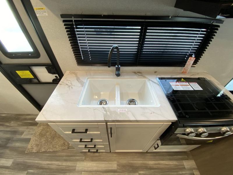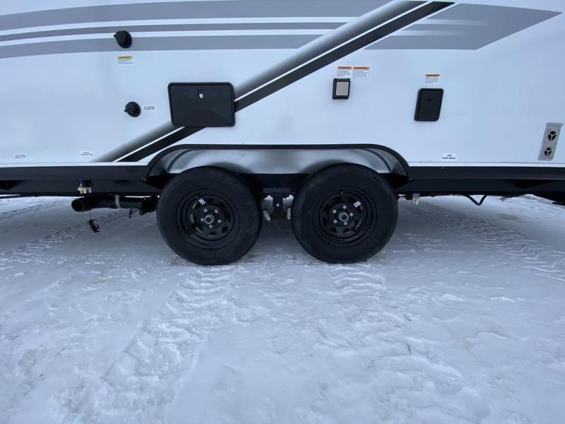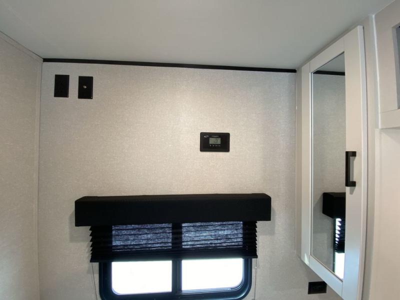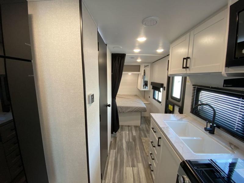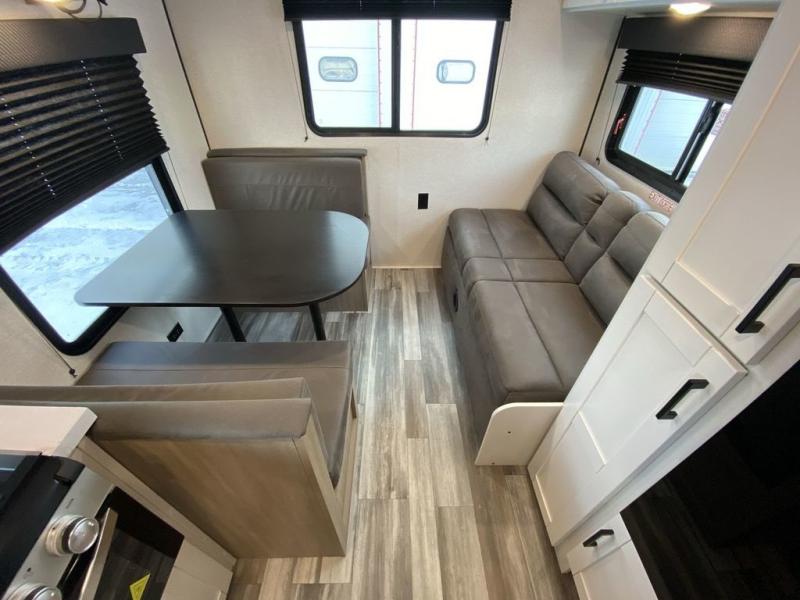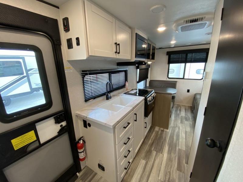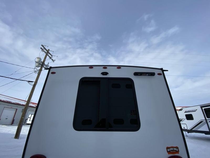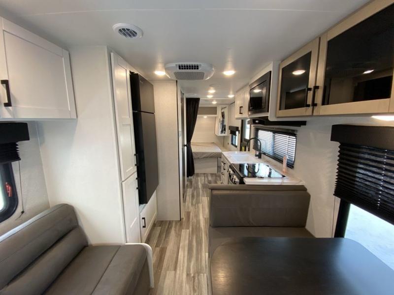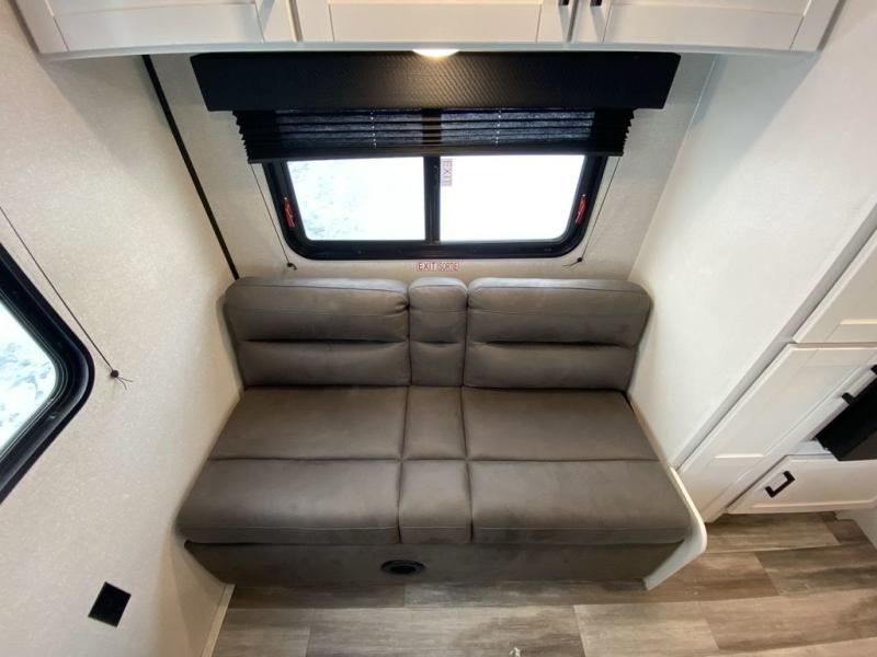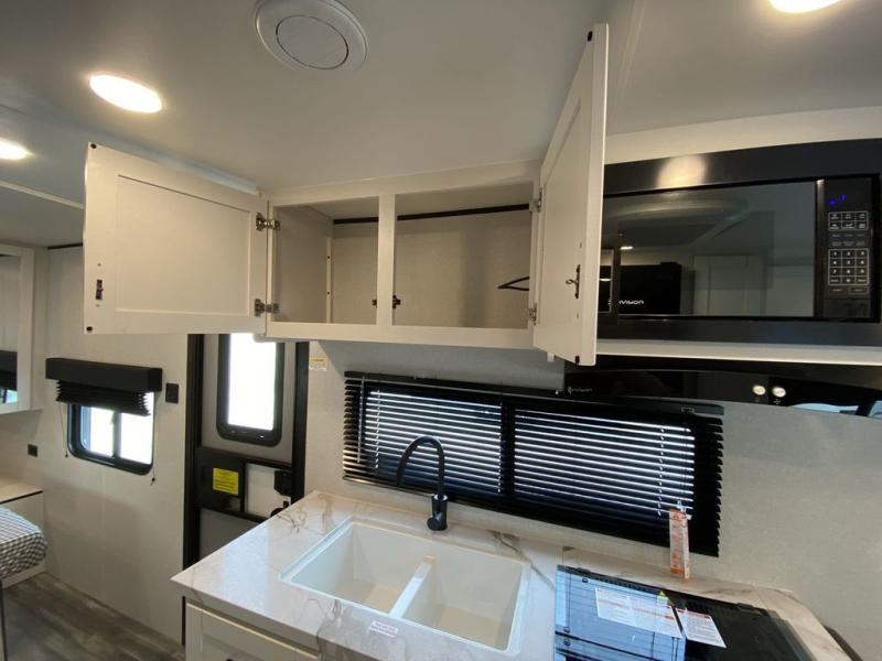 Camping in the woods is just what the doctor ordered and this trailer will provide all the interior comforts you need! There is a three burner cooktop and a microwave oven to prepare meals each day, plus an 8 cu. ft. 12V refrigerator for cold items. After your meal is made, you can dine at the booth dinette or relax on the jack-knife sofa, and these areas can become sleeping space for two to three guests at night. The full bath with a shower means you won't have to use the camp's facilities and the 16' power awning will provide protection from the sun as you visit with other campers!