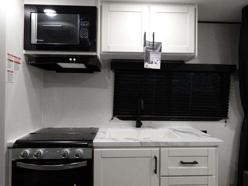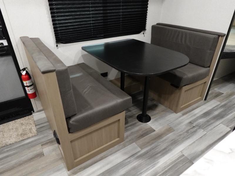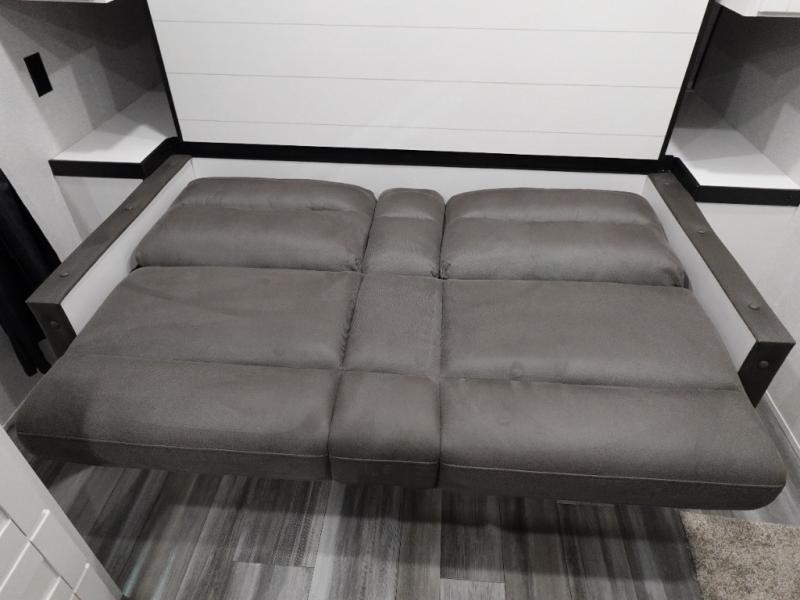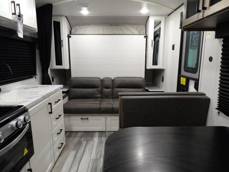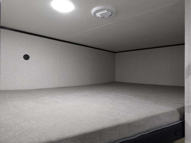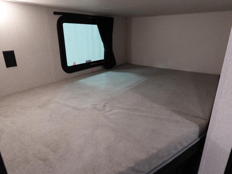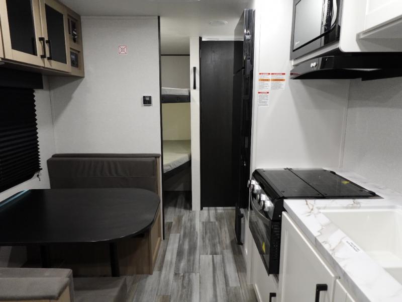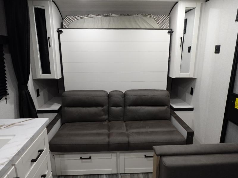 You'll love camping at the lake in this versatile travel trailer. Since there is a Murphy bed up front, you can fold it away in the morning to enjoy the Jack-knife sofa, plus there is a booth dinette for even more seating space. The microwave oven and cooktop in the kitchen allow you to make meals each day, and the 8 cu. ft. 12V refrigerator will keep perishables fresh. Your guests or the little ones are sure to love the double-size bunks, and the rear corner bath is right next to the bunks for easy nighttime use!