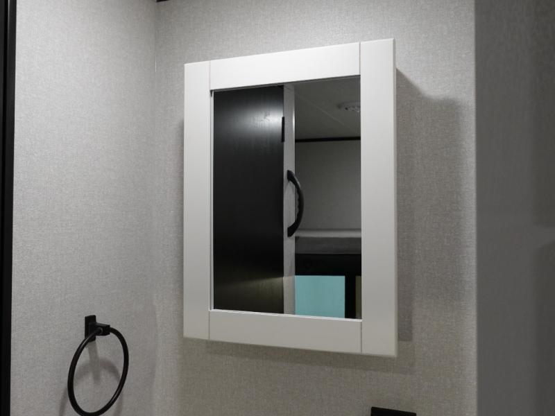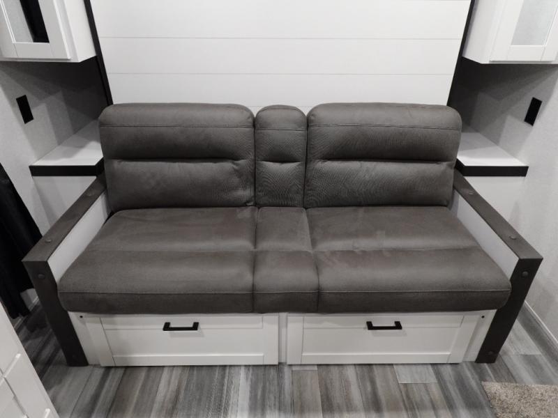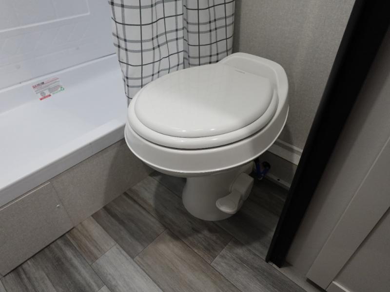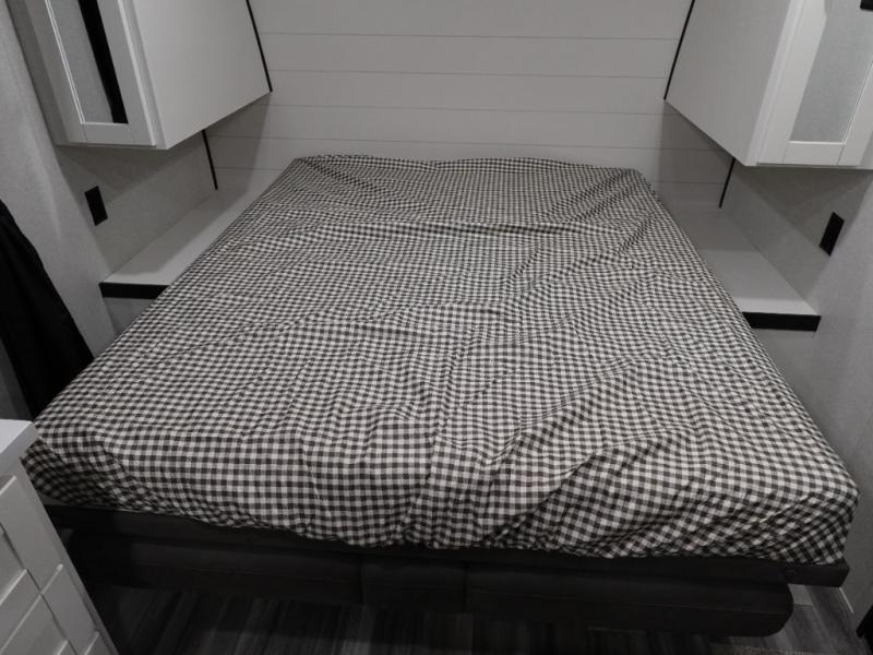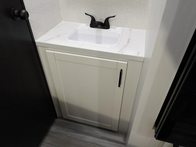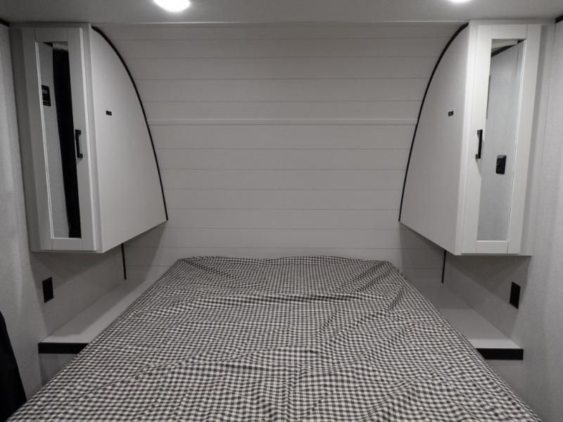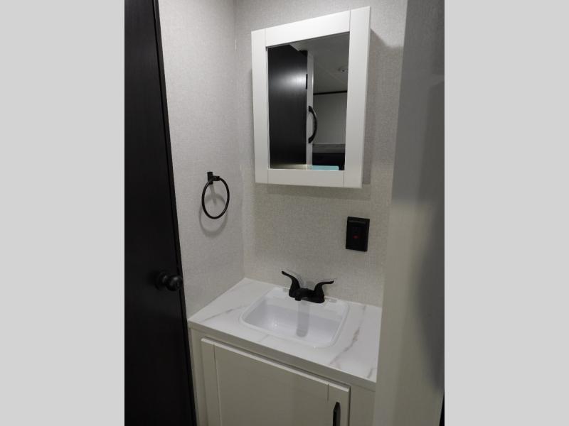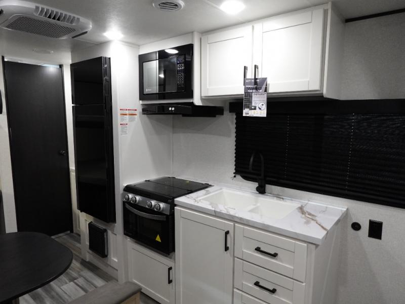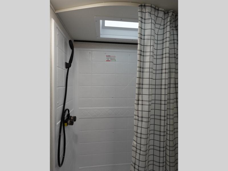 You'll love camping at the lake in this versatile travel trailer. Since there is a Murphy bed up front, you can fold it away in the morning to enjoy the Jack-knife sofa, plus there is a booth dinette for even more seating space. The microwave oven and cooktop in the kitchen allow you to make meals each day, and the 8 cu. ft. 12V refrigerator will keep perishables fresh. Your guests or the little ones are sure to love the double-size bunks, and the rear corner bath is right next to the bunks for easy nighttime use!