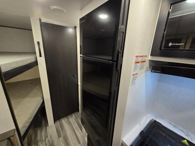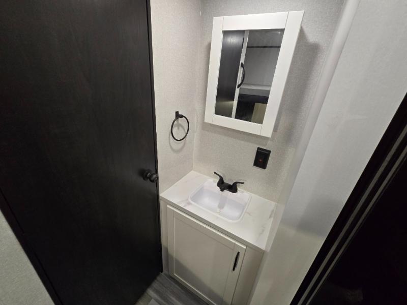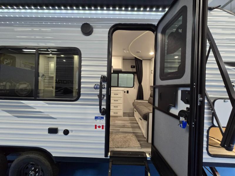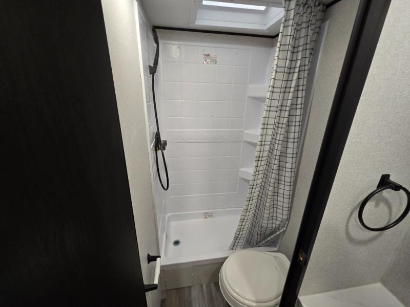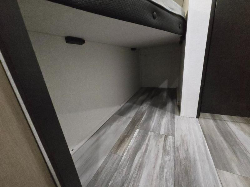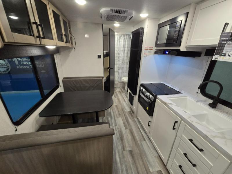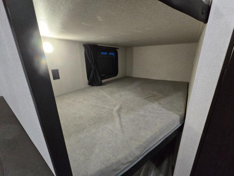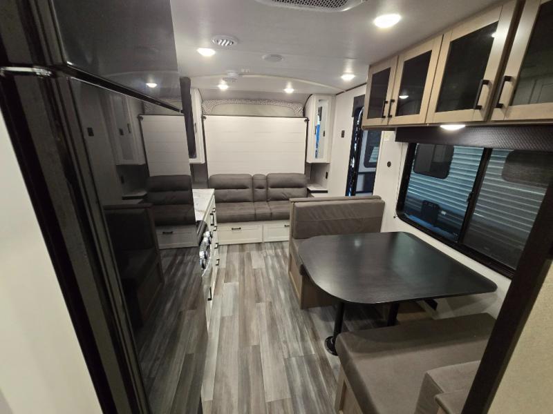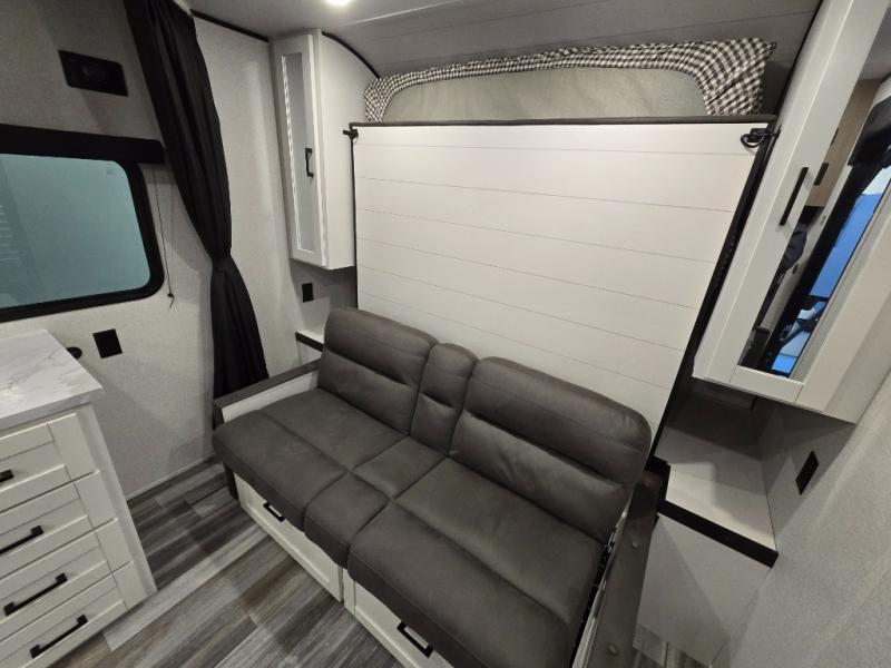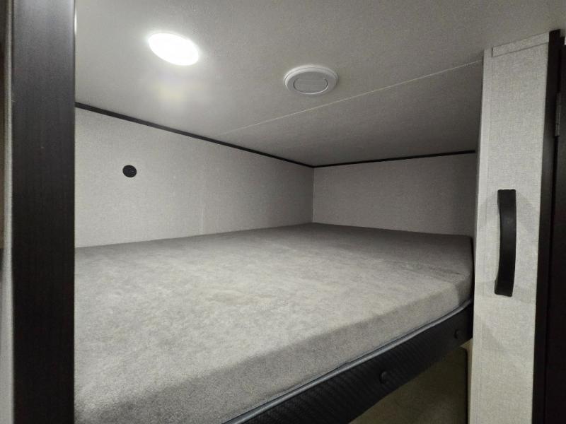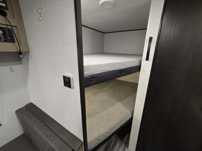 You'll love camping at the lake in this versatile travel trailer. Since there is a Murphy bed up front, you can fold it away in the morning to enjoy the Jack-knife sofa, plus there is a booth dinette for even more seating space. The microwave oven and cooktop in the kitchen allow you to make meals each day, and the 8 cu. ft. 12V refrigerator will keep perishables fresh. Your guests or the little ones are sure to love the double-size bunks, and the rear corner bath is right next to the bunks for easy nighttime use!