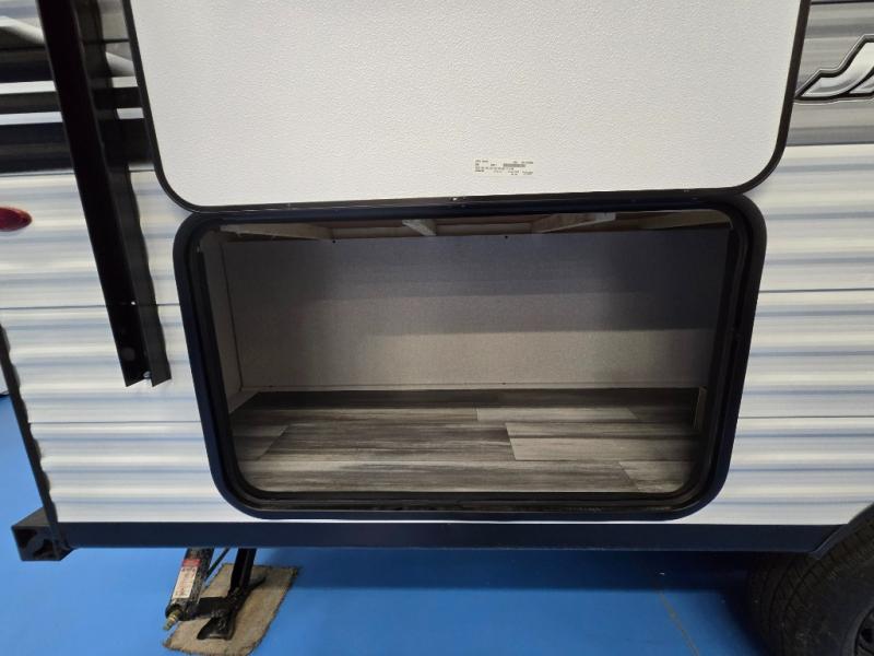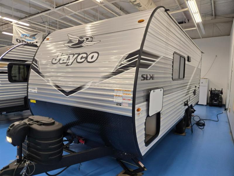 The Jayco Jay Flight SLX travel trailer is quite easy to own because it is lightweight for an easier towing experience. Built on a fully integrated A-frame with galvanized-steel, impact-resistant wheel wells, the Jay Flight SLX has quality at its very foundation. That quality continues on to the electric self-adjusting brakes, easy-lube hubs, Magnum Truss roof system, and LP quick connect. Some of what the mandatory Customer Value Package includes is backup camera prep, Keyed-Alike entry and baggage doors, and an on-demand tankless water heater.