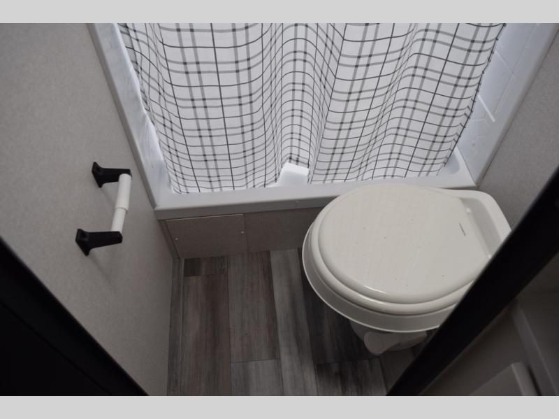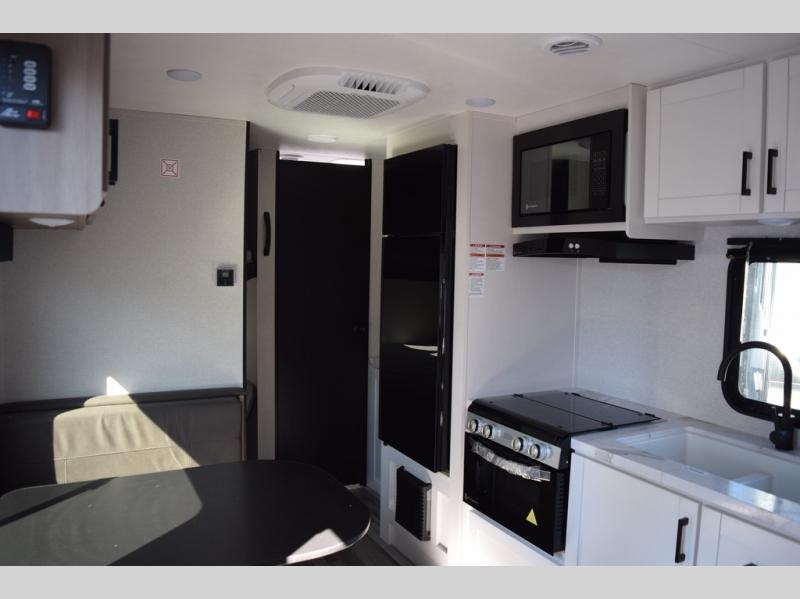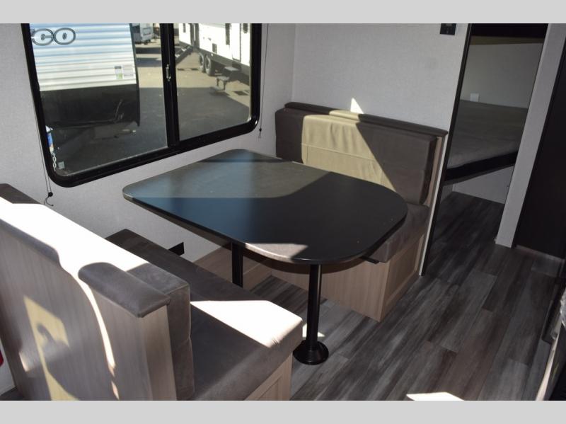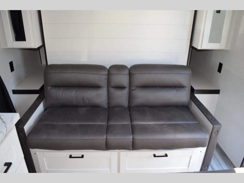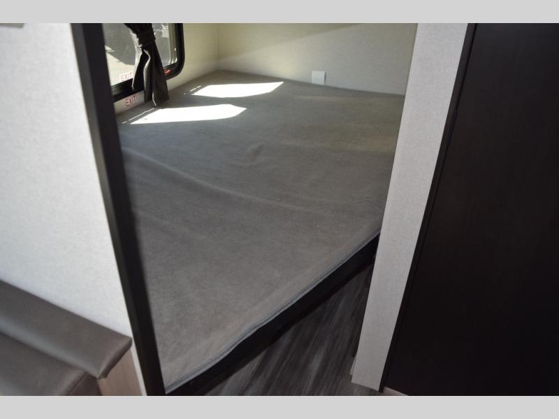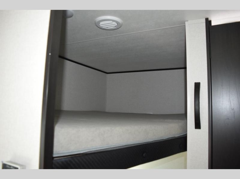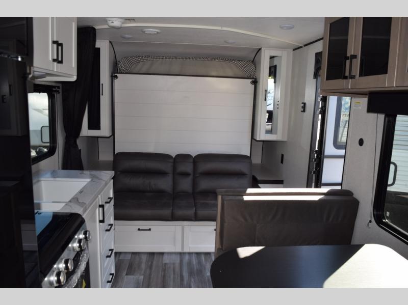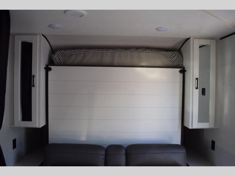 You'll love camping at the lake in this versatile travel trailer. Since there is a Murphy bed up front, you can fold it away in the morning to enjoy the Jack-knife sofa, plus there is a booth dinette for even more seating space. The microwave oven and cooktop in the kitchen allow you to make meals each day, and the 8 cu. ft. 12V refrigerator will keep perishables fresh. Your guests or the little ones are sure to love the double-size bunks, and the rear corner bath is right next to the bunks for easy nighttime use!