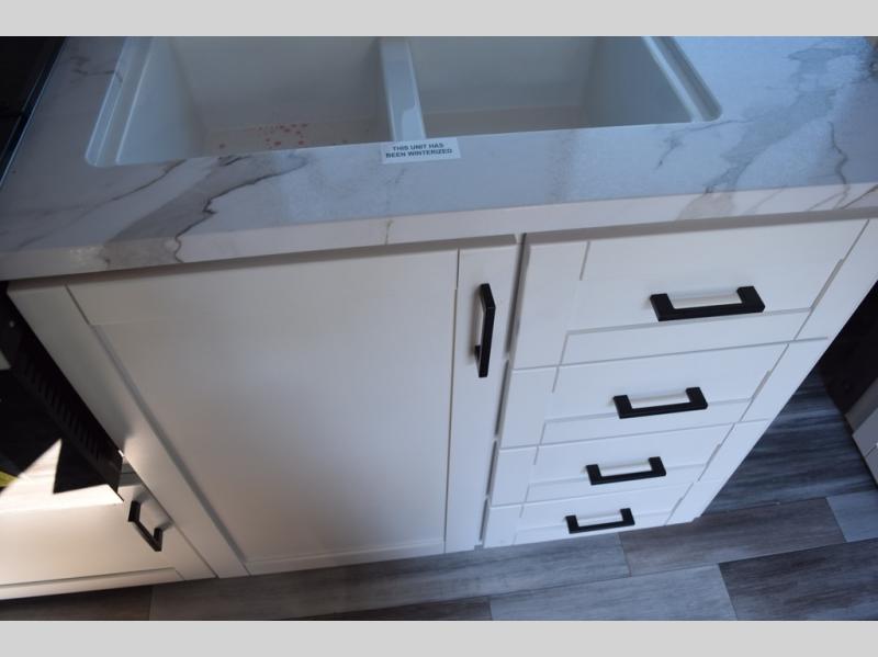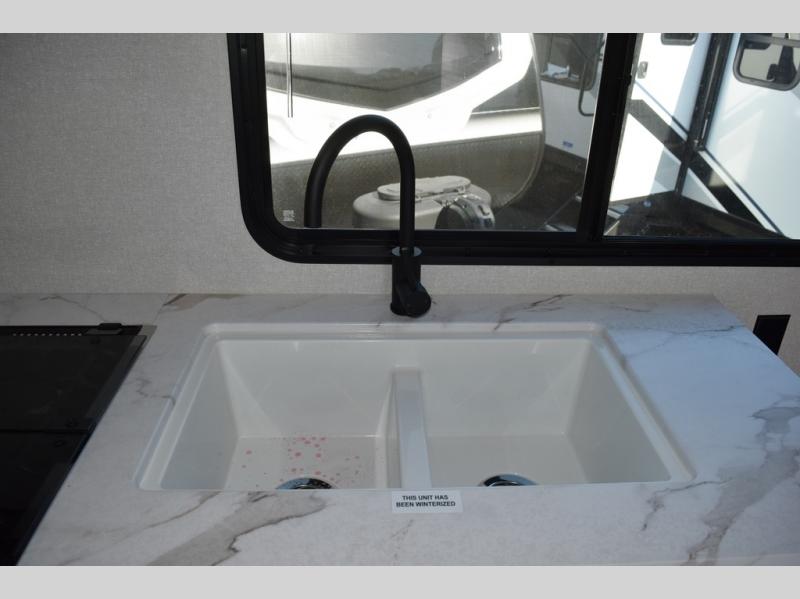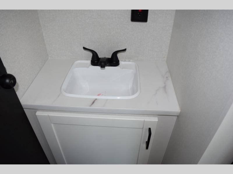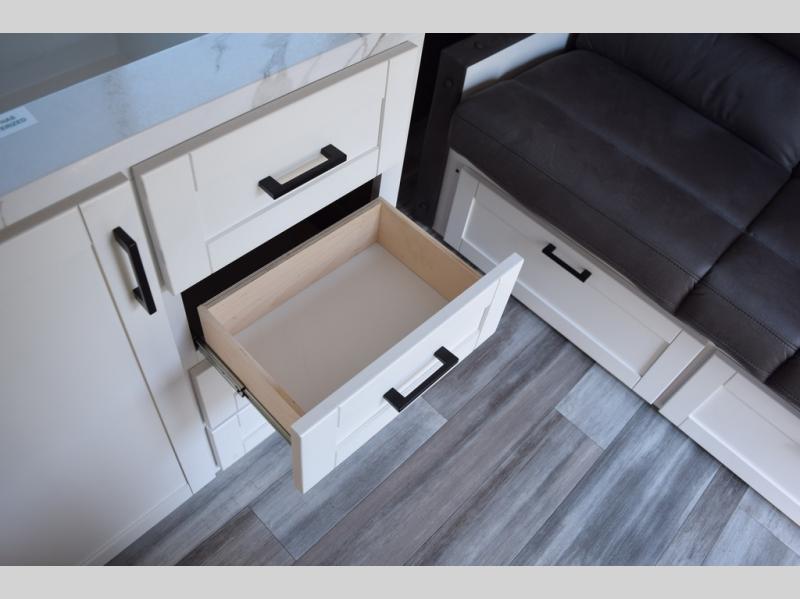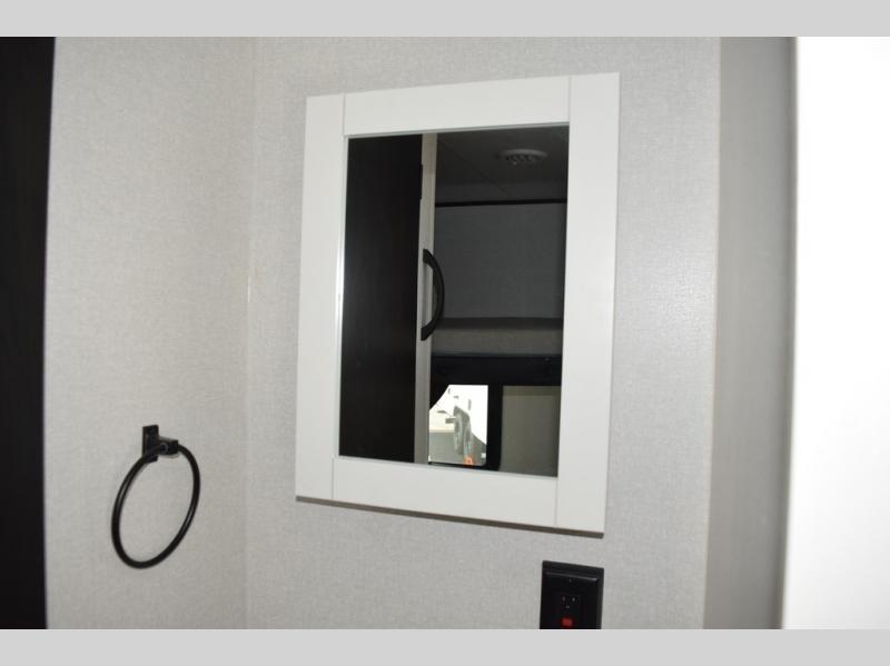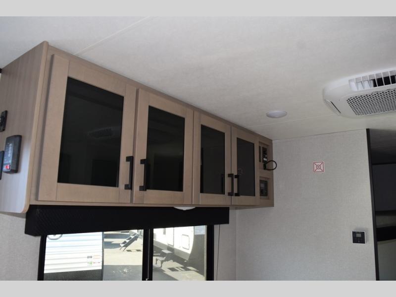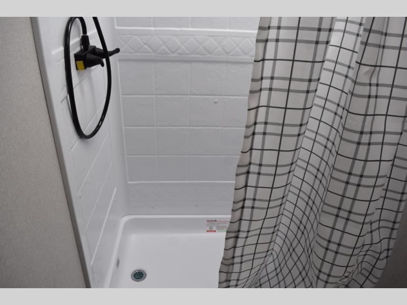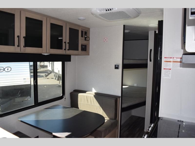 You'll love camping at the lake in this versatile travel trailer. Since there is a Murphy bed up front, you can fold it away in the morning to enjoy the Jack-knife sofa, plus there is a booth dinette for even more seating space. The microwave oven and cooktop in the kitchen allow you to make meals each day, and the 8 cu. ft. 12V refrigerator will keep perishables fresh. Your guests or the little ones are sure to love the double-size bunks, and the rear corner bath is right next to the bunks for easy nighttime use!