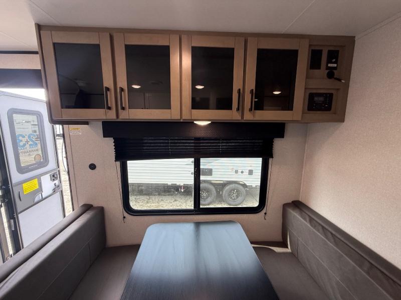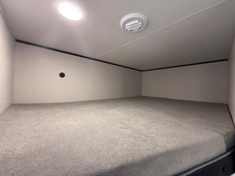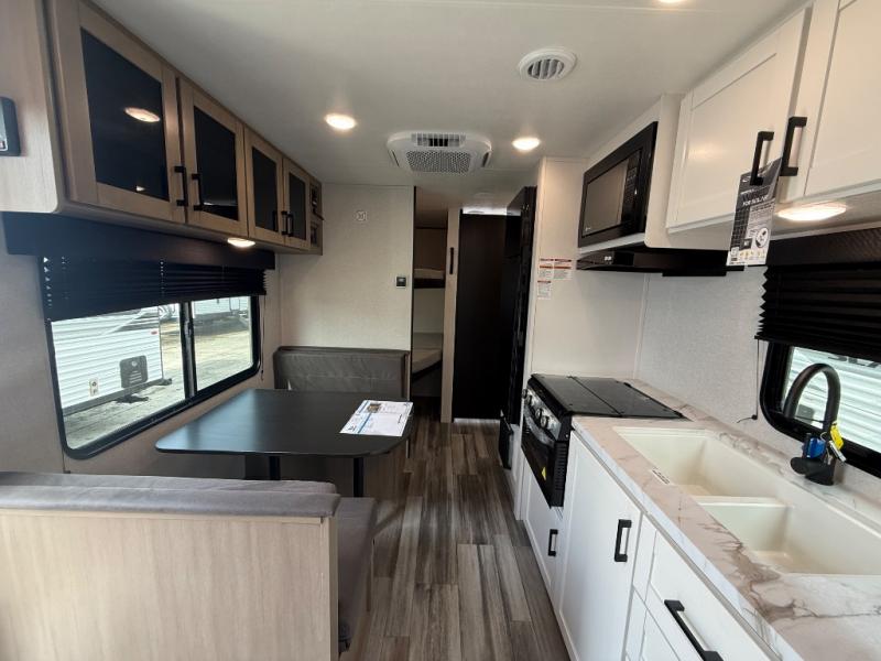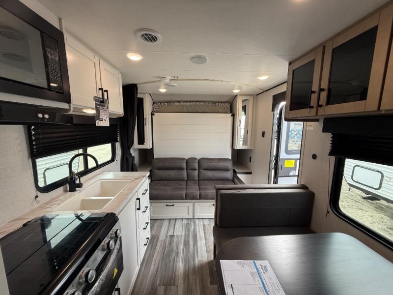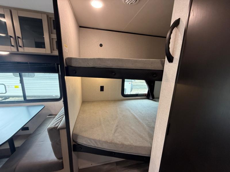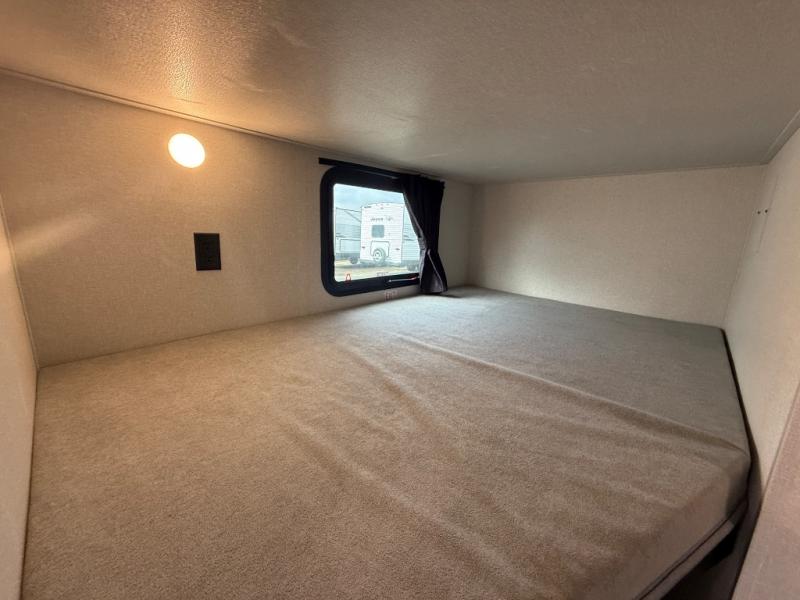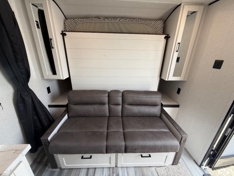 You'll love camping at the lake in this versatile travel trailer. Since there is a Murphy bed up front, you can fold it away in the morning to enjoy the Jack-knife sofa, plus there is a booth dinette for even more seating space. The microwave oven and cooktop in the kitchen allow you to make meals each day, and the 8 cu. ft. 12V refrigerator will keep perishables fresh. Your guests or the little ones are sure to love the double-size bunks, and the rear corner bath is right next to the bunks for easy nighttime use!