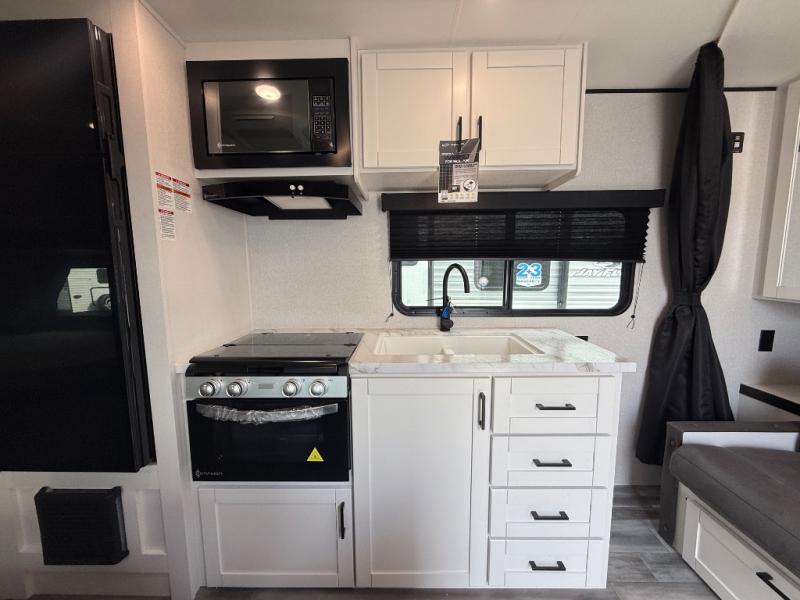 The Jayco Jay Flight SLX travel trailer is quite easy to own because it is lightweight for an easier towing experience. Built on a fully integrated A-frame with galvanized-steel, impact-resistant wheel wells, the Jay Flight SLX has quality at its very foundation. That quality continues on to the electric self-adjusting brakes, easy-lube hubs, Magnum Truss roof system, and LP quick connect. Some of what the mandatory Customer Value Package includes is backup camera prep, Keyed-Alike entry and baggage doors, and an on-demand tankless water heater.