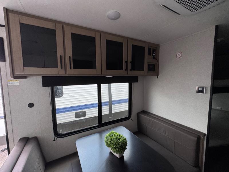 You'll love camping at the lake in this versatile travel trailer. Since there is a Murphy bed up front, you can fold it away in the morning to enjoy the Jack-knife sofa, plus there is a booth dinette for even more seating space. The microwave oven and cooktop in the kitchen allow you to make meals each day, and the 8 cu. ft. 12V refrigerator will keep perishables fresh. Your guests or the little ones are sure to love the double-size bunks, and the rear corner bath is right next to the bunks for easy nighttime use!