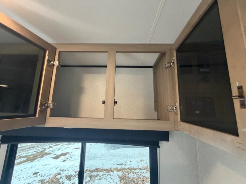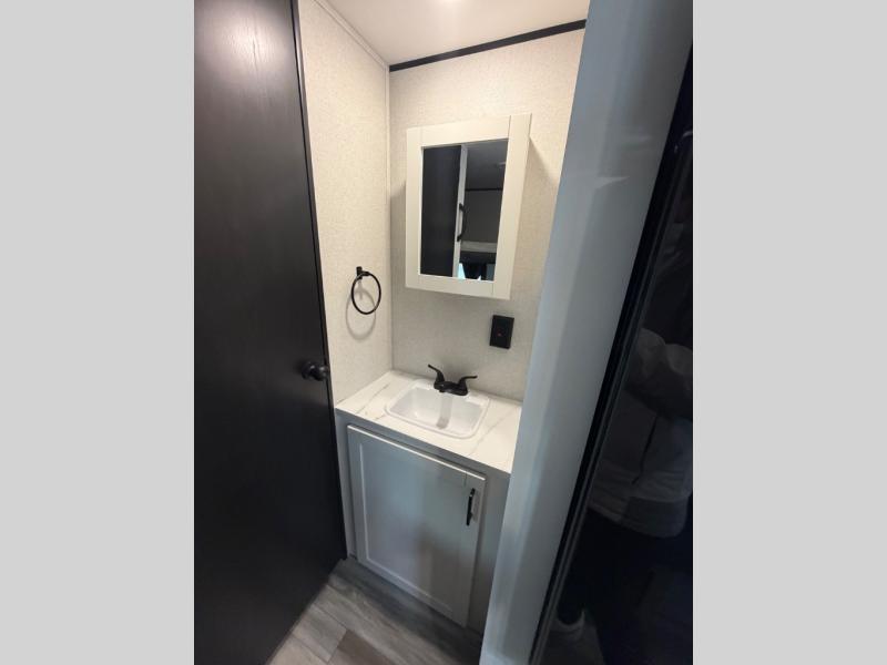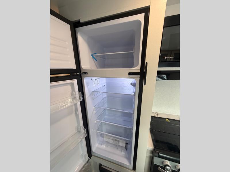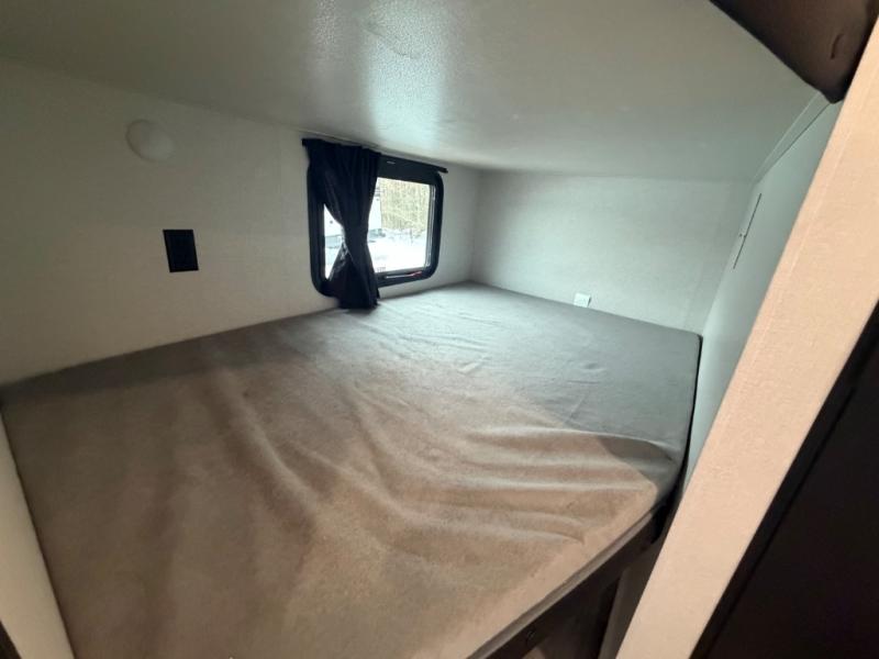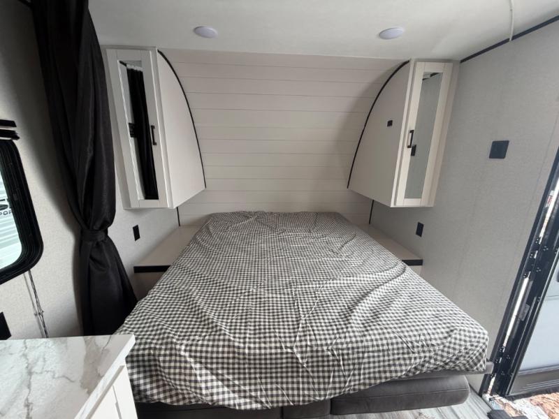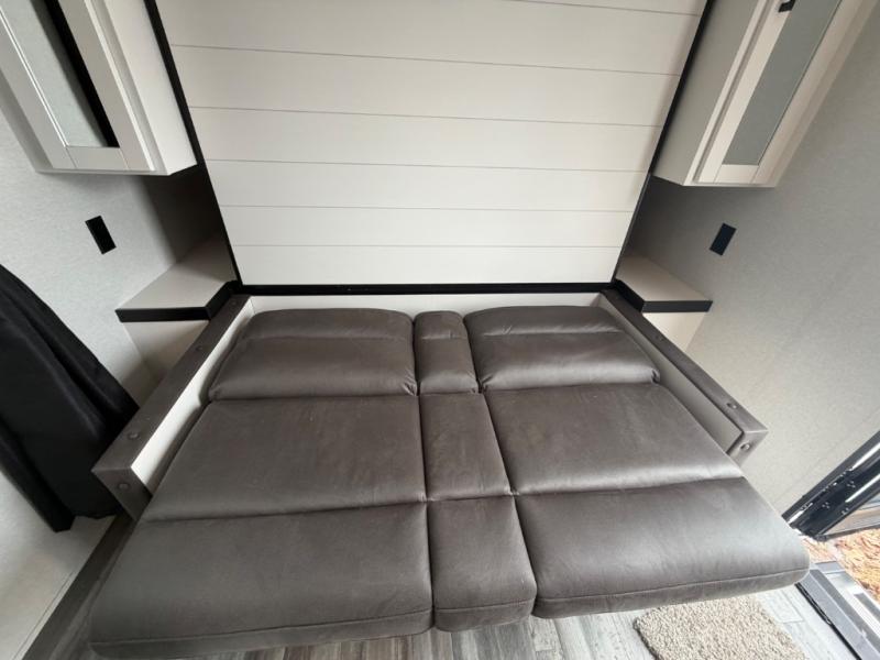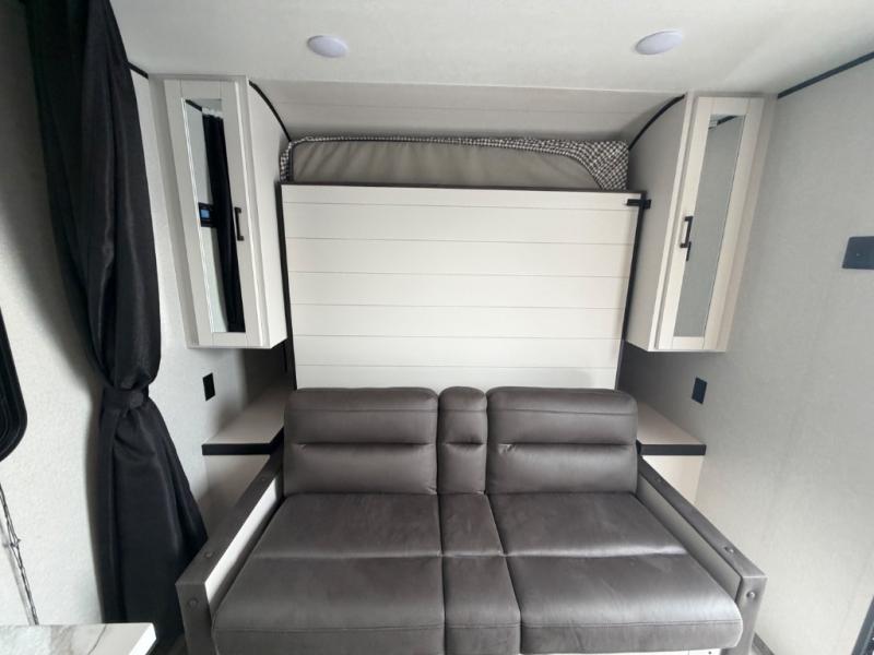 You'll love camping at the lake in this versatile travel trailer. Since there is a Murphy bed up front, you can fold it away in the morning to enjoy the Jack-knife sofa, plus there is a booth dinette for even more seating space. The microwave oven and cooktop in the kitchen allow you to make meals each day, and the 8 cu. ft. 12V refrigerator will keep perishables fresh. Your guests or the little ones are sure to love the double-size bunks, and the rear corner bath is right next to the bunks for easy nighttime use!