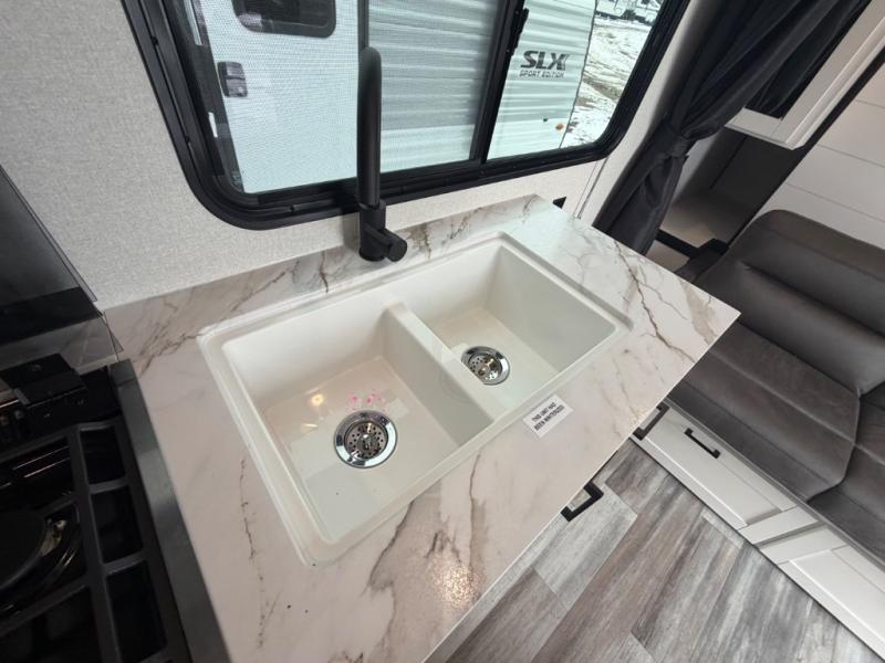 The Jayco Jay Flight SLX travel trailer is quite easy to own because it is lightweight for an easier towing experience. Built on a fully integrated A-frame with galvanized-steel, impact-resistant wheel wells, the Jay Flight SLX has quality at its very foundation. That quality continues on to the electric self-adjusting brakes, easy-lube hubs, Magnum Truss roof system, and LP quick connect. Some of what the mandatory Customer Value Package includes is backup camera prep, Keyed-Alike entry and baggage doors, and an on-demand tankless water heater.