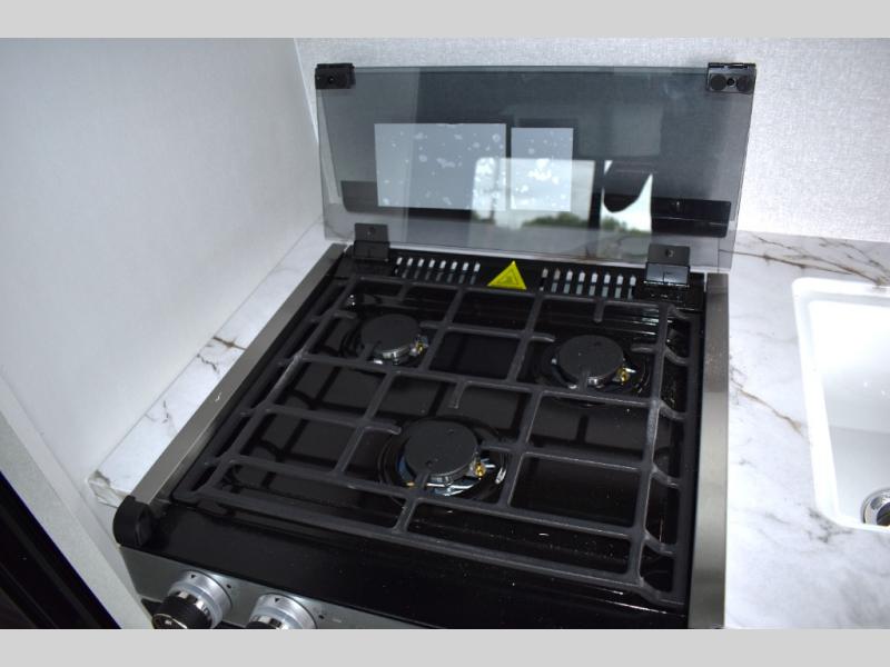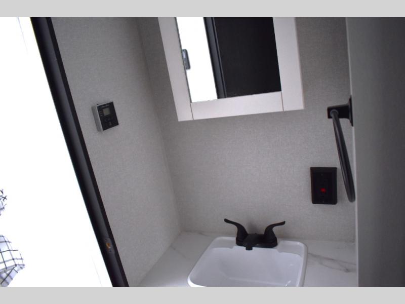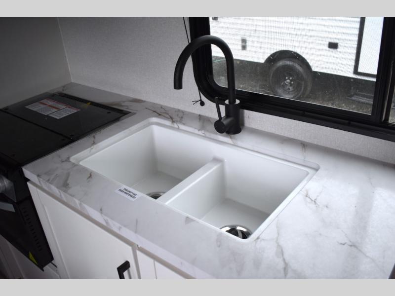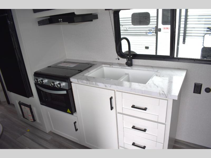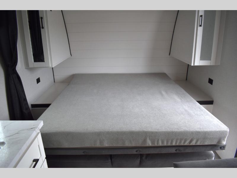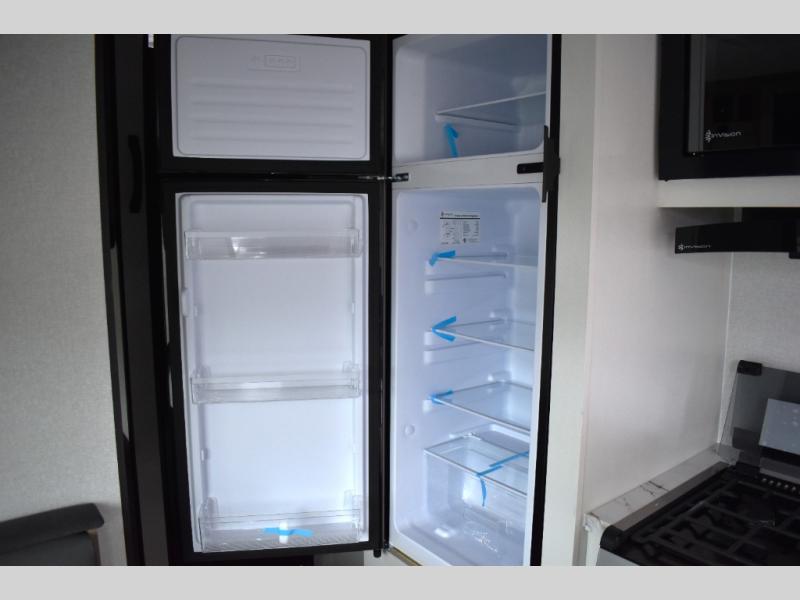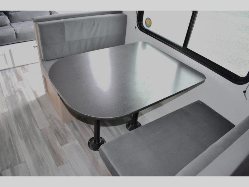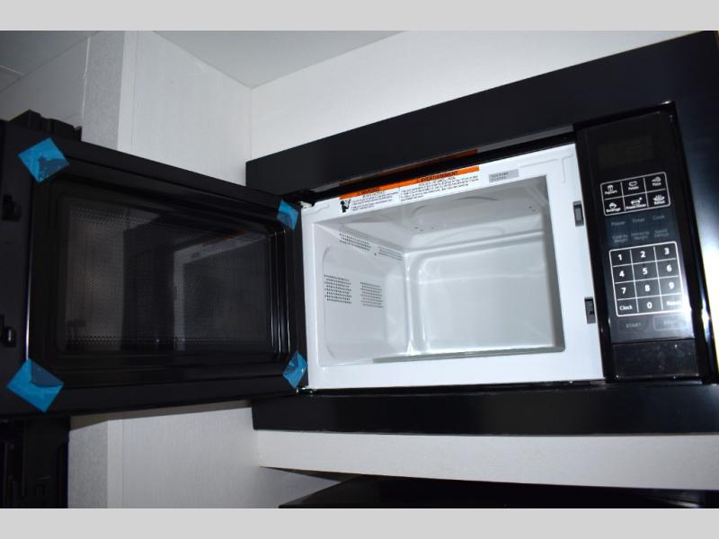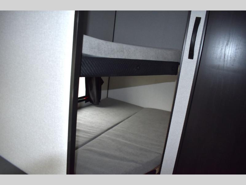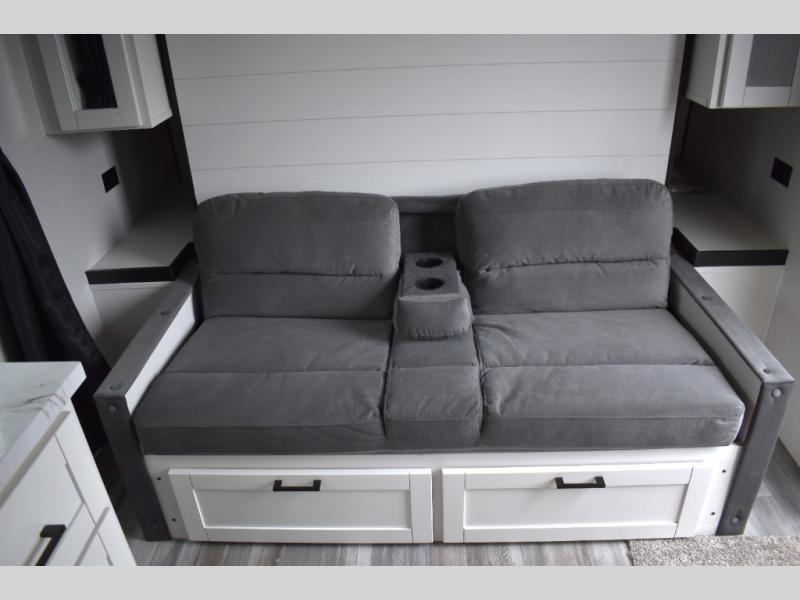 You'll love camping at the lake in this versatile travel trailer. Since there is a Murphy bed up front, you can fold it away in the morning to enjoy the Jack-knife sofa, plus there is a booth dinette for even more seating space. The microwave oven and cooktop in the kitchen allow you to make meals each day, and the 8 cu. ft. 12V refrigerator will keep perishables fresh. Your guests or the little ones are sure to love the double-size bunks, and the rear corner bath is right next to the bunks for easy nighttime use!