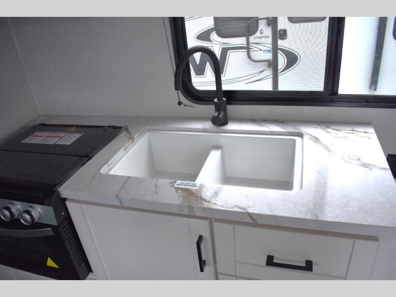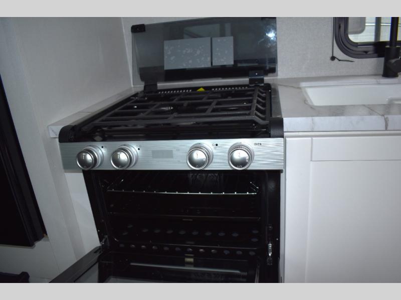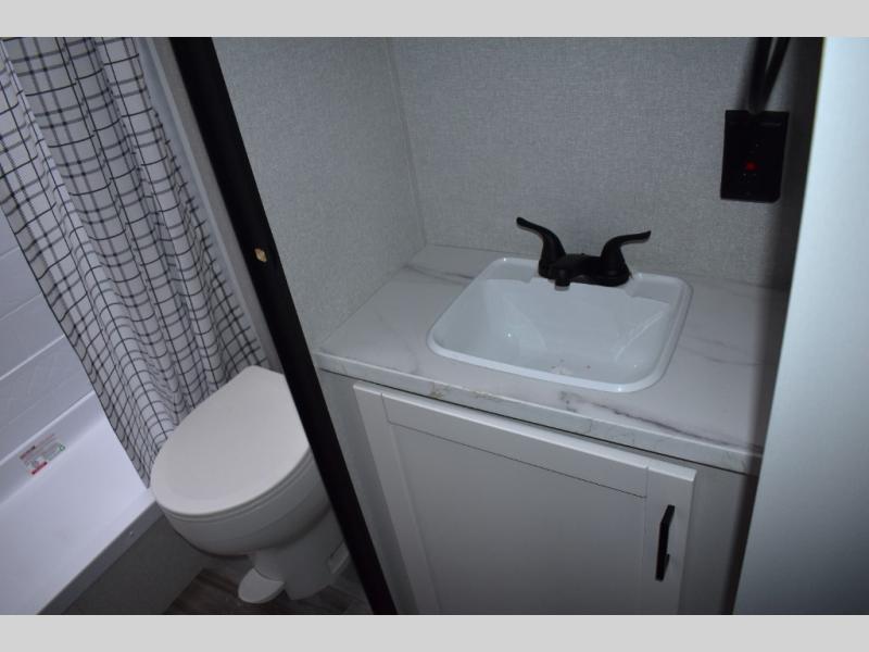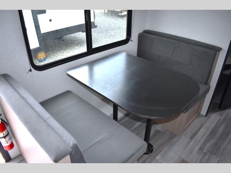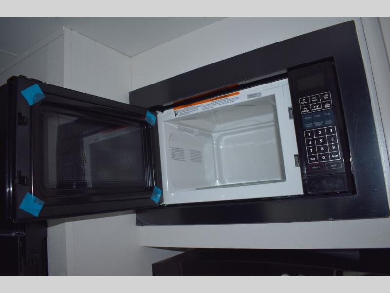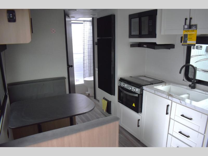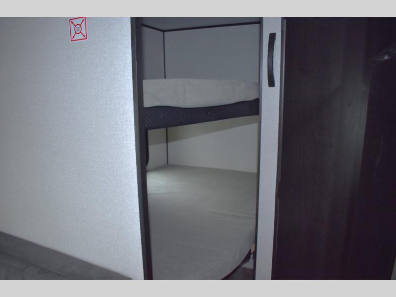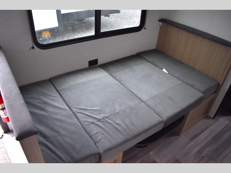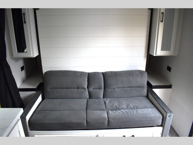 You'll love camping at the lake in this versatile travel trailer. Since there is a Murphy bed up front, you can fold it away in the morning to enjoy the Jack-knife sofa, plus there is a booth dinette for even more seating space. The microwave oven and cooktop in the kitchen allow you to make meals each day, and the 8 cu. ft. 12V refrigerator will keep perishables fresh. Your guests or the little ones are sure to love the double-size bunks, and the rear corner bath is right next to the bunks for easy nighttime use!