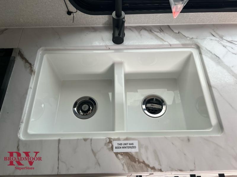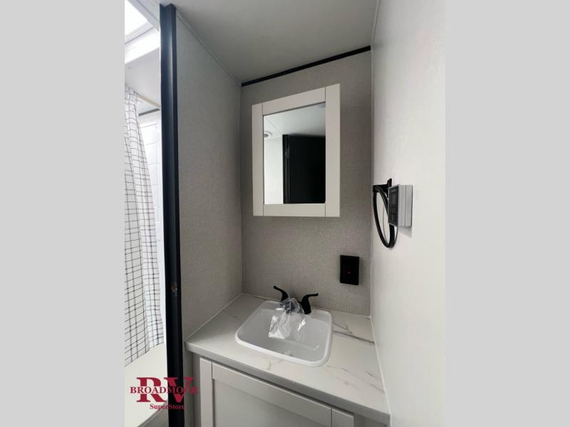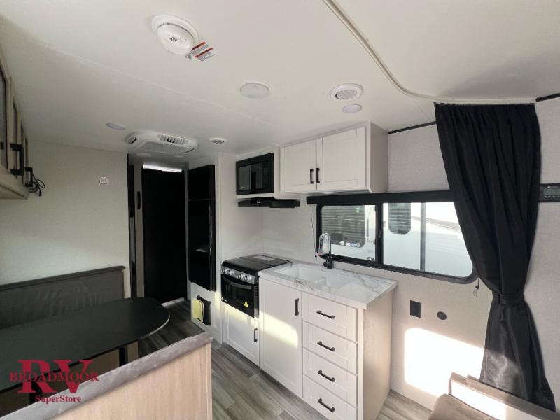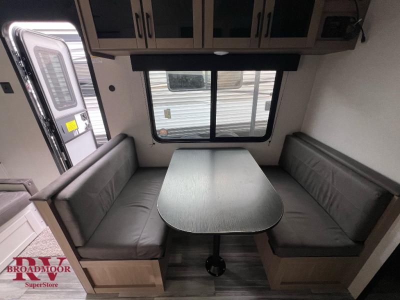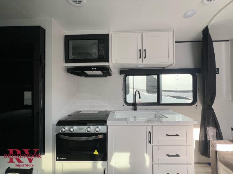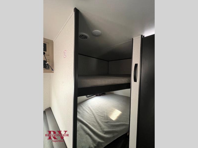 You'll love camping at the lake in this versatile travel trailer. Since there is a Murphy bed up front, you can fold it away in the morning to enjoy the Jack-knife sofa, plus there is a booth dinette for even more seating space. The microwave oven and cooktop in the kitchen allow you to make meals each day, and the 8 cu. ft. 12V refrigerator will keep perishables fresh. Your guests or the little ones are sure to love the double-size bunks, and the rear corner bath is right next to the bunks for easy nighttime use!
