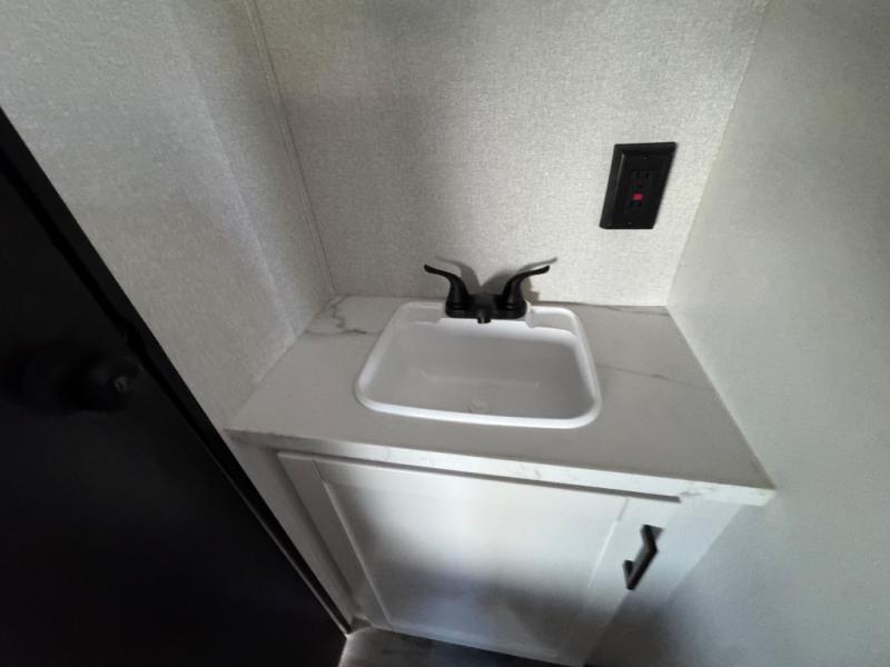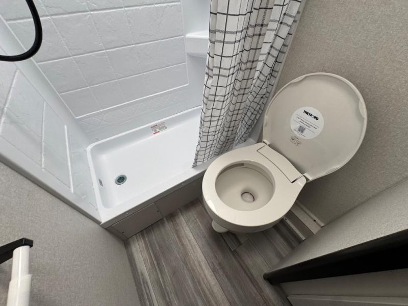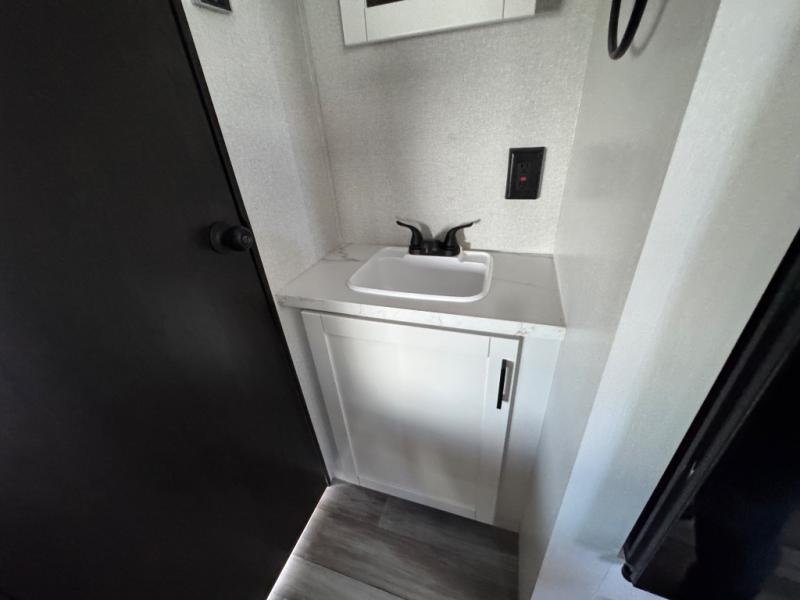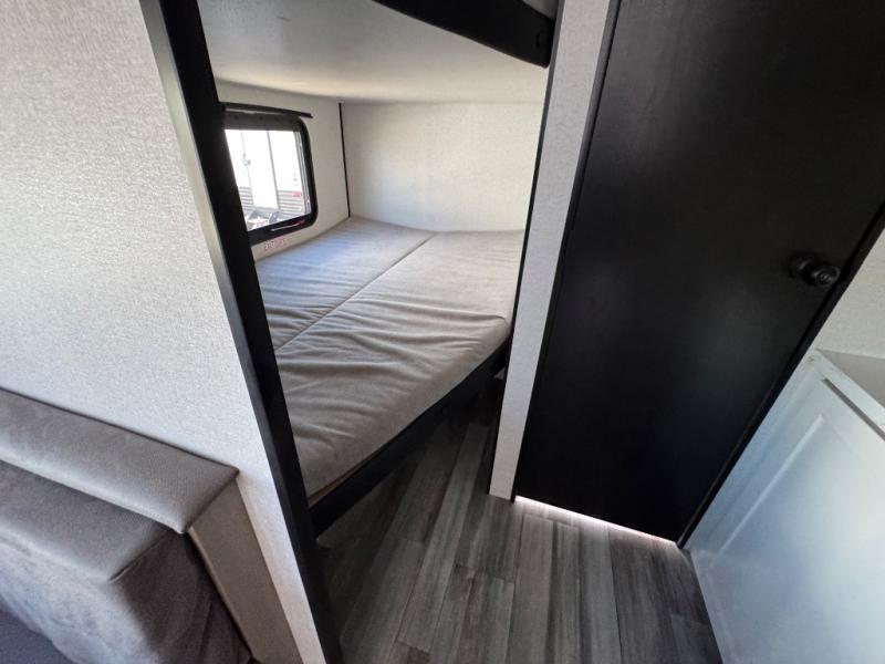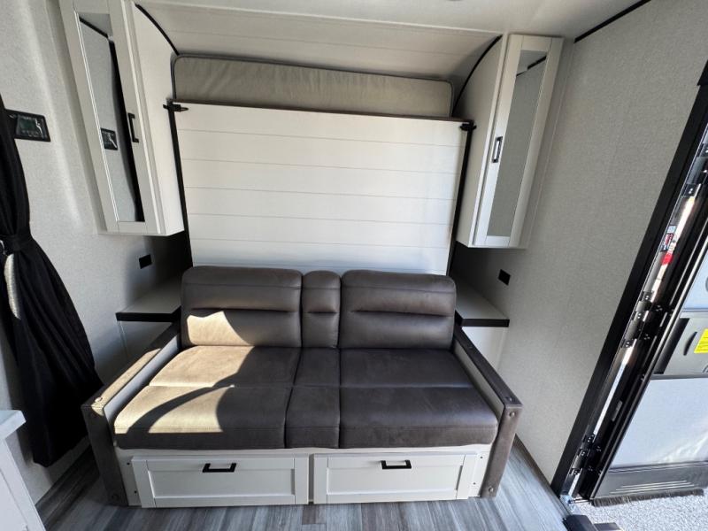 You'll love camping at the lake in this versatile travel trailer. Since there is a Murphy bed up front, you can fold it away in the morning to enjoy the Jack-knife sofa, plus there is a booth dinette for even more seating space. The microwave oven and cooktop in the kitchen allow you to make meals each day, and the 8 cu. ft. 12V refrigerator will keep perishables fresh. Your guests or the little ones are sure to love the double-size bunks, and the rear corner bath is right next to the bunks for easy nighttime use!