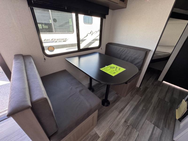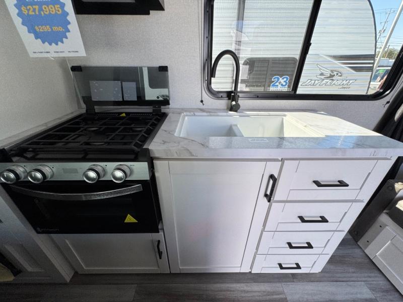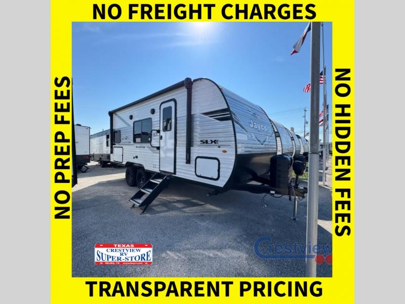 The Jayco Jay Flight SLX travel trailer is quite easy to own because it is lightweight for an easier towing experience. Built on a fully integrated A-frame with galvanized-steel, impact-resistant wheel wells, the Jay Flight SLX has quality at its very foundation. That quality continues on to the electric self-adjusting brakes, easy-lube hubs, Magnum Truss roof system, and LP quick connect. Some of what the mandatory Customer Value Package includes is backup camera prep, Keyed-Alike entry and baggage doors, and an on-demand tankless water heater.
