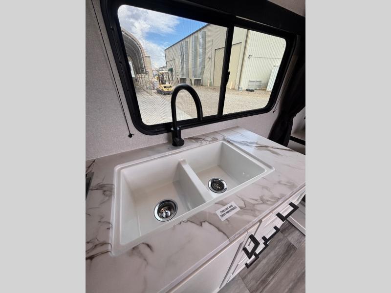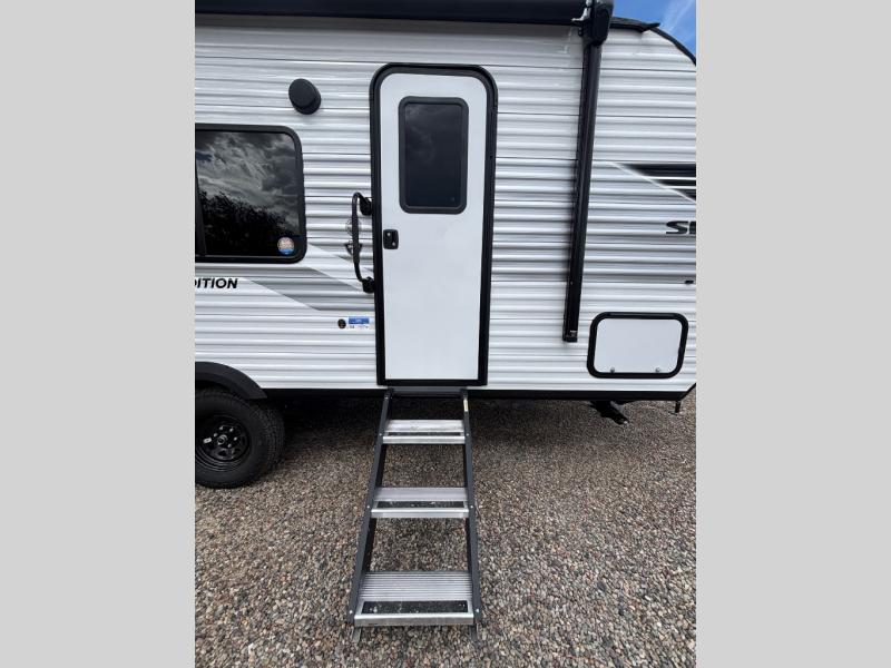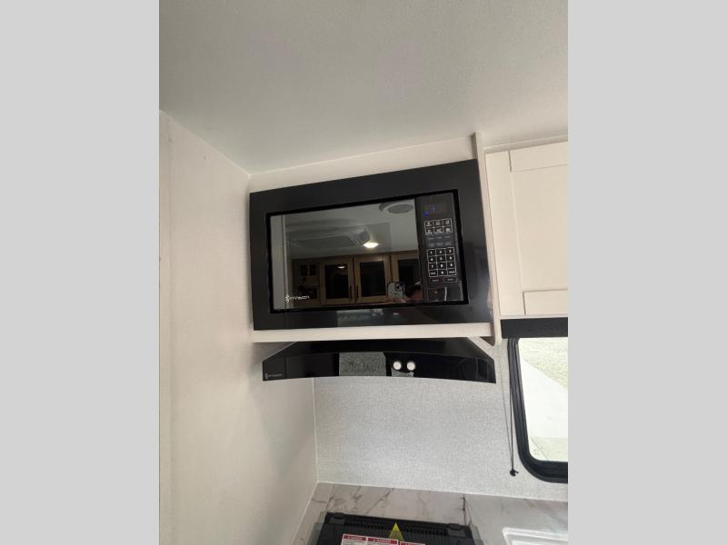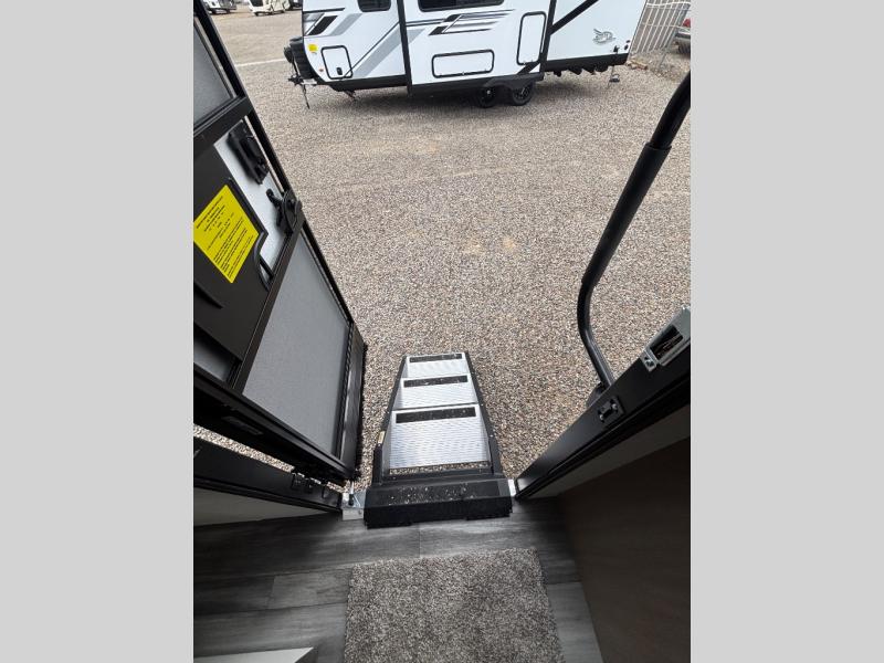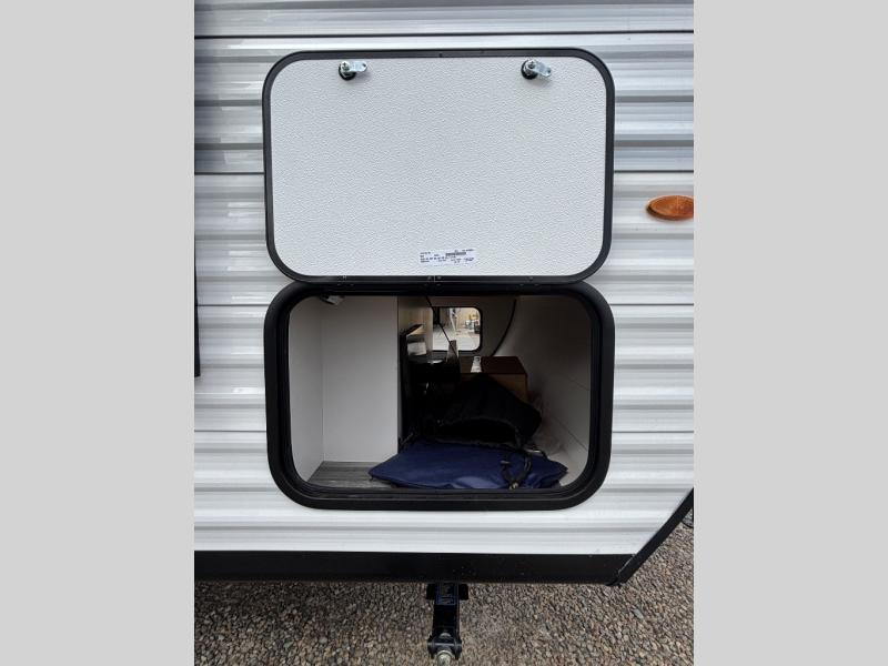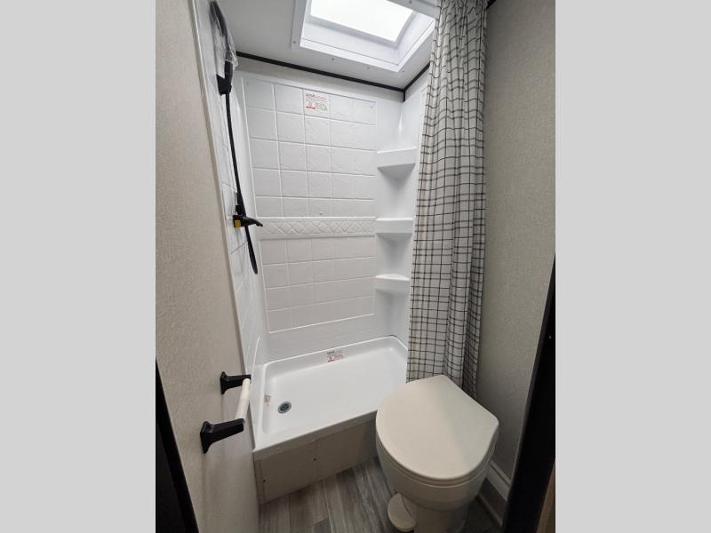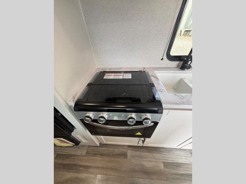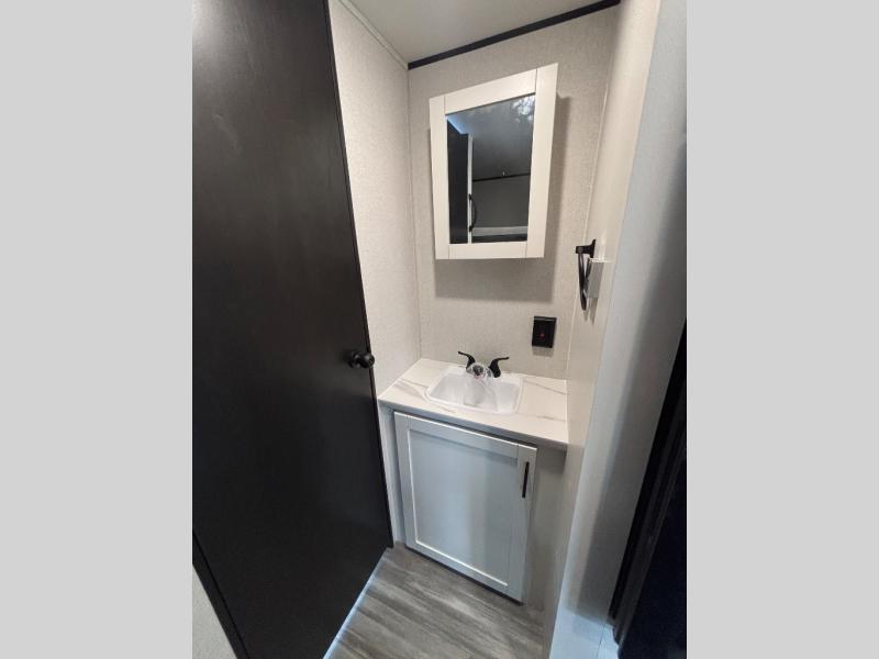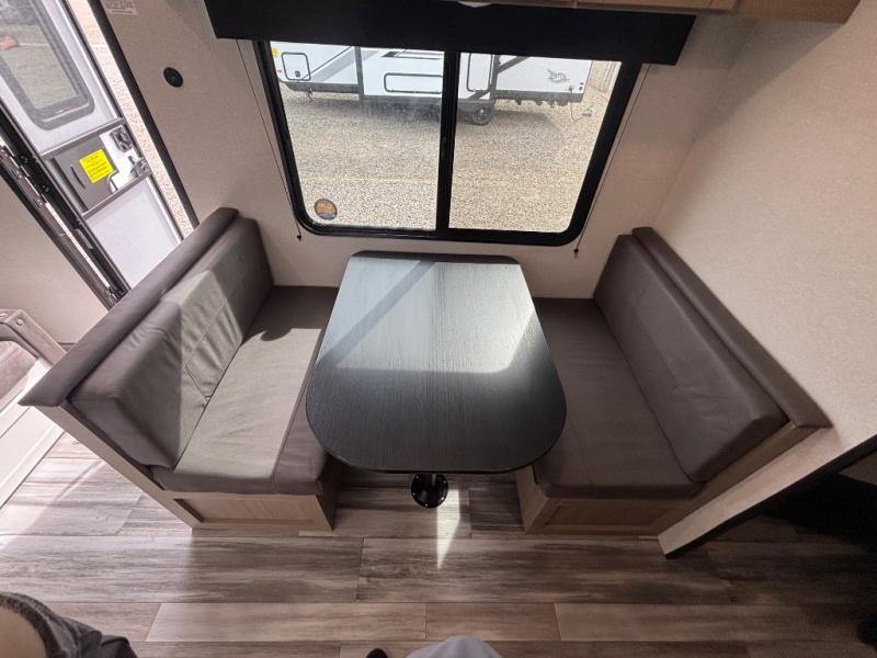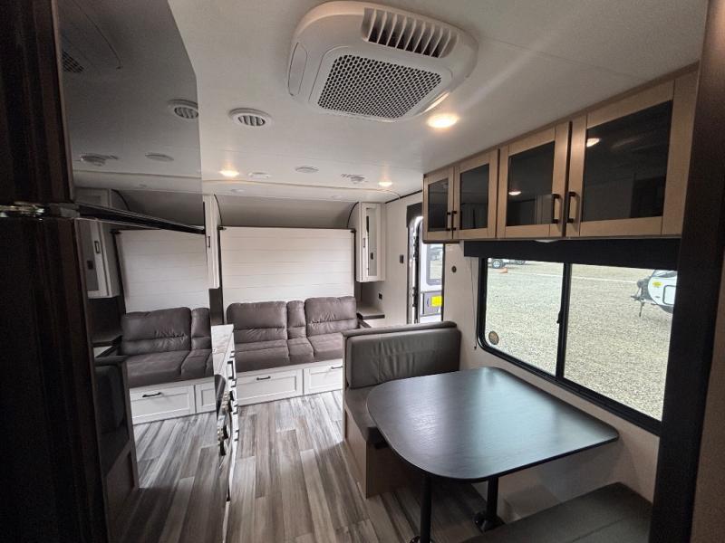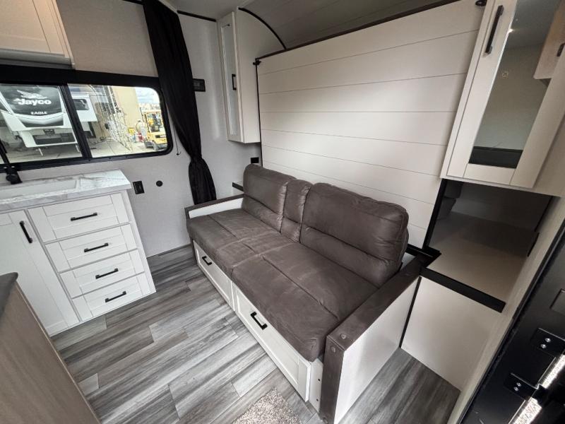 You'll love camping at the lake in this versatile travel trailer. Since there is a Murphy bed up front, you can fold it away in the morning to enjoy the Jack-knife sofa, plus there is a booth dinette for even more seating space. The microwave oven and cooktop in the kitchen allow you to make meals each day, and the 8 cu. ft. 12V refrigerator will keep perishables fresh. Your guests or the little ones are sure to love the double-size bunks, and the rear corner bath is right next to the bunks for easy nighttime use!