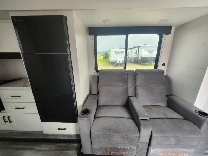 You will have a comfortable camping trip in this travel trailer! It offers full kitchen amenities including a pantry for snacks and such, plus a full rear corner bathroom for privacy and includes a shower. When you need a break, the semi-private bedroom up front offers a queen bed, dual wardrobes and a curtain to close, and the booth dinette can transform into a sleeping space as well. There is a 18' power awning with LED lights for you to enjoy this outdoor space into the night, plus exterior storage for your outdoor games and gear.