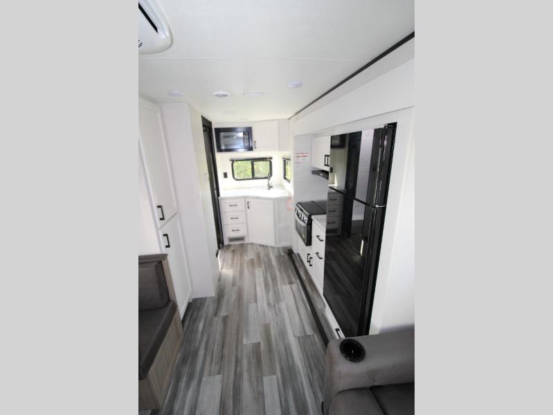 You will have a comfortable camping trip in this travel trailer! It offers full kitchen amenities including a pantry for snacks and such, plus a full rear corner bathroom for privacy and includes a shower. When you need a break, the semi-private bedroom up front offers a queen bed, dual wardrobes and a curtain to close, and the booth dinette can transform into a sleeping space as well. There is a 18' power awning with LED lights for you to enjoy this outdoor space into the night, plus exterior storage for your outdoor games and gear.